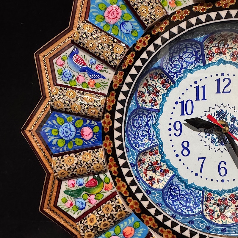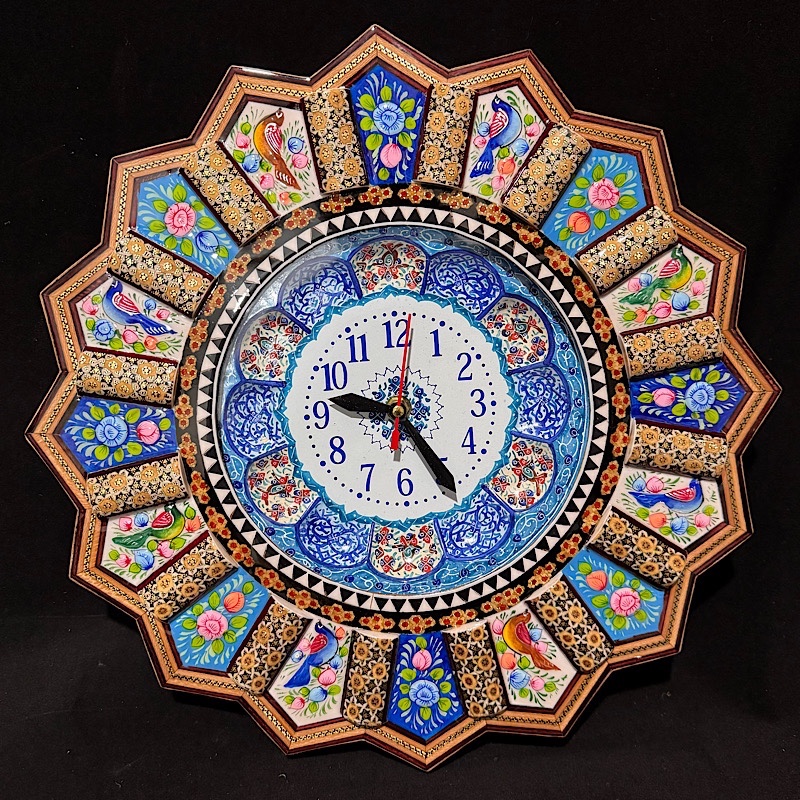 ساعت دیواری خاتم کاری ریز گل و مرغ (برجسته) خورشیدی به همراه صفحه میناکاری شده قل دار(ساده نیست) هردو بهترین لعاب رنگ را دارا هستند، قطر کامل این ساعت دیواری 42سانتی متر است بر روی کل کار پس از خاتم کاری، سه لایه پلی استر زنی شده تا جلوه و دوام کار دو چندان گردد.