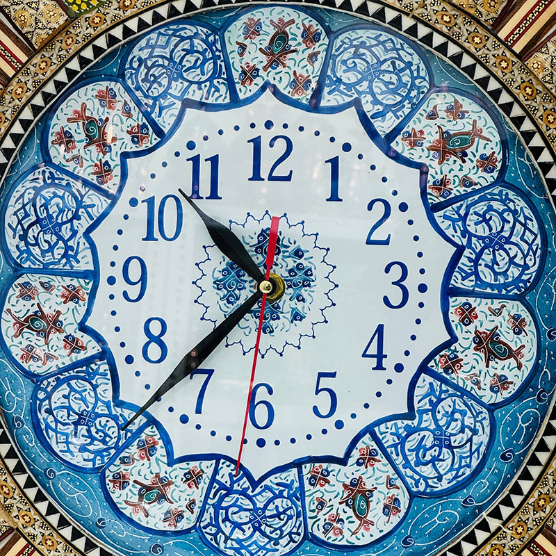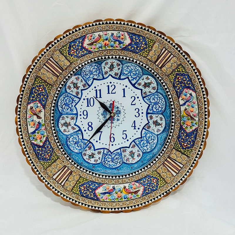 ساعت دیواری خاتم کاری گل و مرغ به همراه صفحه میناکاری شده قل دار(ساده نیست) ، قطر صفحه داخلی این ساعت 25سانتی متر و قطر کامل این ساعت دیواری 42سانتی متر است بر روی کل کار پس از خاتم کاری، سه لایه پلی استر زنی شده تا جلوه و دوام کار دو چندان گردد.
