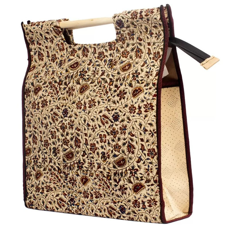 این ساک دستی بزرگ قلمکار از جنس پارچه کتان و با چاپ دستی توسط مهر های چوبی و نقوش سنتی ایرانی تولید می گردد که در بازار هدایای تبلیغاتی مرسوم گشته است. ثبات رنگ و جنس محکم برای حمل اجناس با وزن بالا و جادار بودن از ویژگی های بارز این ساک دستی کادویی بزرگ زیپ دار به حساب می آید.