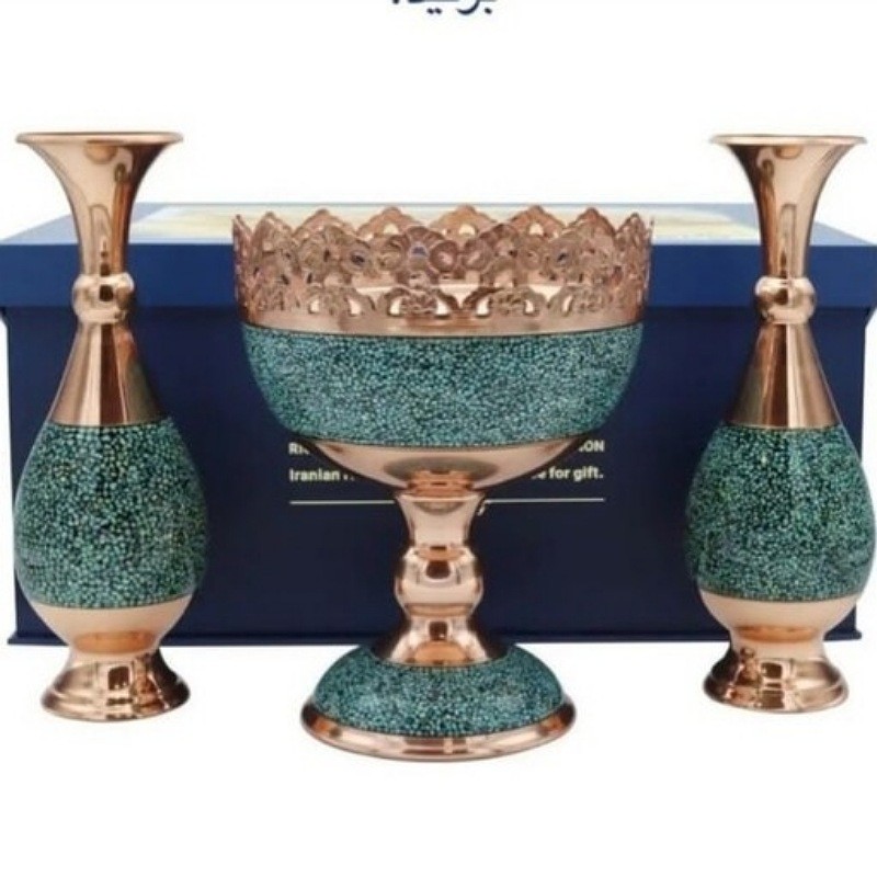 مقدار:1100 گرم سایر توضیحات:ارتفاع آجیل خوری 16، ارتفاع گلدان ها 20 جنس:مس و فیروزه