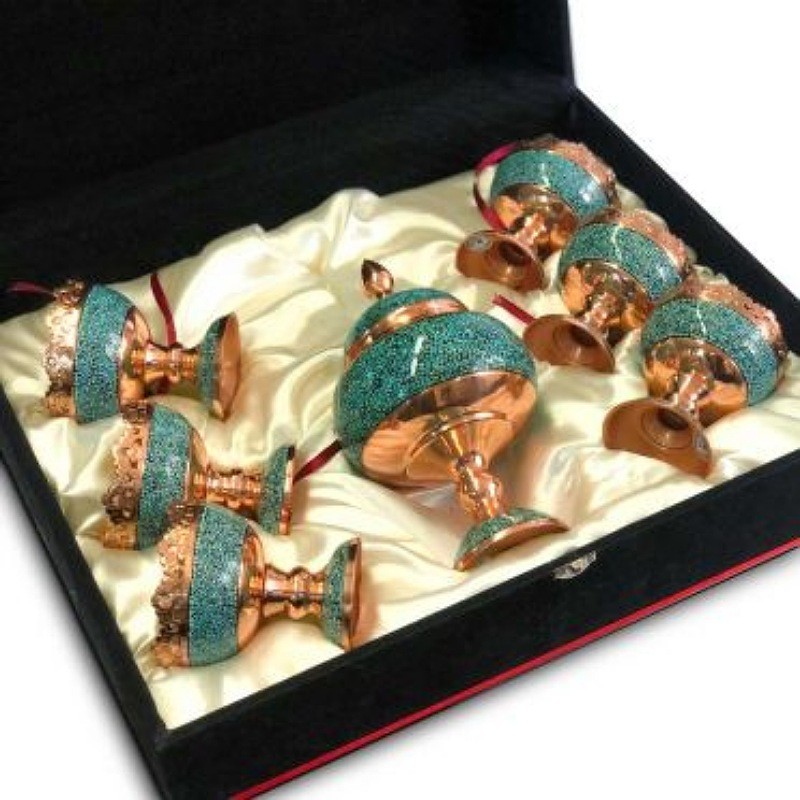 ست آجیل خوری و شکلات خوری فیروزه کوبی شامل 6 عدد آجیل خوری فیروه کوب با ارتفاع 13 سانتی و یک عدد شکلات خوری پایه دار 25 سانتی می باشد که داخل یک جعبه مخمل فوق العاده شیک چیدمان شده است . این ست به عنوان هدایای مدیریتی نفیس گزینه بسیار مناسبی است، زیرا علاوه بر زیبایی و ارزشمند بودن آن بسیار کاربردی است و می تواند بر روی میزکار و یا در جلسات کاری به عنوان یک هنر ایرانی نظر هر بیننده ای را جلب نماید.