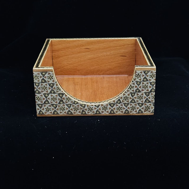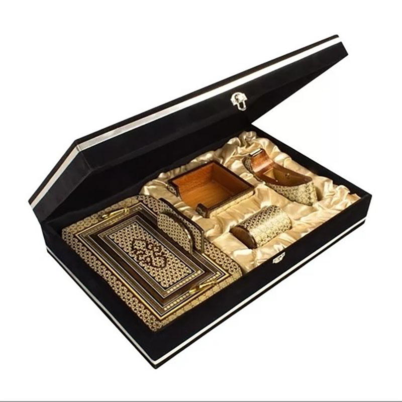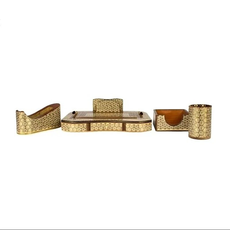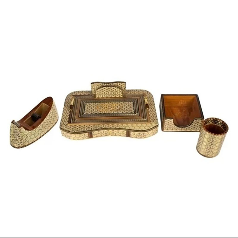 ست مورد نظر 4 تیکه هست و شامل : پایه چسب رومیزی چوبی خاتم کاری با ابعاد 8.5*7.5*19 سانتی مترو جاقلمی بزرگ کشویی خاتم کاری 13در18سانتیمتری جاکاغذی خاتم کاری با ابعاد 5*11.5*11.5 سانتی متر و قلمدان لیوانی خاتم کاری هست.