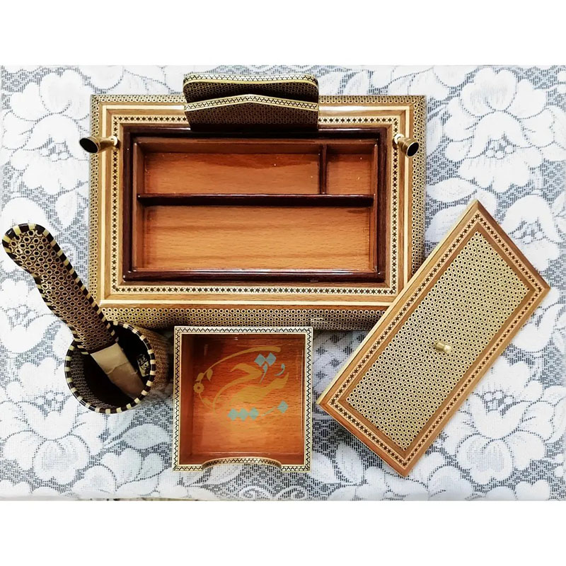 برای یک مدیر ،پزشک، وکیل ،استاد دانشگاه و حتی کارمند داشتن میزی منظم با وسایلی کاربردی و خاص، امری ضروری است. با این ست نفیس خاتم کاری ، میز خود را سر و سامان بدهید و با هر بار استفاده از آن لذت ببرید. این ست اداری خاتم کاری شامل جاقلمی بزرگ درب دار ، جاکاغذی ، قلمدان لیوانی و کارد کاغذبری از نوع خاتم سیمی (مرغوب ترین نوع خاتم) می باشد.