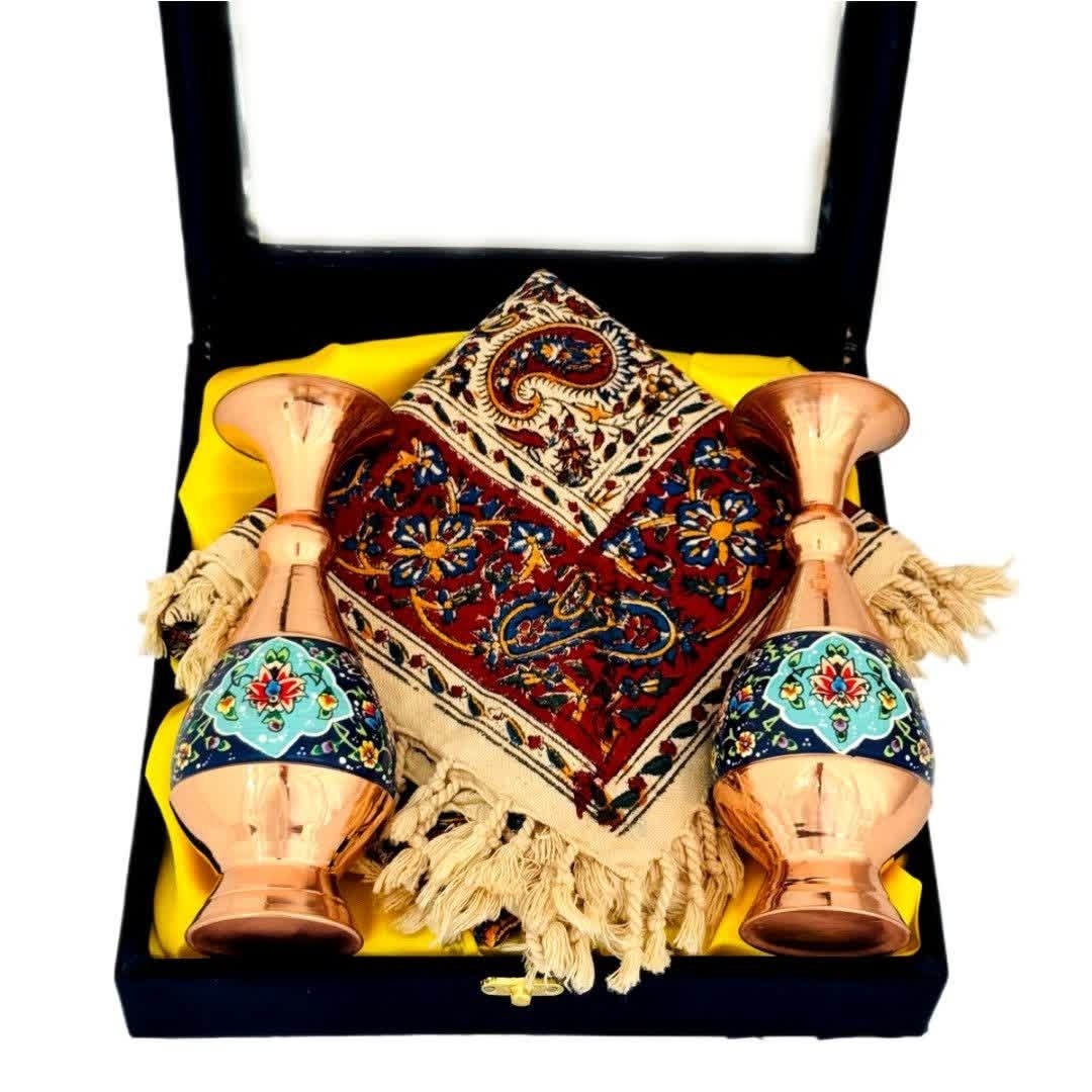 نکته : قیمت این محصول به همراه جعبه مخمل دستساز که درب آن شیشه ای است ارائه شده است . همنشینی دو رنگ متضاد زیبای مس در کنار آبی لاجوردی و فیروزه ای باعث چشم نوازی این گلدان مسی و نقاشی های روی آن شده است. فلز مس مورد استفاده در این گلدان ضخامت بالا و مناسبی دارد و به شکل نهایی محصول جلوه خاصی بخشیده است. این گلدان مسی نقاشی دارای لایهای محافظ با پلیاستر است که علاوه بر پوششدهی مناسب سطح مس و جلوگیری از اکسید و سیاه شدن، مقاومت آن را نیز بالا برده است. “مس و پرداز ” یک نوآوری در زمینه صنایع دستی می باشد که قسمتی از بدنه مسی محصول، نقاشی شده و جلوه زیبایی به آن می بخشد. جنس بدنه این ظروف از فلز مس است. برای ساخت قسمتی از ظرف و نه تمام بدنه، با رنگهای فیروزه ای و لاجوردی توسط هنرمند ماهر با گل های سنتی شاه عباسی که یادآور فرهنگ اصیل ایرانی است، نقاشی میشود.