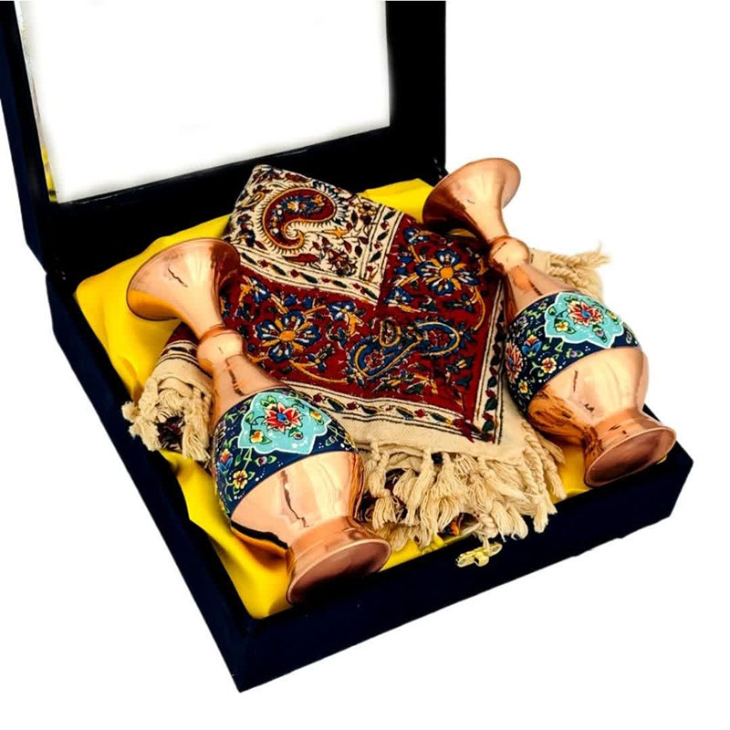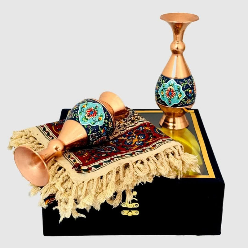 نکته : قیمت این محصول به همراه جعبه مخمل دستساز که درب آن شیشه ای است ارائه شده است . همنشینی دو رنگ متضاد زیبای مس در کنار آبی لاجوردی و فیروزه ای باعث چشم نوازی این گلدان مسی و نقاشی های روی آن شده است. فلز مس مورد استفاده در این گلدان ضخامت بالا و مناسبی دارد و به شکل نهایی محصول جلوه خاصی بخشیده است. این گلدان مسی نقاشی دارای لایه‌ای محافظ با پلی‌استر است که علاوه بر پوشش‌دهی مناسب سطح مس و جلوگیری از اکسید و سیاه شدن، مقاومت آن را نیز بالا برده است. “مس و پرداز ” یک نوآوری در زمینه صنایع دستی می باشد که قسمتی از بدنه مسی محصول، نقاشی شده و جلوه زیبایی به آن می بخشد. جنس بدنه این ظروف از فلز مس است. برای ساخت قسمتی از ظرف و نه تمام بدنه، با رنگ‌های فیروزه ای و لاجوردی توسط هنرمند ماهر با گل های سنتی شاه عباسی که یادآور فرهنگ اصیل ایرانی است، نقاشی می‌شود.