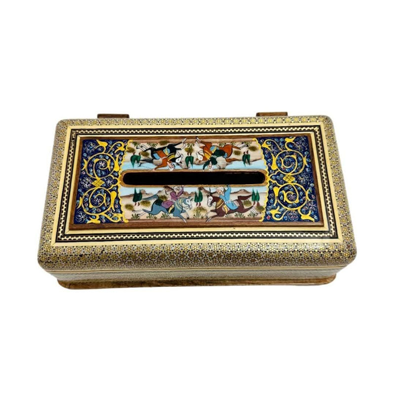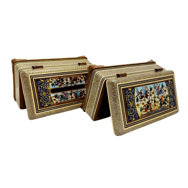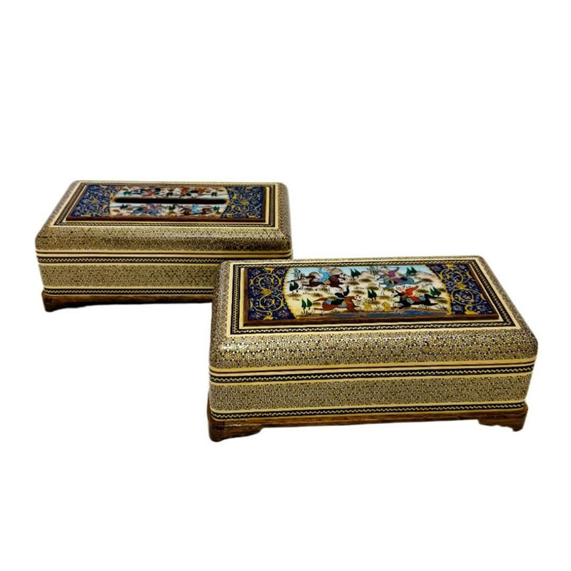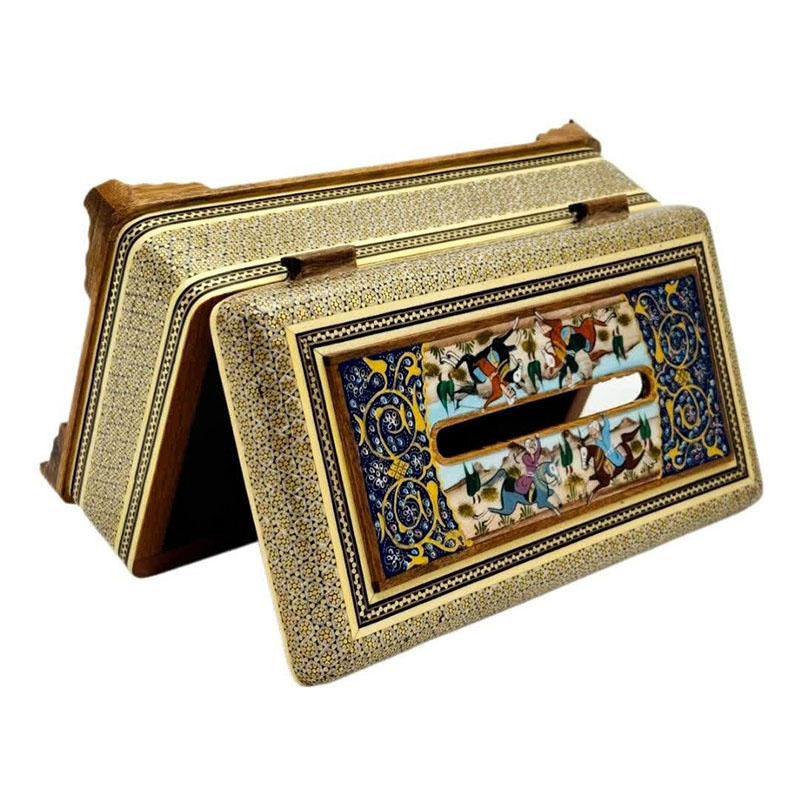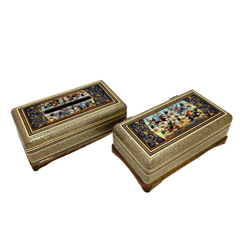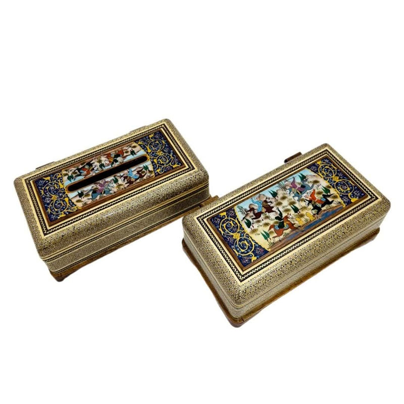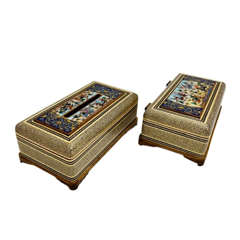 ⚜️ست جعبه دستمال کاغذی و جاکاردی اصفهان را می توان پرطرفدار ترین محصول صنایع دستی خاتم سازی اصفهان نام برد. شما می توانید برای زیباتر نشان دادن جعبه های دستمال کلینکس از جادستمال کاغذی خاتم کاری استفاده کنید. ⚜️جعبه دستمال خاتم کاری یکی از نمادهای هنر استادکاران خاتم ساز اصفهان است. جا دستمال خاتم کاری موردهای استفاده زیادی در منازل و دفاتر کار دارد.از این رو برای هدیه به دوستان و اقوام و یا حتی هدایای تبلیغاتی خاتم کاری صنایع دستی گزینه مناسبی است. ⚜️قیمت جعبه دستمال خاتم مناسب و خرید آن از سراسر کشور امکان پذیر است. هنر خاتم کاری اصفهان و خاتم کاری شیراز از شناخته شده ترین هنرهای دستی ایرانی محسوب می گردند که علاقه مندان زیادی در داخل و خارج کشور دارند.