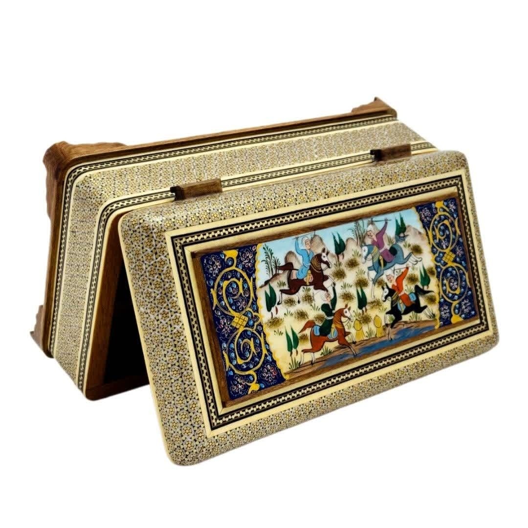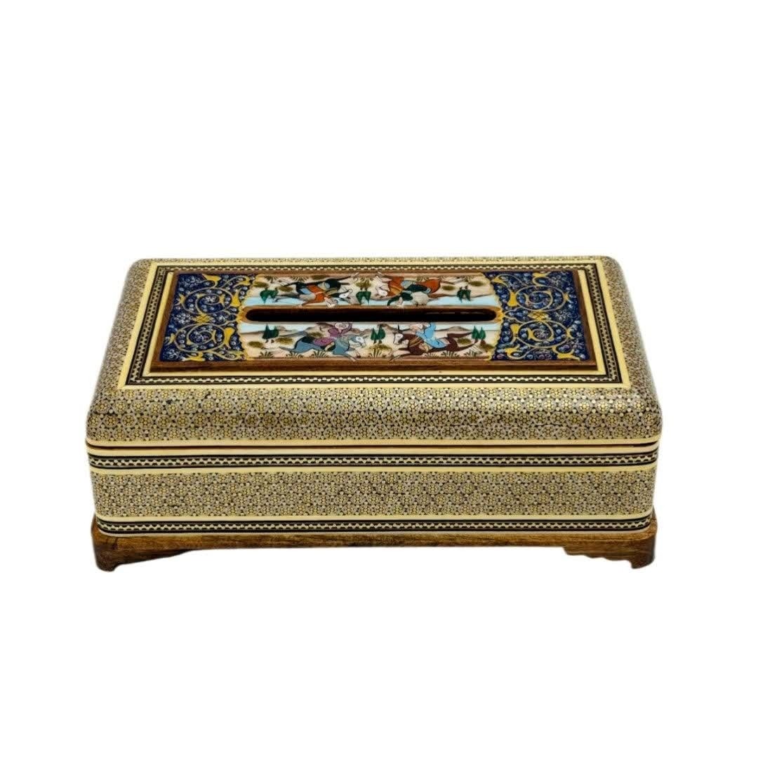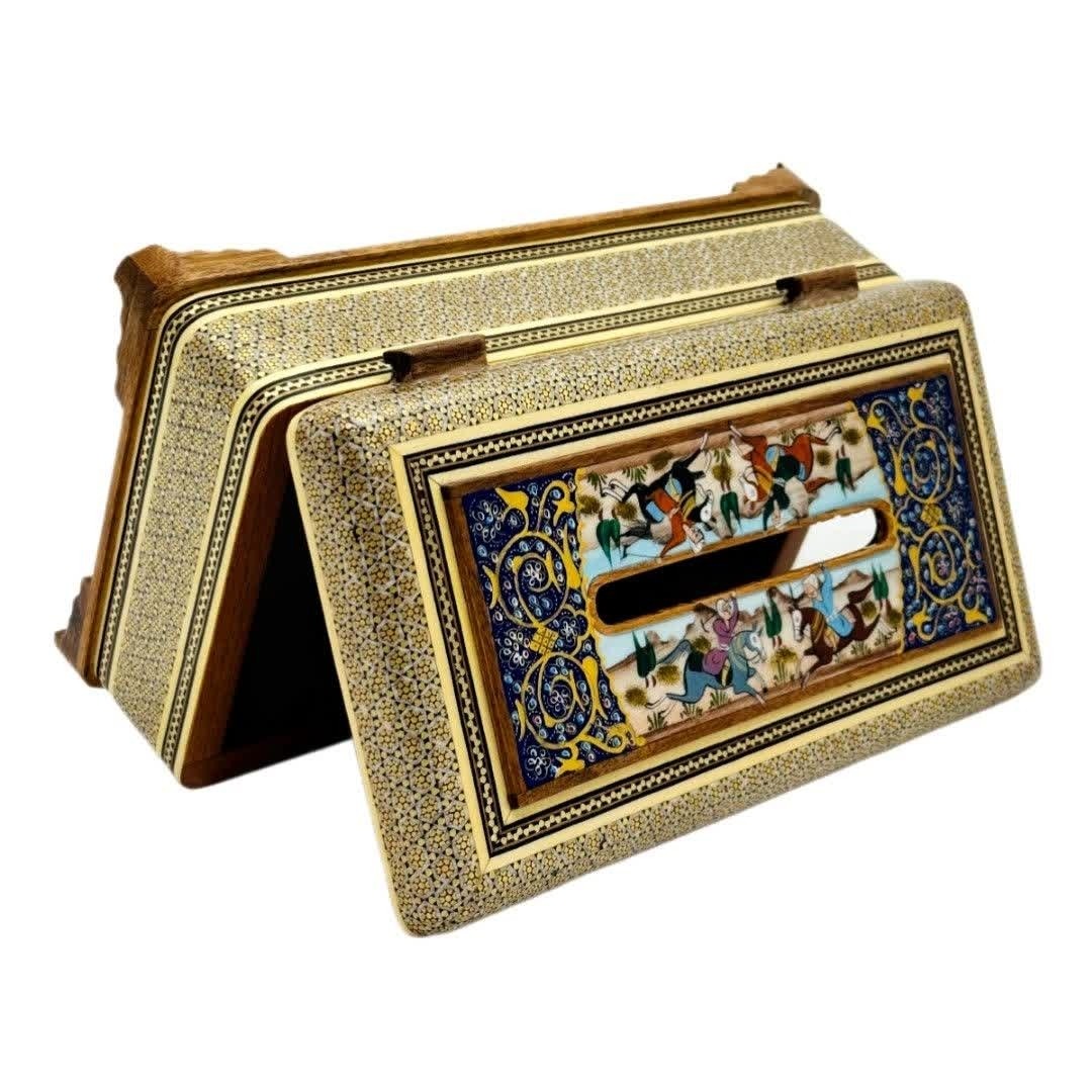 ⚜️ست جعبه دستمال کاغذی و جاکاردی اصفهان را می توان پرطرفدار ترین محصول صنایع دستی خاتم سازی اصفهان نام برد. شما می توانید برای زیباتر نشان دادن جعبه های دستمال کلینکس از جادستمال کاغذی خاتم کاری استفاده کنید. ⚜️جعبه دستمال خاتم کاری یکی از نمادهای هنر استادکاران خاتم ساز اصفهان است. جا دستمال خاتم کاری موردهای استفاده زیادی در منازل و دفاتر کار دارد.از این رو برای هدیه به دوستان و اقوام و یا حتی هدایای تبلیغاتی خاتم کاری صنایع دستی گزینه مناسبی است. ⚜️قیمت جعبه دستمال خاتم مناسب و خرید آن از سراسر کشور امکان پذیر است. هنر خاتم کاری اصفهان و خاتم کاری شیراز از شناخته شده ترین هنرهای دستی ایرانی محسوب می گردند که علاقه مندان زیادی در داخل و خارج کشور دارند. وزن خالص:3000 گرم ابعاد:14در26 سانتی متر ⚜️ست جعبه دستمال و کارد خاتم کاری محصولی زیبا و چشم نواز تولید شده در صنایع دستی بُته چی⚜️ست جا دستمالی خاتم یکی دیگر از زیباترین محصولات خاتم کاری در بازار است.⚜️این محصول دارای وزن 850 گرم بوده و هردو در اندازه 10*14*26 سانتی متر تولید شده است.⚜️جنس این ست زیبا از چوب راش بوده که همانگونه که در تصویر نیز مشاهده میکنید از هنر خاتم کاری برای تزیین آن استفاده شده است.⚜️ درب هردو به صورت لولایی است.⚜️ترکیب رنگ های مختلف به کار رفته در ساخت این محصول سبب شده تا یکی از بهترین محصولات چوبی و خاتم در بازار به شمار برود.