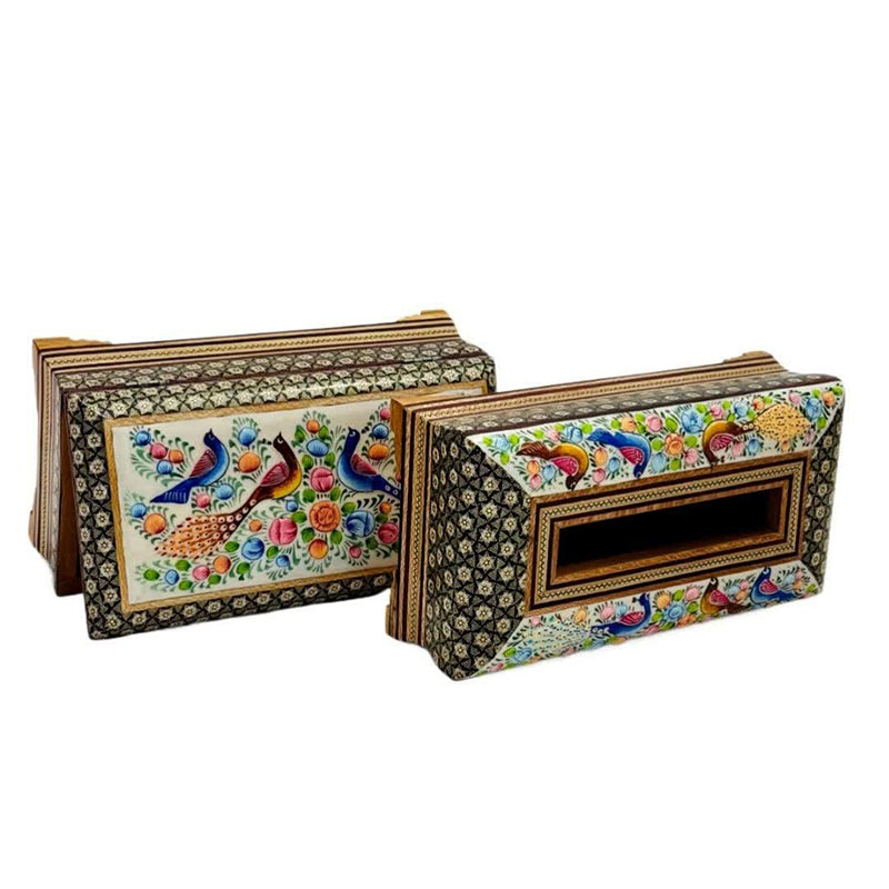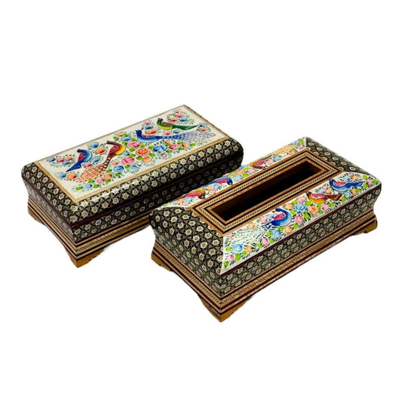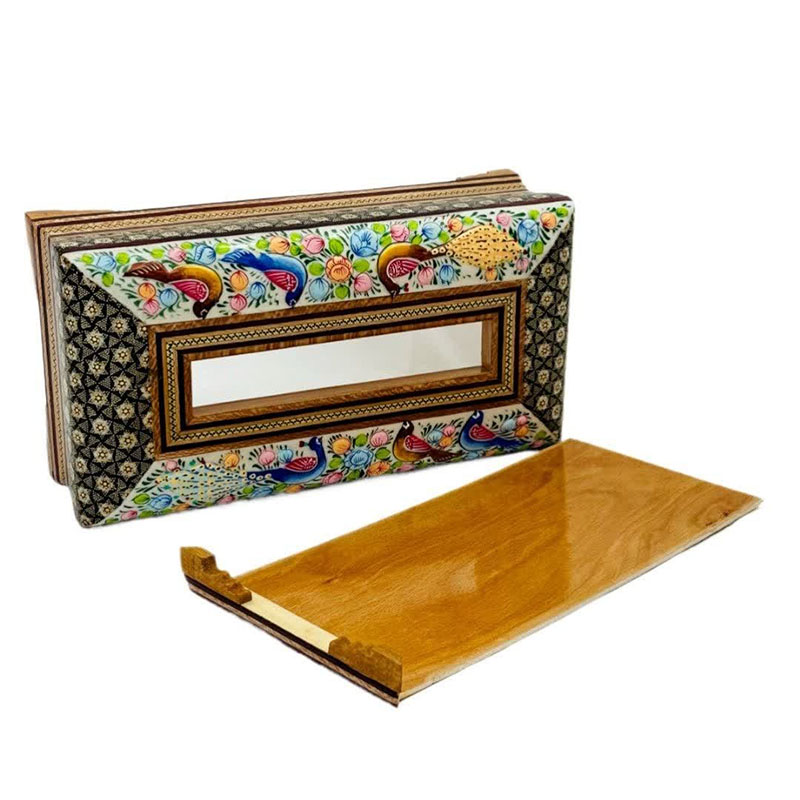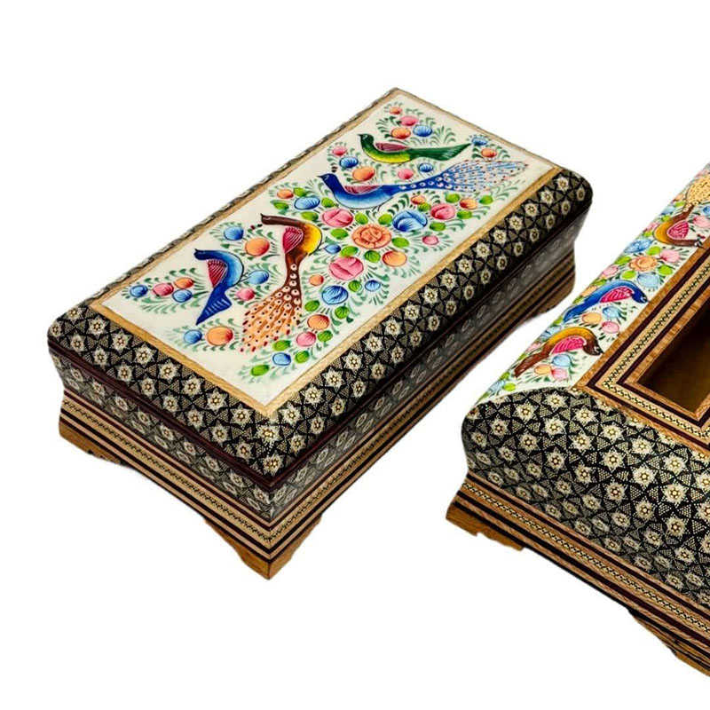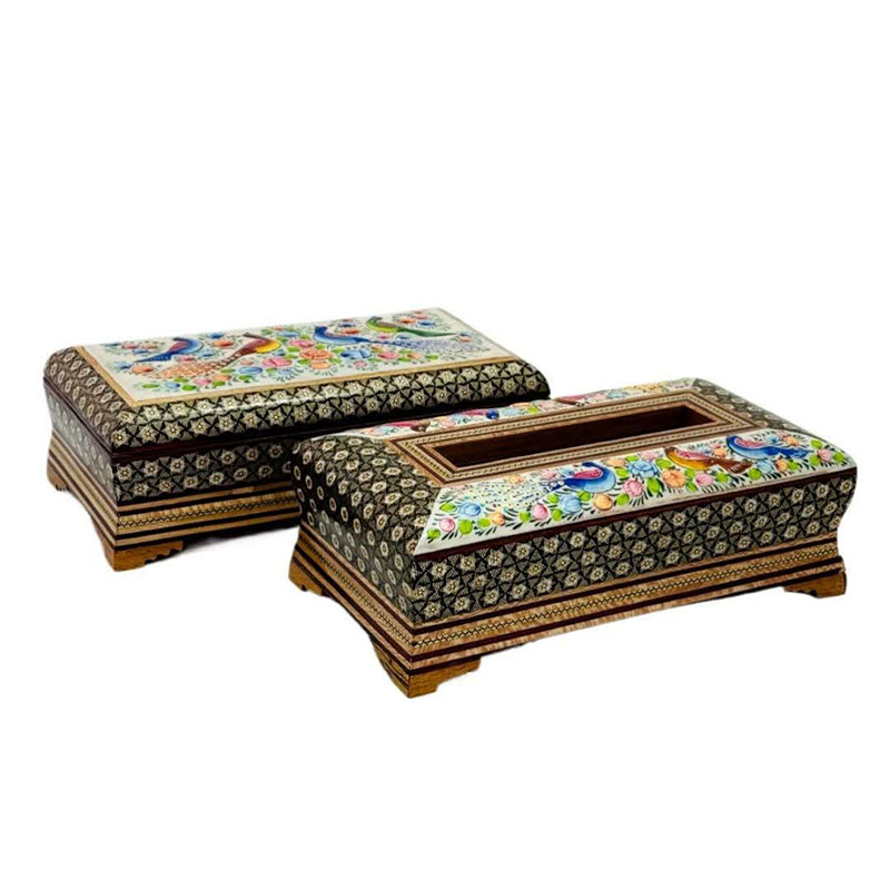 ست جعبه دستمال کاغذی و جاکاردی خاتم کاری مدل گل و مرغ اعلا