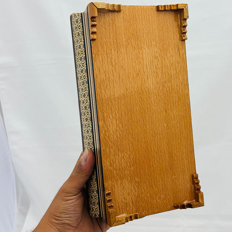⚜️ست جعبه دستمال و کارد خاتم کاری محصولی زیبا و چشم نواز تولید شده در صنایع دستی بُته چی ⚜️ست جا دستمالی خاتم یکی دیگر از زیباترین محصولات خاتم کاری در بازار است. ⚜️این محصول دارای وزن 850 گرم بوده و هردو در اندازه ۱۰*۱۴*۲۶ سانتی متر تولید شده است. ⚜️جنس این ست زیبا از چوب راش بوده که همانگونه که در تصویر نیز مشاهده میکنید از هنر خاتم کاری برای تزیین آن استفاده شده است. ⚜️ درب جاکاردی به صورت لولایی و جادستمالی به صورت کشویی است. ⚜️ترکیب رنگ های مختلف به کار رفته در ساخت این محصول سبب شده تا یکی از بهترین محصولات چوبی و خاتم در بازار به شمار برود.