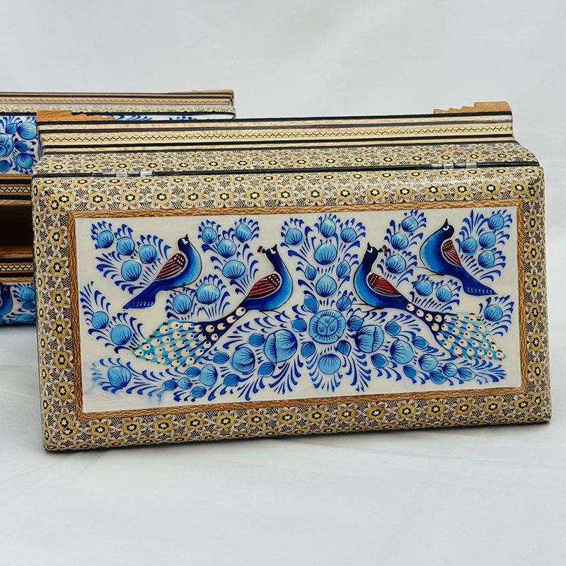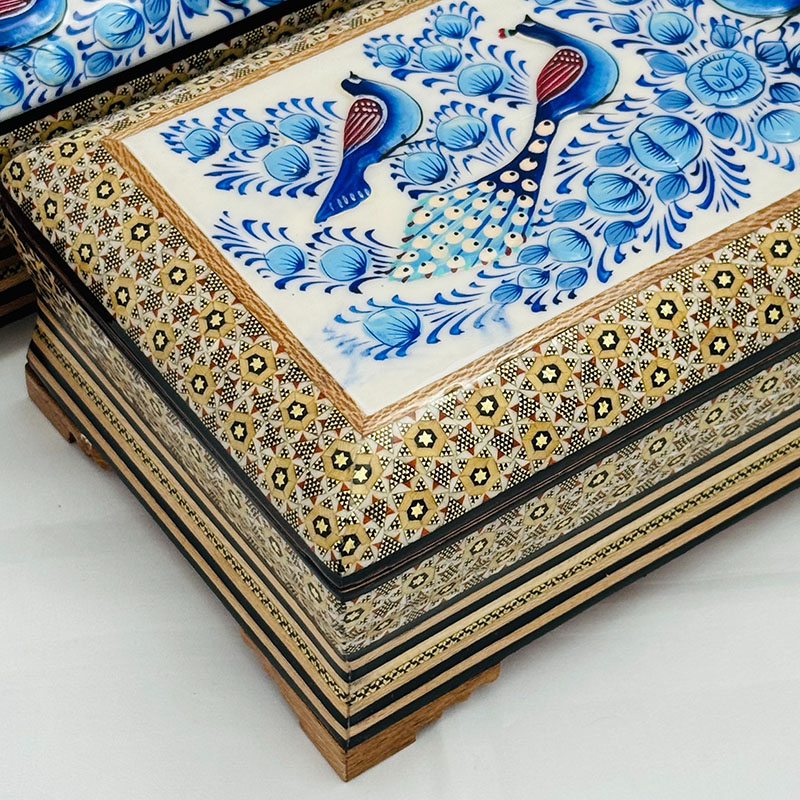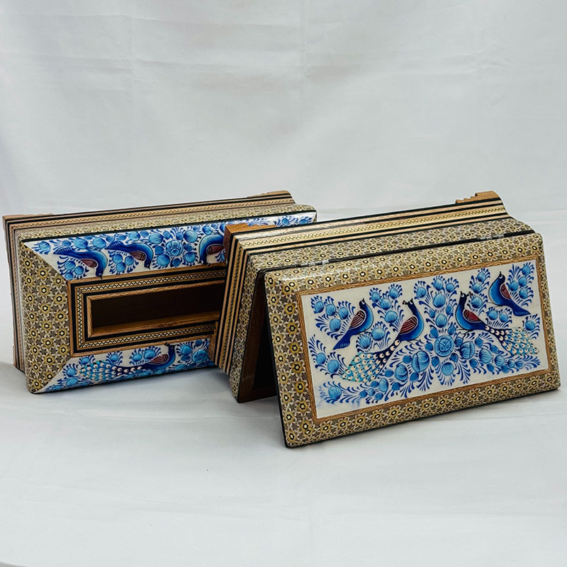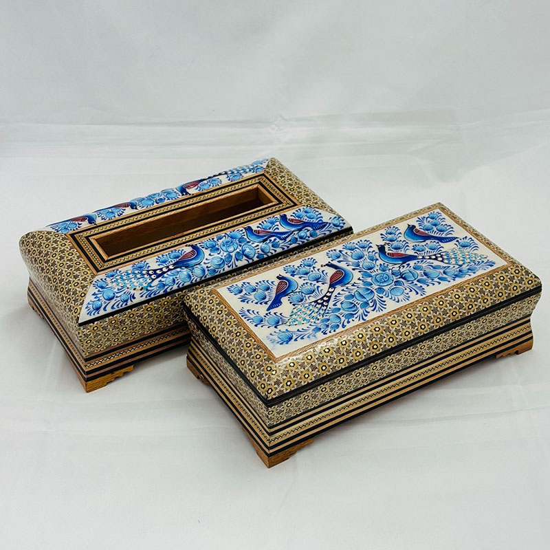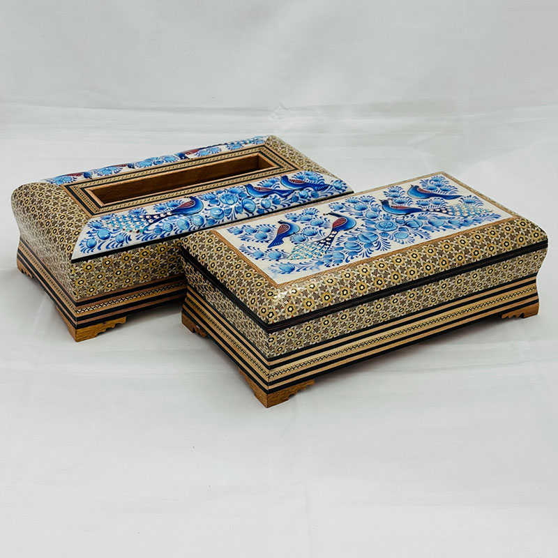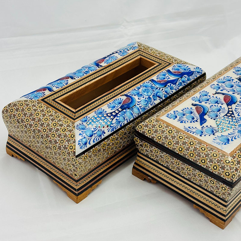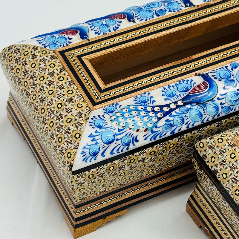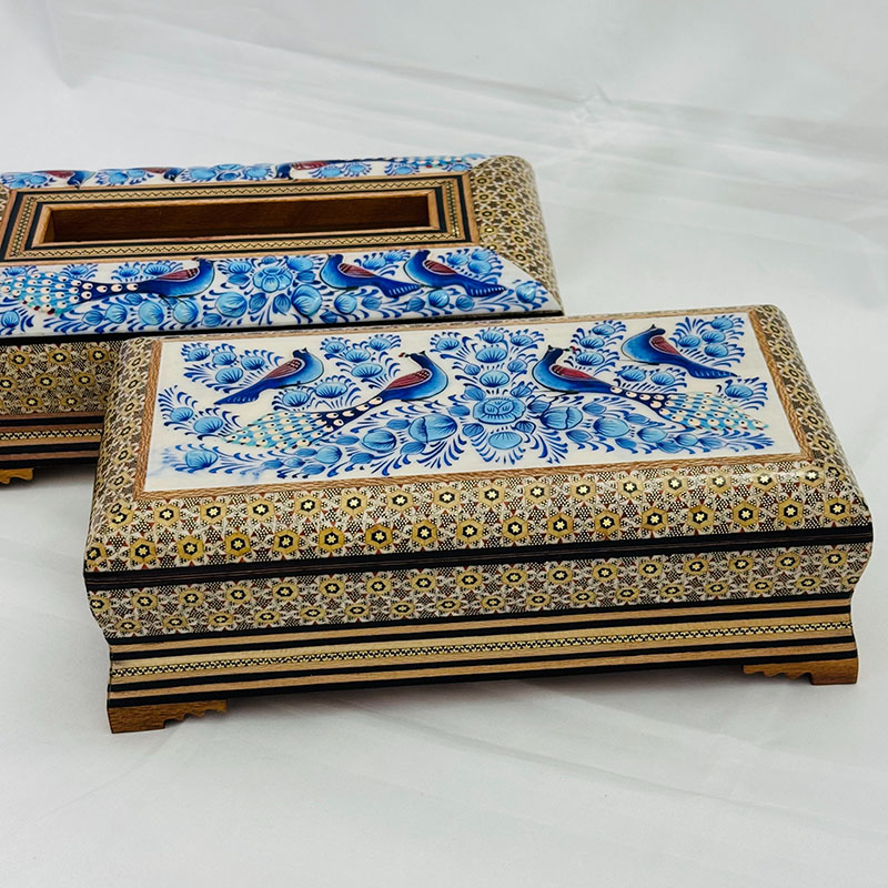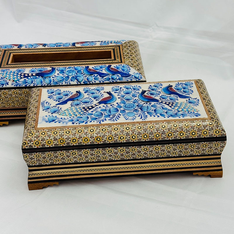 ⚜️ست جعبه دستمال کاغذی و جاکاردی اصفهان را می توان پرطرفدار ترین محصول صنایع دستی خاتم سازی اصفهان نام برد. شما می توانید برای زیباتر نشان دادن جعبه های دستمال کلینکس از جادستمال کاغذی خاتم کاری استفاده کنید. ⚜️جعبه دستمال خاتم کاری یکی از نمادهای هنر استادکاران خاتم ساز اصفهان است. جا دستمال خاتم کاری موردهای استفاده زیادی در منازل و دفاتر کار دارد.از این رو برای هدیه به دوستان و اقوام و یا حتی هدایای تبلیغاتی خاتم کاری صنایع دستی گزینه مناسبی است. ⚜️قیمت جعبه دستمال خاتم مناسب و خرید آن از سراسر کشور امکان پذیر است. هنر خاتم کاری اصفهان و خاتم کاری شیراز از شناخته شده ترین هنرهای دستی ایرانی محسوب می گردند که علاقه مندان زیادی در داخل و خارج کشور دارند.