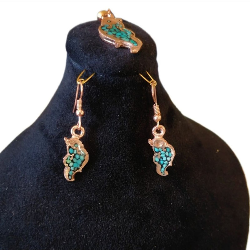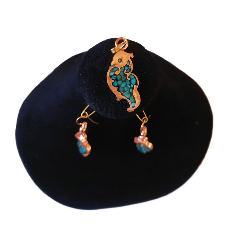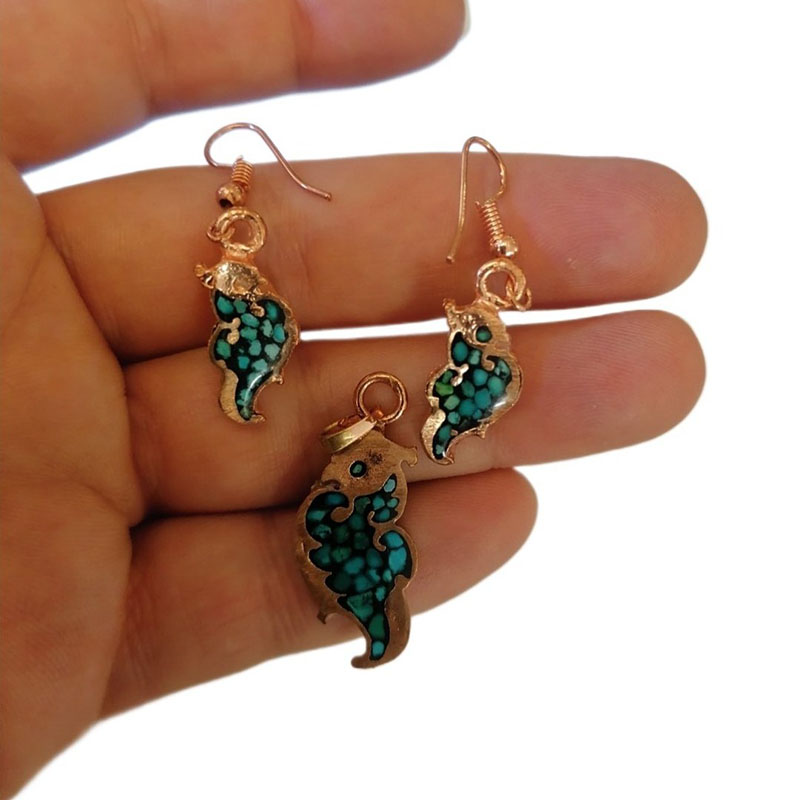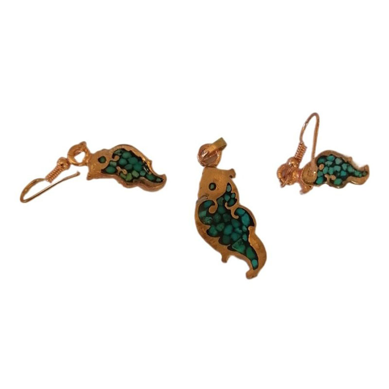 این ست زیورآلات مسی فیروزه کوب شامل گردنبند، انگشتر، دستبند و یک جفت گوشواره مسی میباشد. البته به صورت نیم ست نیز ارائه میشود.این ست از مس مرغوب کار شده است. انگشتر مسی فیروزه کوب فری سایز بوده و قابلیت تغییر سایز دارد. دستبند مسی فیروزه کوب نیز قفل دار بوده و برای هر سایز مچ دستی قابل استفاده است. یک جفت گوشواره مسی از همین مدل با قفل قلابی در این ست مسی موجود می باشد. همچنین پلاک مسی آن فیروزه کوب با این طرح و دارای زنجیر مسی مرغوب با قفل طوطی است. نکته : برروی تمامی زیورآلات جعبه هدیه 🎁 معمولی ارائه میگردد، شما میتوانید جعبه طرح های خاتم کاری را که تماما کار دست هنرمندان اصفهان است هم انتخاب کنید.