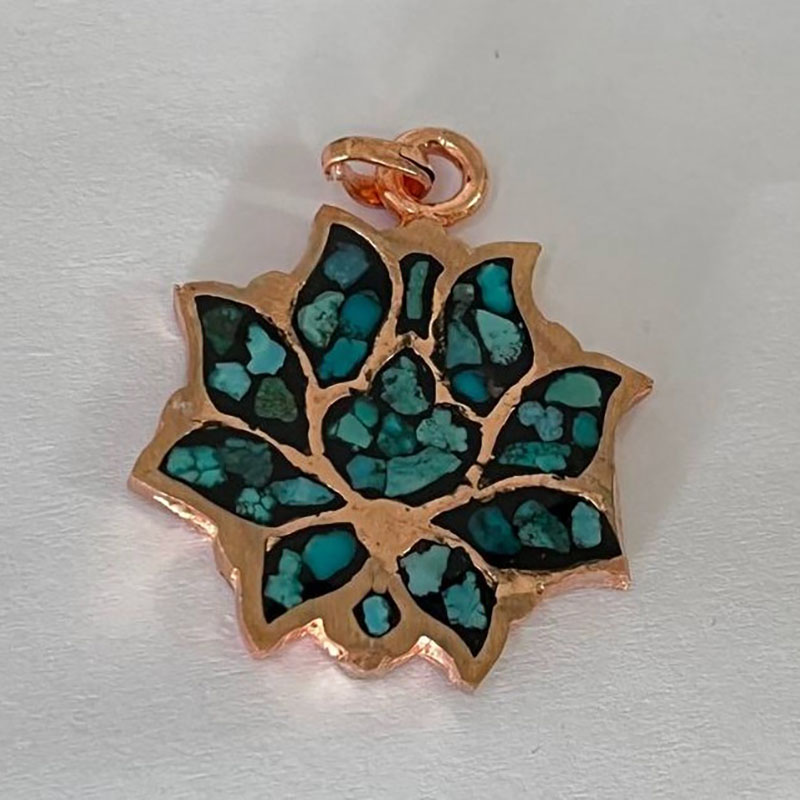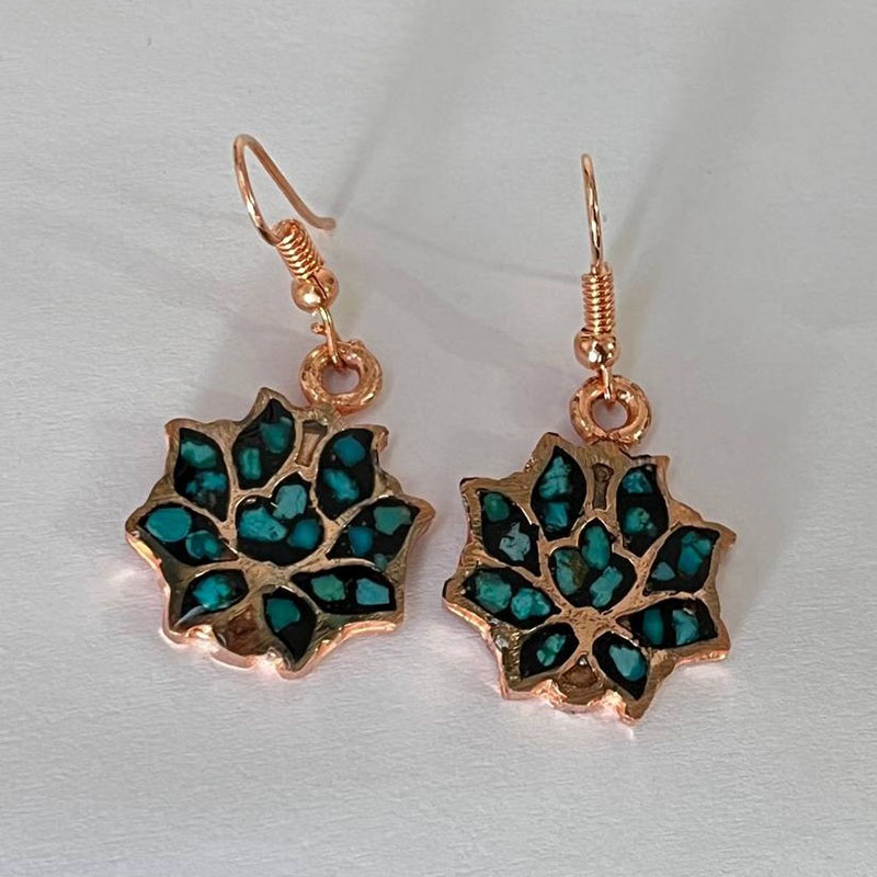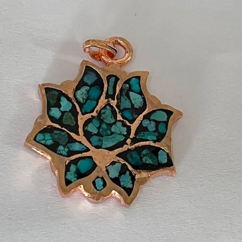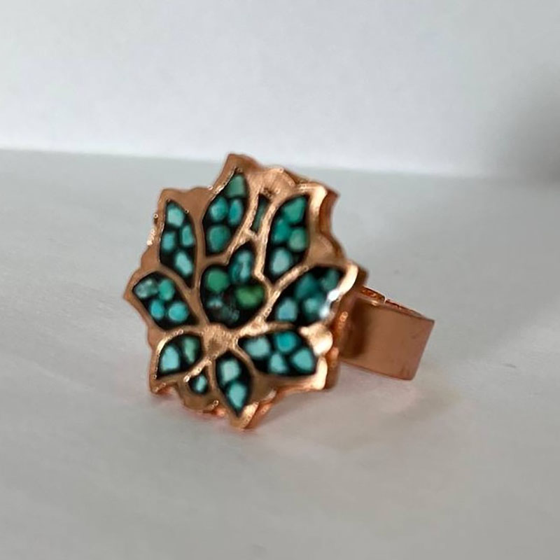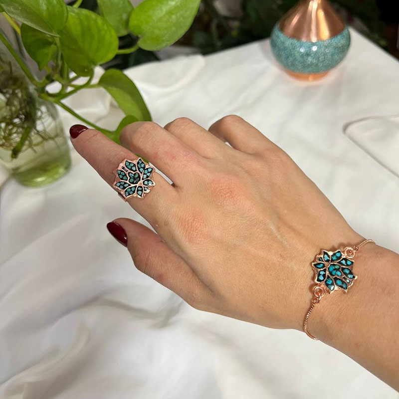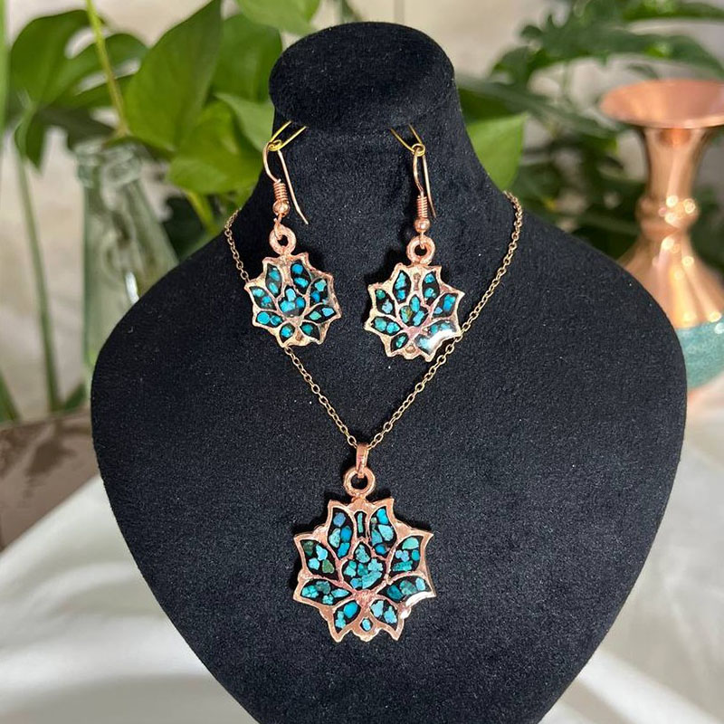 ست زیورآلات مسی فیروزه کوبی مدل اشرافی نمونهای از هنر اصیل ایرانی است که با ظرافت و دقت فراوان تولید شده است.