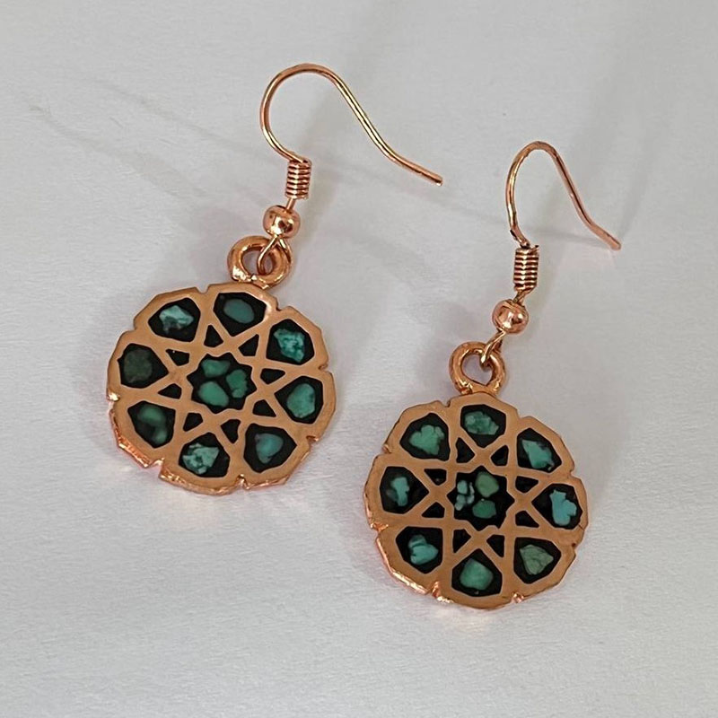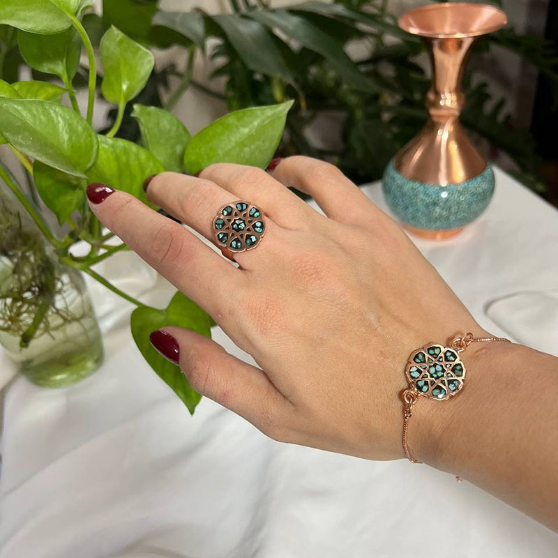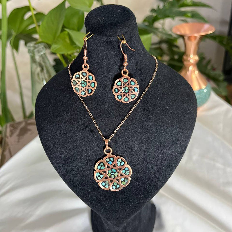 ست زیورآلات مسی فیروزه کوبی مدل اقاقیا نمونهای از هنر اصیل ایرانی است که با ظرافت و دقت فراوان تولید شده است.