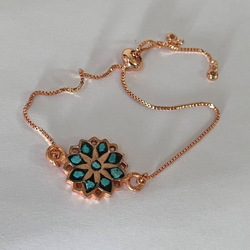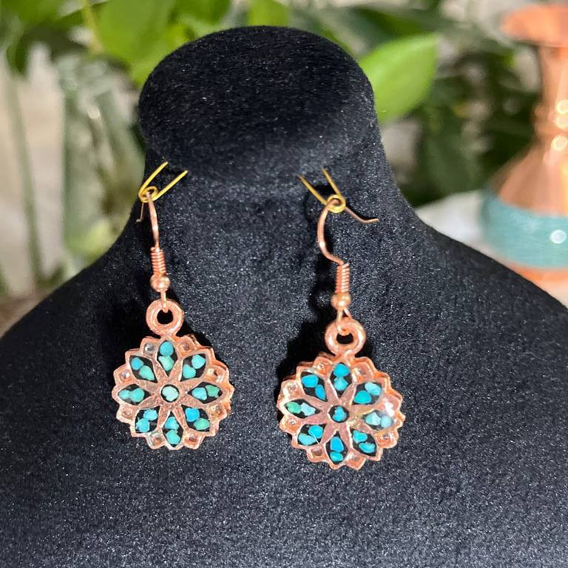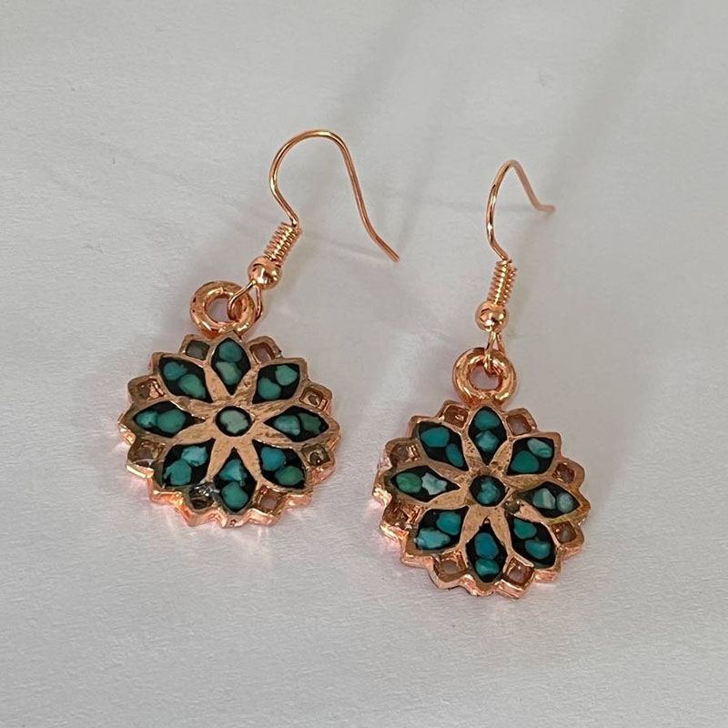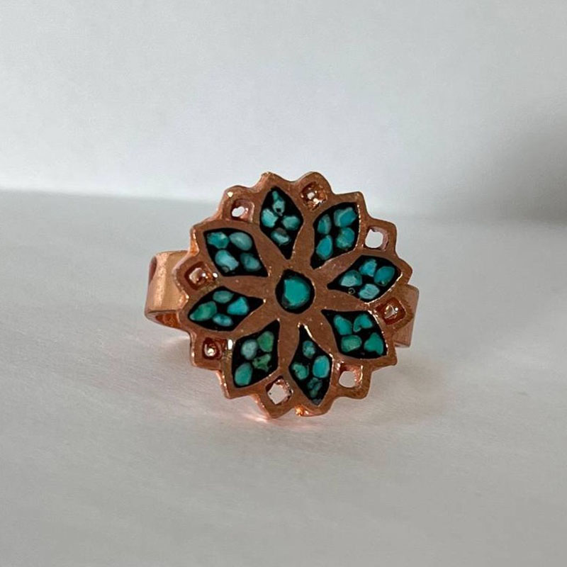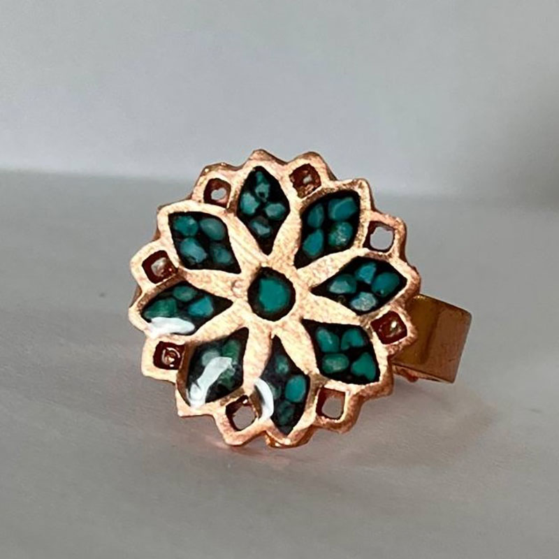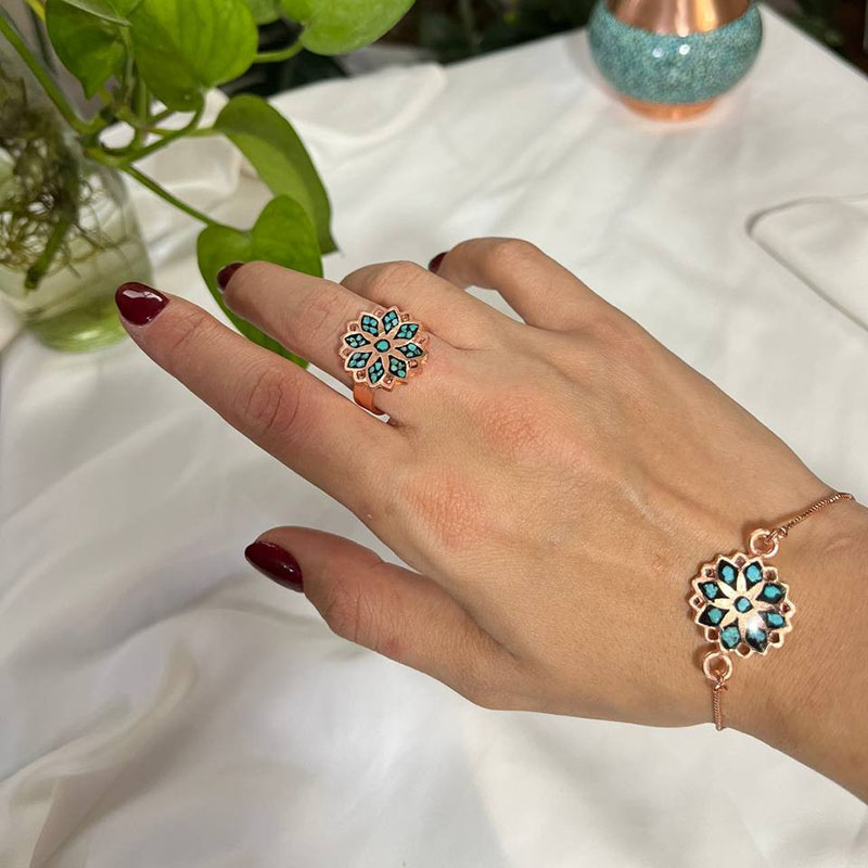 ست زیورآلات مسی فیروزه کوبی مدل گلایل نمونهای از هنر اصیل ایرانی است که با ظرافت و دقت فراوان تولید شده است.