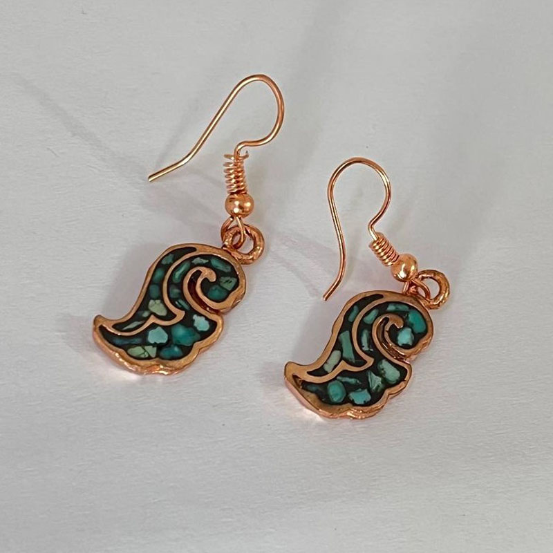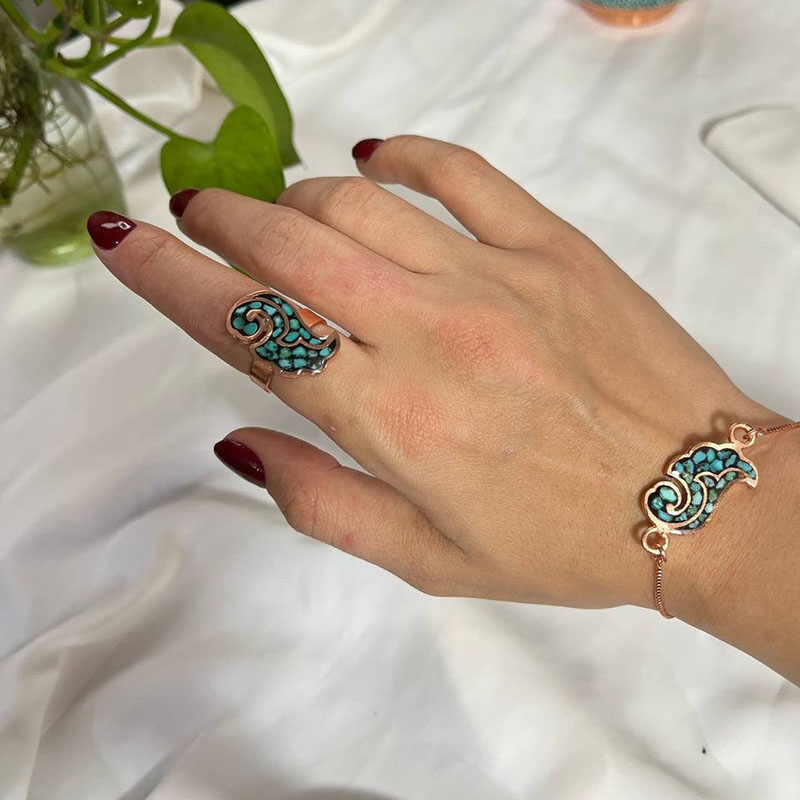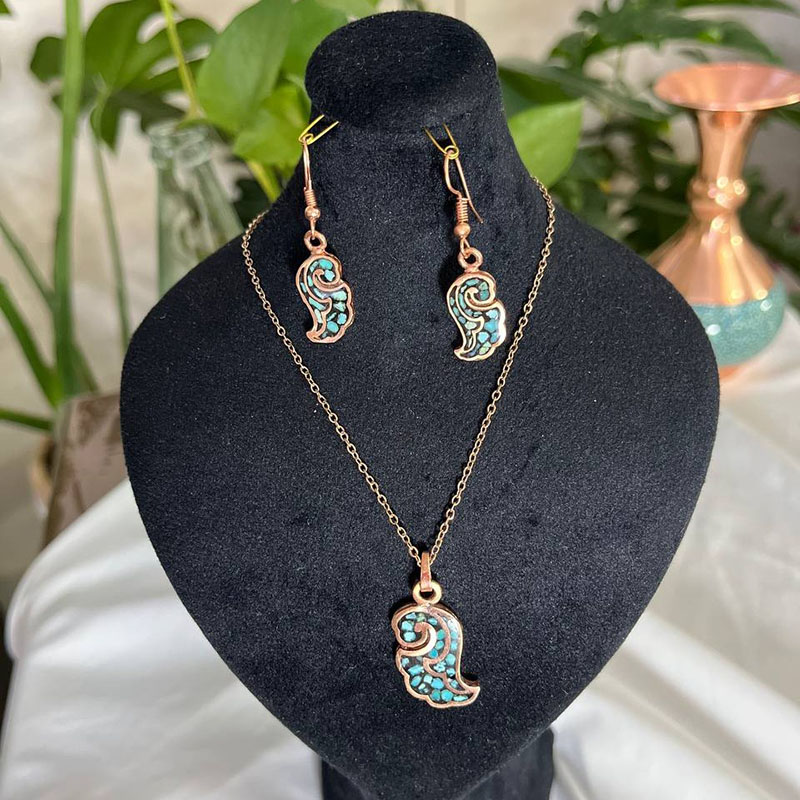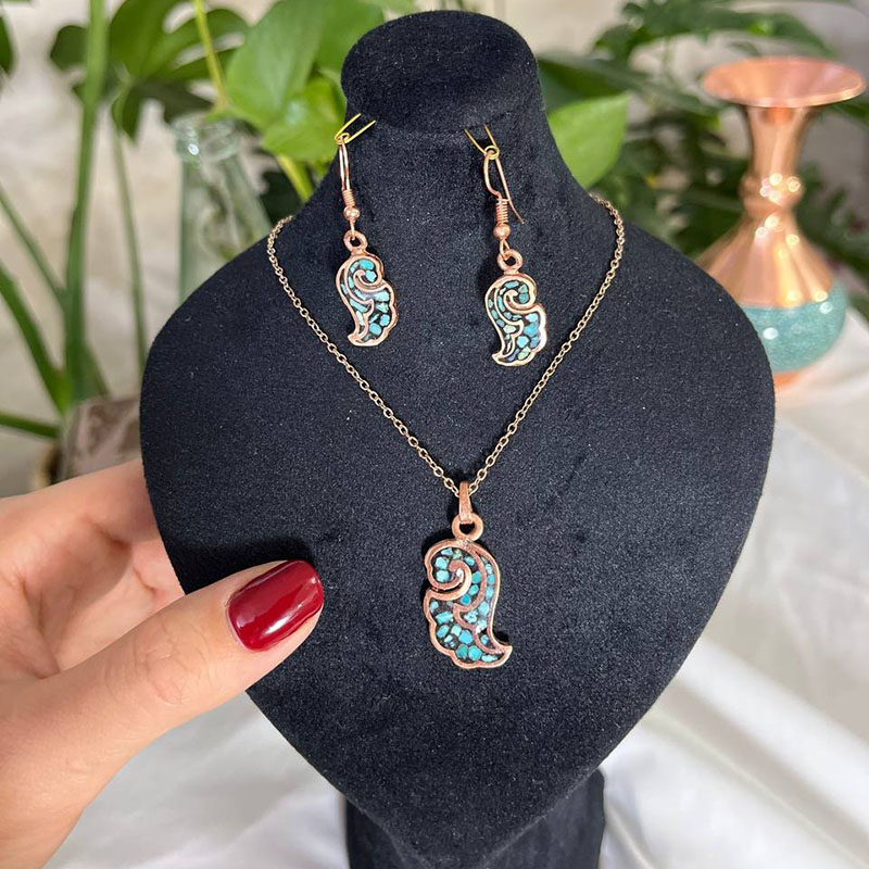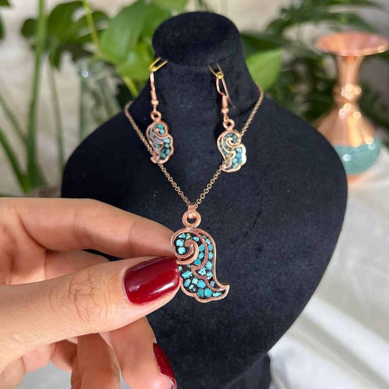 ست زیورآلات مسی فیروزه کوبی مدل گل شیپوری نمونهای از هنر اصیل ایرانی است که با ظرافت و دقت فراوان تولید شده است.