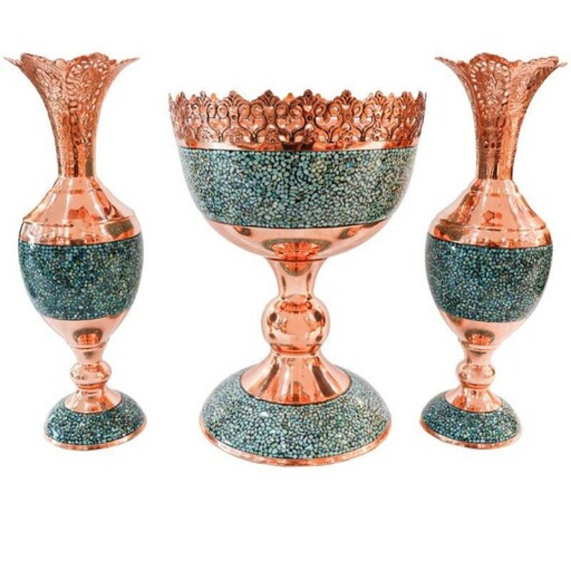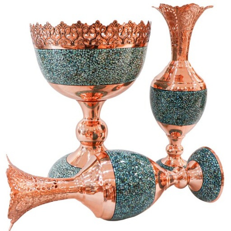 این کار نفیس فیروزه کوبی دارای پوششی از پلی استر است که علاوه بر پوششدهی مناسب سطح مس و جلوگیری از اکسید و سیاه شدن، مقاومت آن را نیز بالا برده است.از آنجاییکه پرداخت نهایی در تولید این کار ماهرانه و با دقت صورت گرفته،سطح مس و فیروزه براق، شفاف و درخشان است. فیروزه کوبی : فیروزه کوبی از صنایع دستی است و با نشاندن قطعه های کوچک سنگ فیروزه به حالت موزاییکی بر سطح ظرف ها ، زیورآلات و اشیای تزئینی ( از پایه هایی به جنس های مسی ، برنجی، نقره، ورشویی ویا برنزی) ساخته می شود . هر چه ظرف فیروزه کوبی شده پر کارتر و منظم تر باشد و فاصله کمتری بین قطعات فیروزه باشد ، ارزش هنری آن بیشتر است . امروزه اصفهان مرکزاین هنر است .