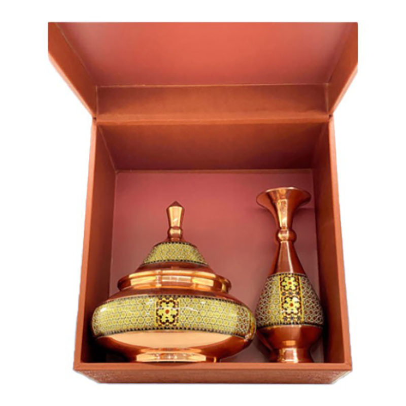 جنس ظروف مس و خاتم از فلز مس بوده که بر روی آن خاتم اصل اصفهان چسبانده شده است. استفاده از خاتم اعلا و متریال باکیفیت باعث افزایش طول عمر و ماندگاری فوق العاده در ظروف مس و خاتم شده است. سایز بندی ظروف مس و خاتم به شما امکان استفاده آنها را در چیدمان های مختلف خواهد داد. ظروف مس و خاتم برای زیباسازی فضاهای دکوری در نظر گرفته می شود. از این رو می تواند با دیگر محصولات دکوری ست گردد. محصولات مس و خاتم اصفهان از محصولات هنری صنایع دستی نفیس ایرانی بشمار می رود. فلز مس مورد استفاده در این محصولات ضخامت بالا و مناسبی دارد و به شکل نهایی محصول جلوه خاصی بخشیده است. این محصول دارای لایهای محافظ با پلیاستر است که علاوه بر پوششدهی مناسب سطح مس و جلوگیری از اکسید و سیاه شدن، مقاومت آن را نیز بالا برده است. بسیاری از شرکت ها و سازمان ها بمنظور تهیه هدایای تبلیغاتی سالیانه خود از محصولات مس و خاتم اصفهان استفاده می کنند. قبل از سفارش طرح مورد نظرتون رو استعلام بگیرید و با اطمینان خرید کنید.