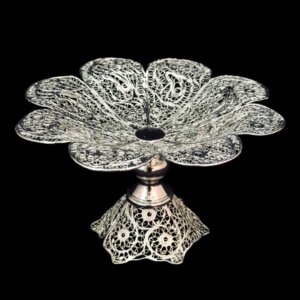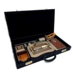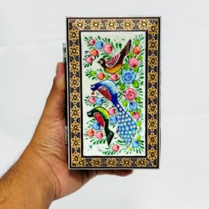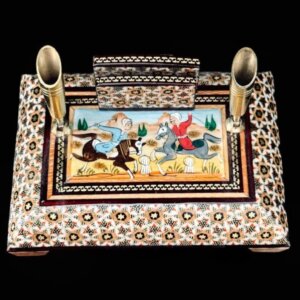نکته : ست مورد نظر همراه با جعبه خاتم کاری میباشد. مراحل ساخت مصنوعات خاتم زمان بر و گاهی سخت است و مراحل مختلفی را شامل میشود مثلاً هنگام ساخت قطعات هندسی منظم، ابتدا انواع چوب و استخوان با رنگهای مختلف را با ابزار مخصوصی به طول سی سانتی متر و قطر یک تا دو و نیم میلی متر معمولاً به شکل مثلث بر5ش می دهند این اشکال هندسی را نیز با سیم های فلزی می سازند این مثلثهای ،چوبی استخوانی و فلزی سپس با دقت و مهارت و حوصله مطابق طرح از قبل تعیین شده و با چسب چسب داغ یا چسب سفید سرد به هم چسبانده شده و با نخ محکم میشوند. به این قطعه «پره میگویند این کار با چسباندن پره ها به هم ادامه و تکرار میشود تا در نهایت پس از مراحلی لاک زدن و پرداخت طرح و شکل دلخواه تولید مانند پرس و روی ظروف و اشیا و محصولات خاتم کاری ساخته شود. خصوصیت خاتم مرغوب: سطح خاتم باید صاف و پر باشد. رنگ و مصالح به کار رفته در خاتم یکنواخت باشد. دقیق و مهندسی بودن اساس و ساختمان طرح رنگ کاری و روکش دادن بدون نقص ریز و ظریف بودن نقشها و مثلثها ترمیم کاری ها و بتونه کاریها در سطح کار مشخص نباشند.