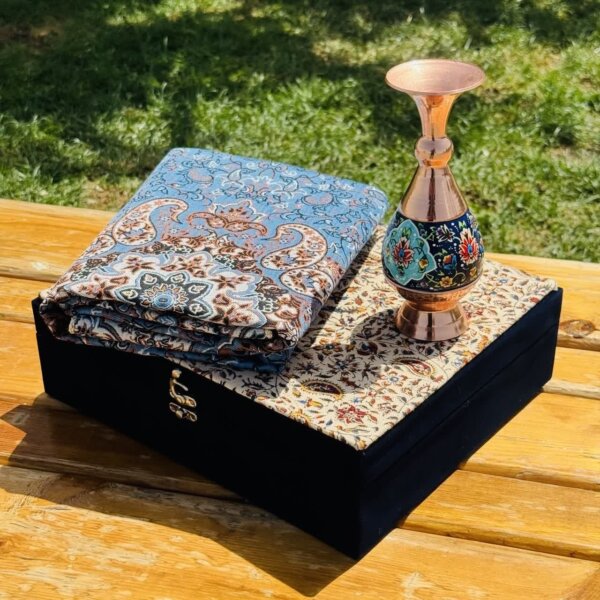 این ست هدیه نفیس، تلفیقی هنرمندانه از دو شاهکار صنایع دستی ایران، هنر مس و پرداز و پارچه فاخر ترمه است. گلدان مسی با ارتفاع 20 سانتیمتر، با نقوش زیبای پرداز که با ظرافت و دقت بر سطح آن نقش بستهاند، اصالت و شکوه هنر ایرانی را به نمایش میگذارد. در کنار این گلدان چشمنواز، یک قطعه رومیزی ترمه با ابعاد یک در یک متر مربع قرار گرفته است. پارچه ترمه، با طرحهای سنتی و رنگهای دلنشین خود، نه تنها زیبایی بصری بینظیری دارد، بلکه حس گرما و اصالت را نیز به فضای کار هدیه میدهد. این ست هدیه اداری، انتخابی ایدهآل برای مدیران، کارمندان و یا هر فردی است که قدردان هنر و زیبایی است. قرار دادن این ست بر روی میز کار، علاوه بر ایجاد فضایی دلنشین و الهامبخش، میتواند نمادی از حسن سلیقه و توجه به جزئیات باشد.
