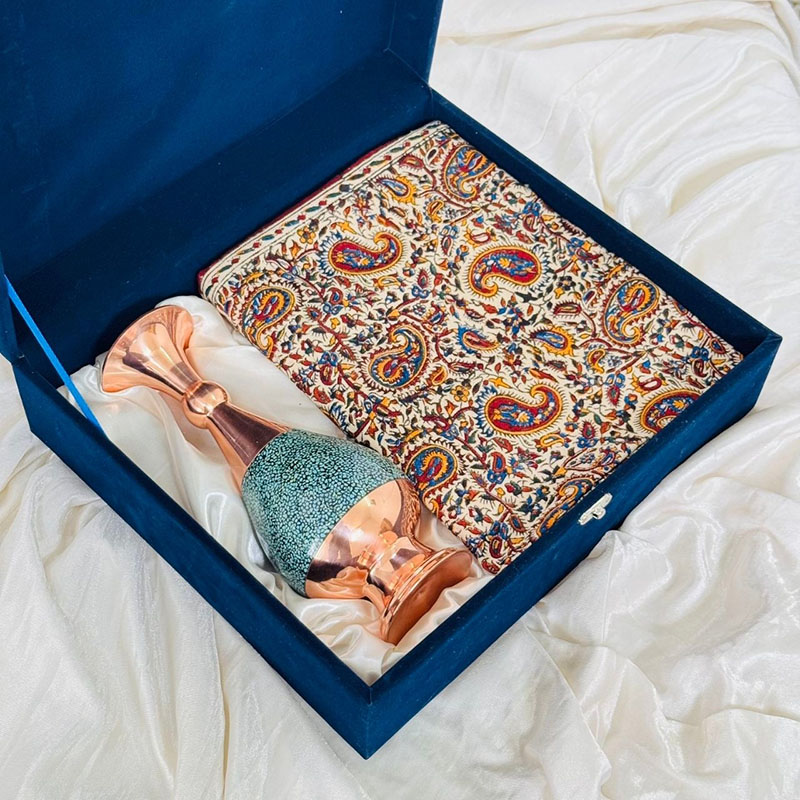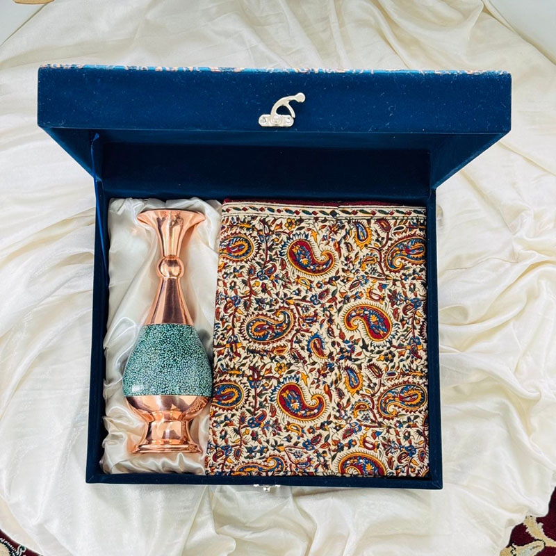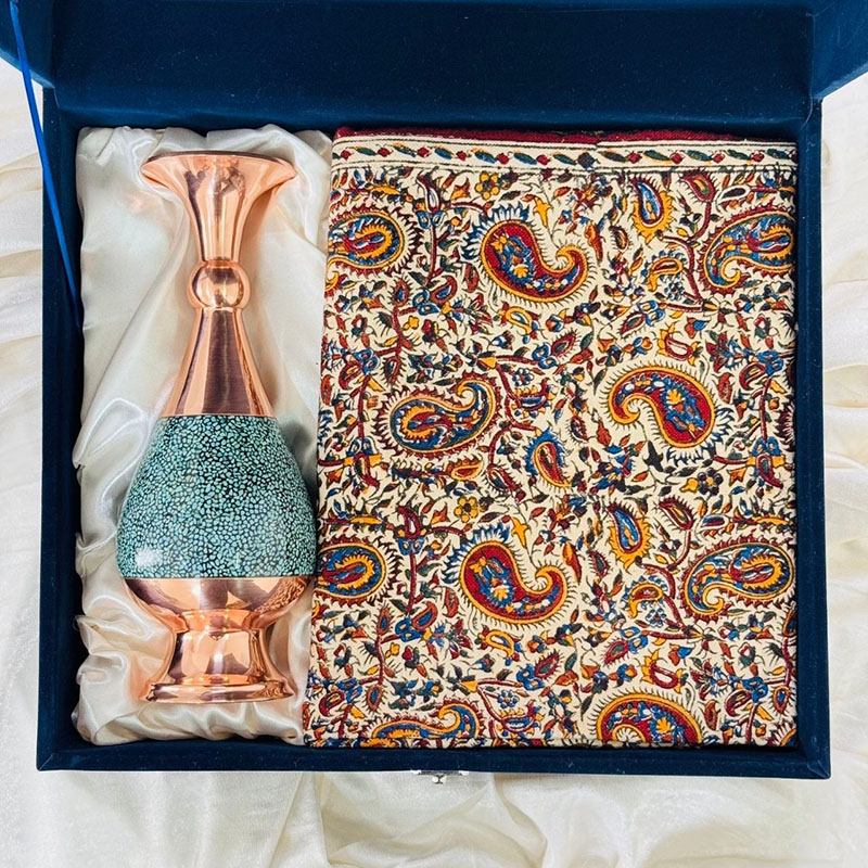 ست هدیه اداری گلدان مس و فیروزه 25 سانتی و رومیزی قلمکاری