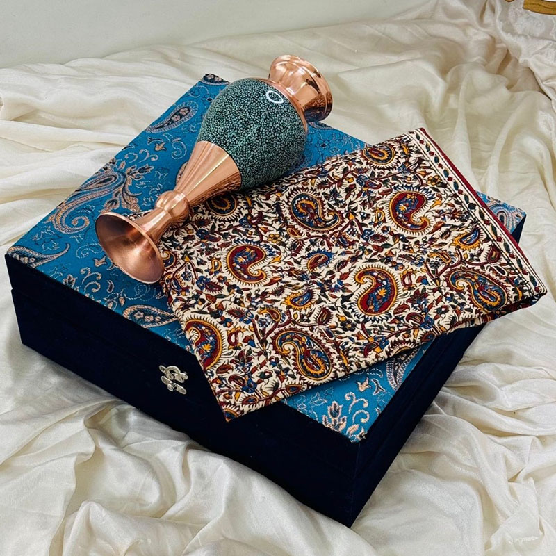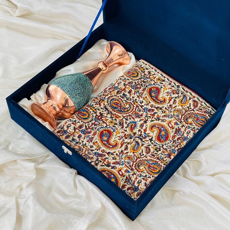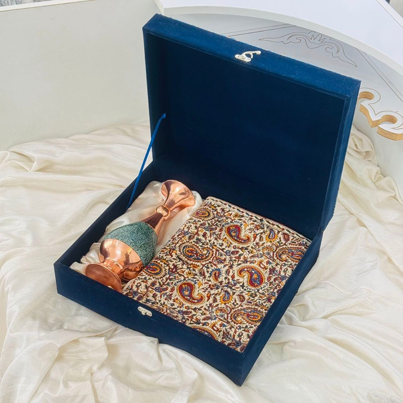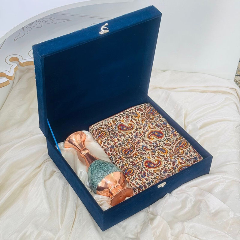 گلدان مسی با روکش فیروزه: این گلدان زیبا، که با دستان هنرمندان ماهر اصفهانی ساخته شده، جلوه‌ای درخشان از هنر فیروزه‌کوبی را به نمایش می‌گذارد. ترکیب مس خوش‌رنگ و سنگ‌های فیروزه اصیل، حس آرامش و شکوه را به محیط کار هدیه می‌دهد. این گلدان نه تنها یک اثر هنری است، بلکه می‌تواند زینت‌بخش میز کار و یادآور سلیقه والای شما باشد. رومیزی نفیس قلمکاری: این رومیزی که با ظرافت و دقت توسط هنرمندان چیره دست اصفهانی نقش‌اندازی شده، جلوه‌ای سنتی و اصیل به فضای کار می‌بخشد. نقوش زیبای قلمکاری، که ریشه در تاریخ و فرهنگ غنی ایران دارد، داستانی از هنر و تمدن را روایت می‌کند. این رومیزی، علاوه بر زیبایی بصری، می‌تواند محافظی برای سطح میز کار شما نیز باشد.