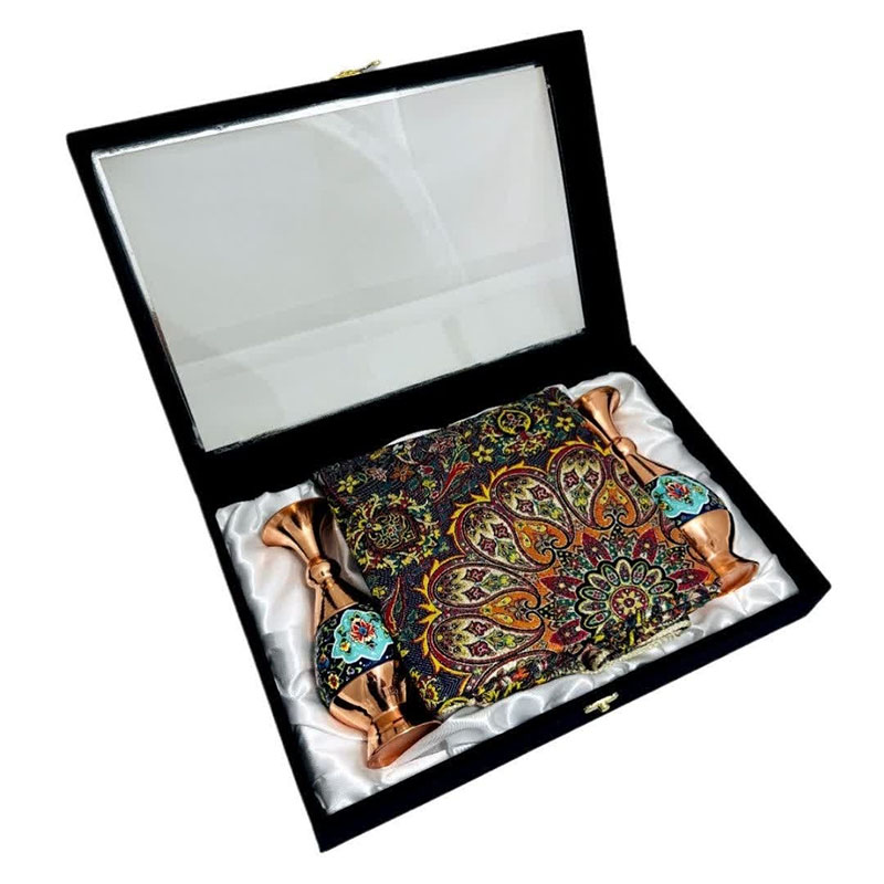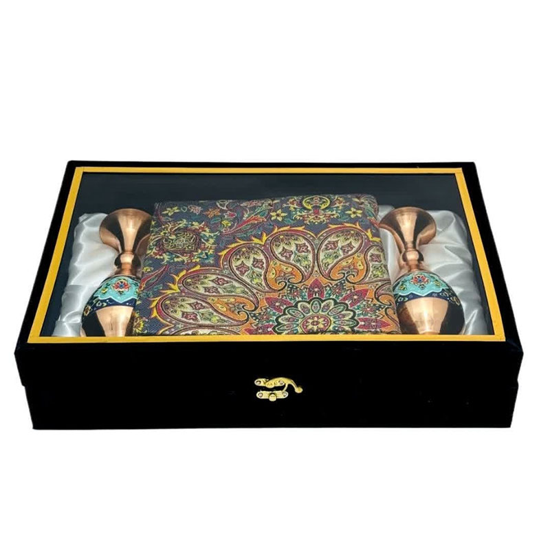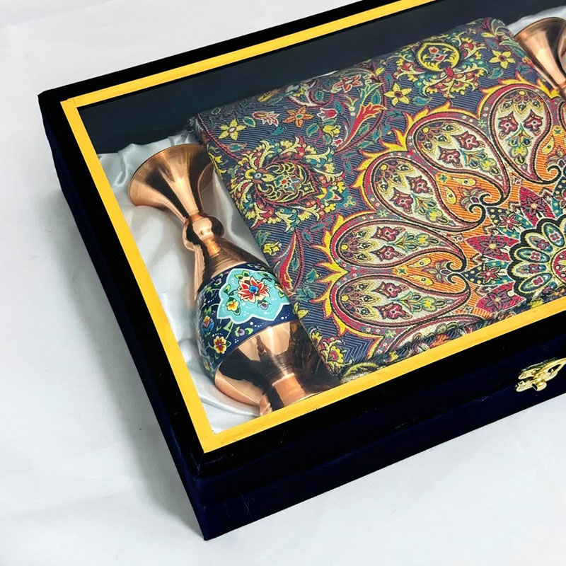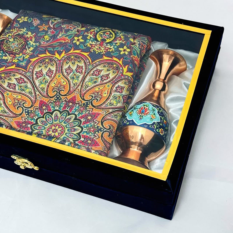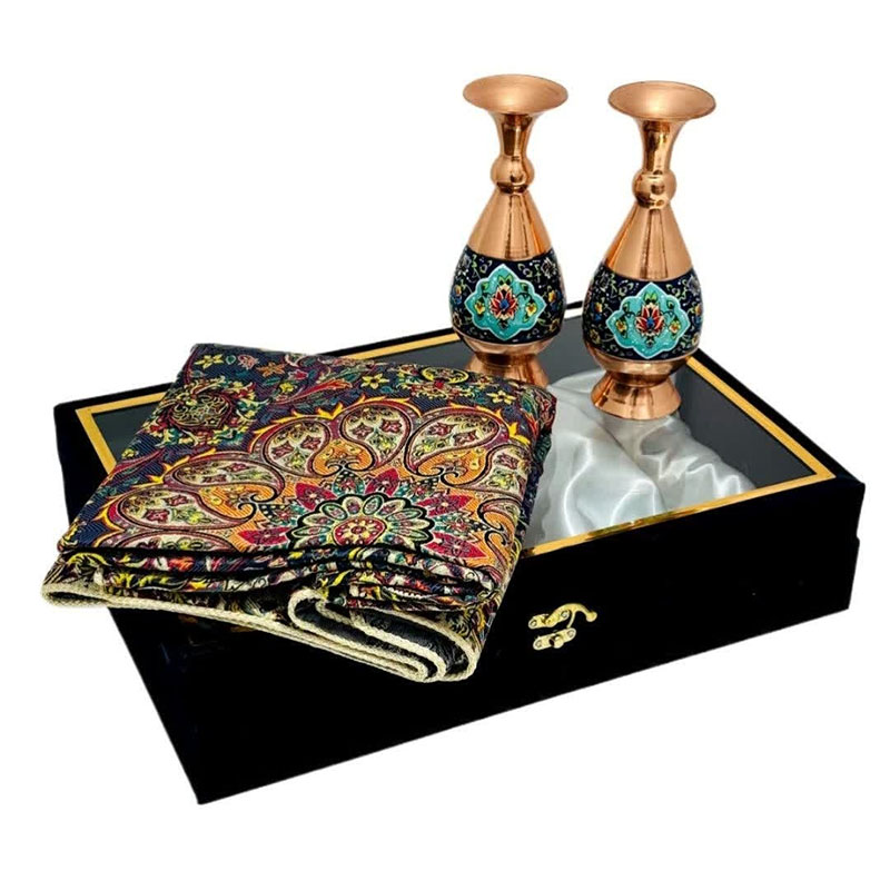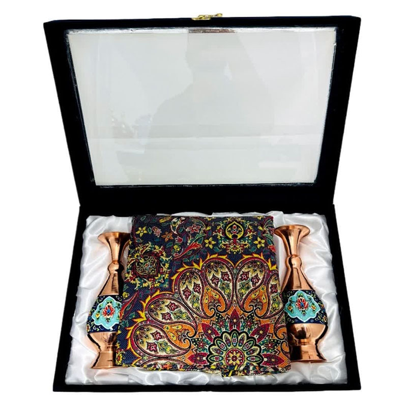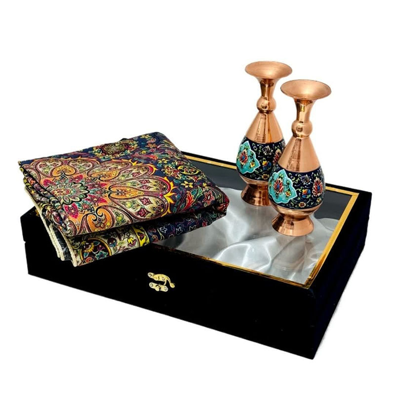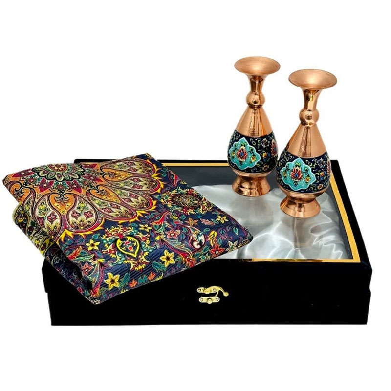 این ست هدیه نفیس، تلفیقی هنرمندانه از دو شاهکار صنایع دستی ایران، هنر مس و پرداز و پارچه فاخر ترمه است. گلدان مسی با ارتفاع 20 سانتیمتر، با نقوش زیبای پرداز که با ظرافت و دقت بر سطح آن نقش بستهاند، اصالت و شکوه هنر ایرانی را به نمایش میگذارد. در کنار این گلدان چشمنواز، یک قطعه رومیزی ترمه با ابعاد یک در یک متر مربع قرار گرفته است. پارچه ترمه، با طرحهای سنتی و رنگهای دلنشین خود، نه تنها زیبایی بصری بینظیری دارد، بلکه حس گرما و اصالت را نیز به فضای کار هدیه میدهد. این ست هدیه اداری، انتخابی ایدهآل برای مدیران، کارمندان و یا هر فردی است که قدردان هنر و زیبایی است. قرار دادن این ست بر روی میز کار، علاوه بر ایجاد فضایی دلنشین و الهامبخش، میتواند نمادی از حسن سلیقه و توجه به جزئیات باشد.