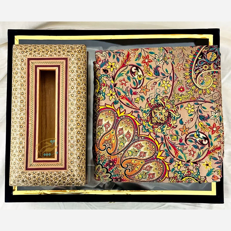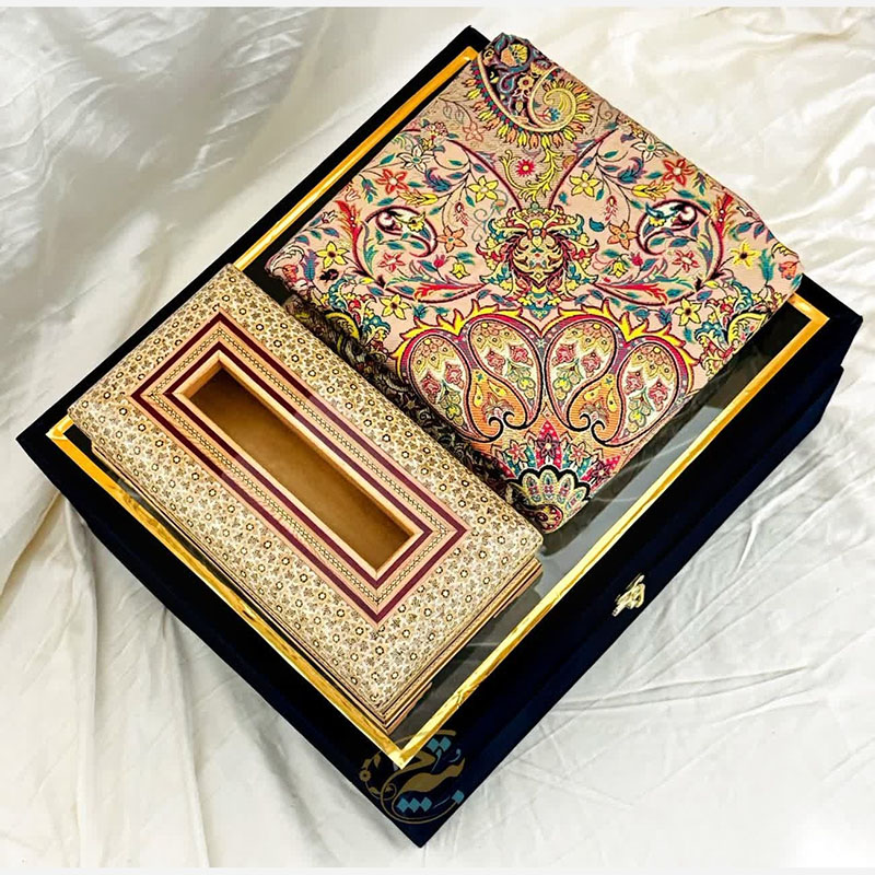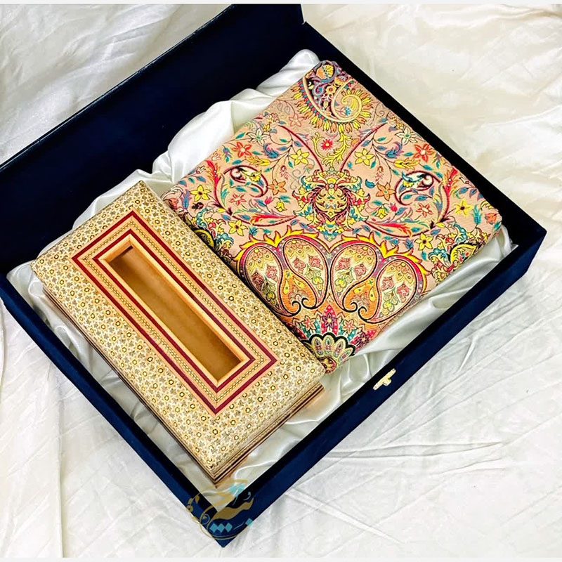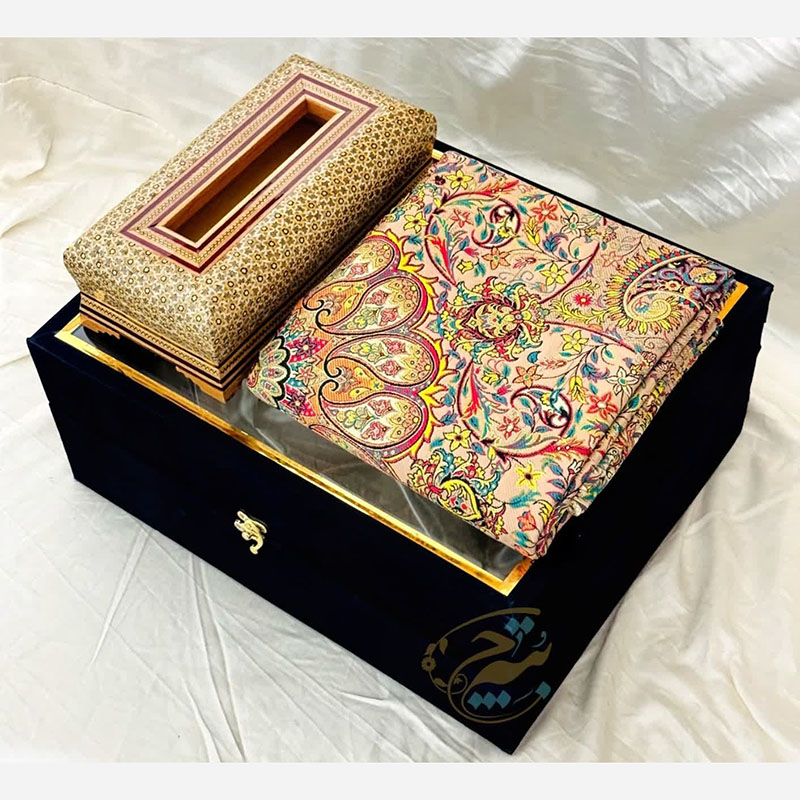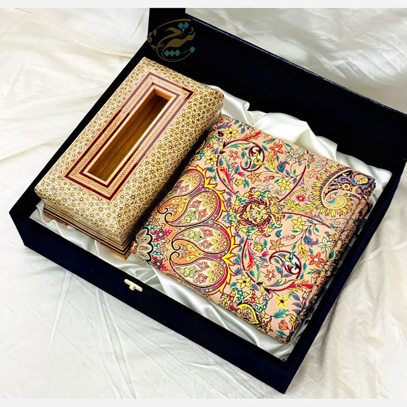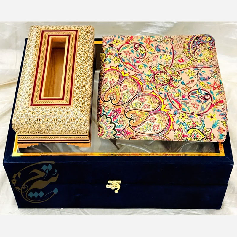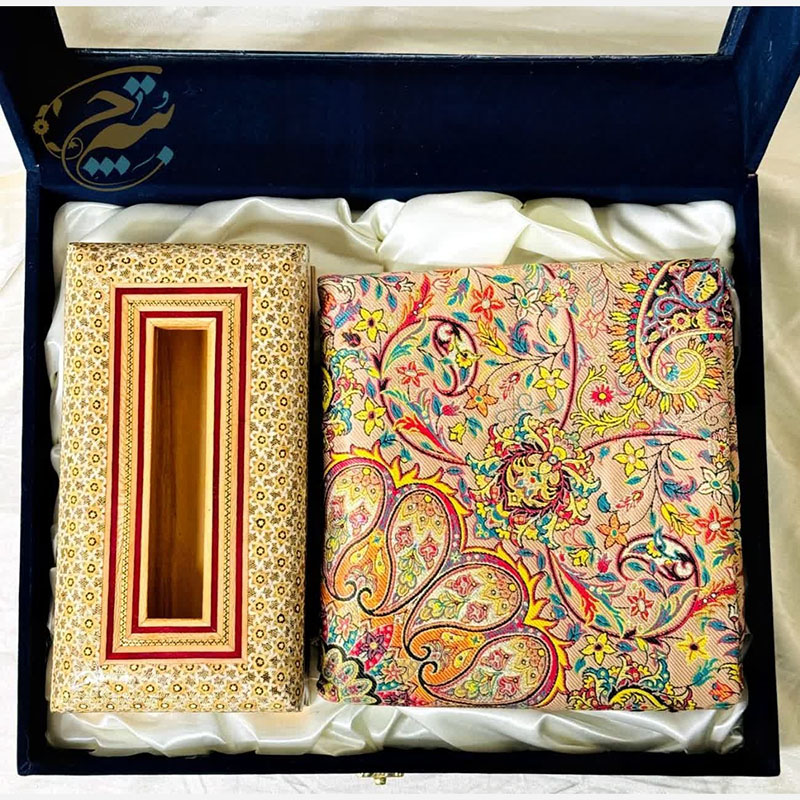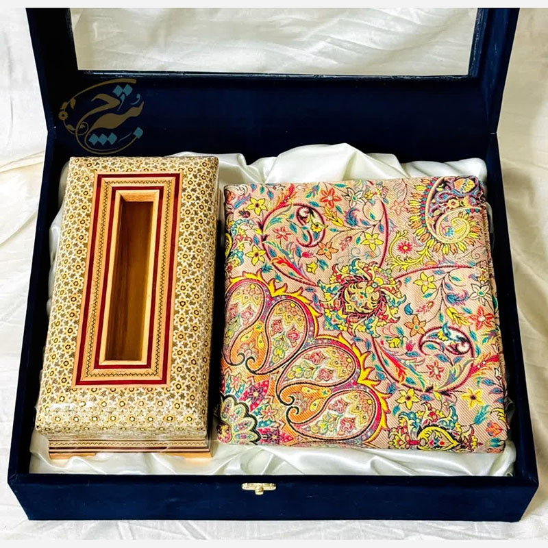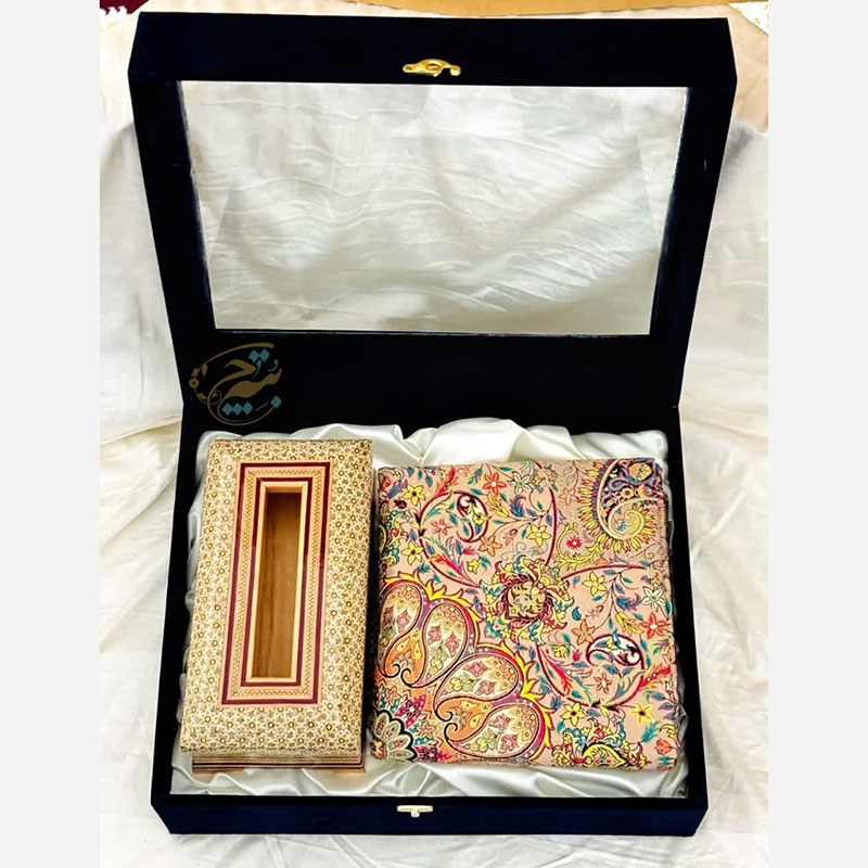 ترمه یک در یک متر مربع دستمال خاتم کاری 14در24 خاتم کاری ، ست مناسب هدیه های شکیل نکته:قیمت به همراه جعبه مخمل هدیه ای که درب آن شیشه ای است درج شده است .