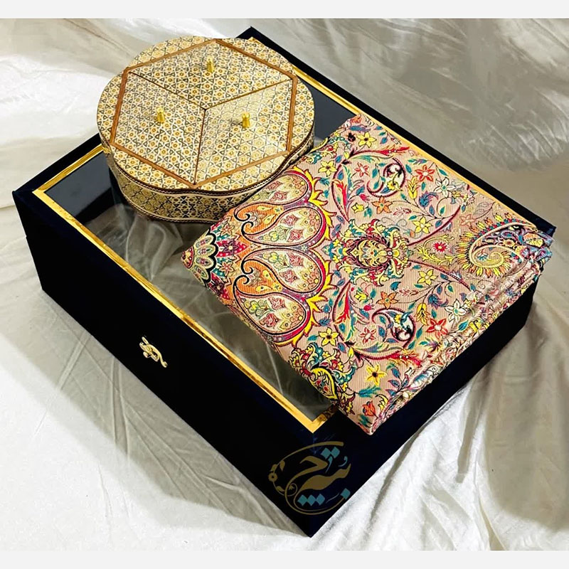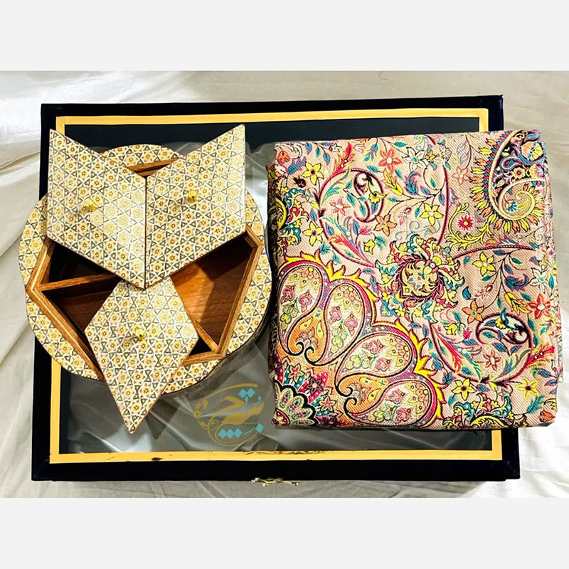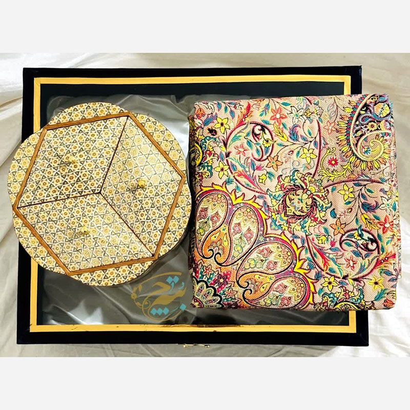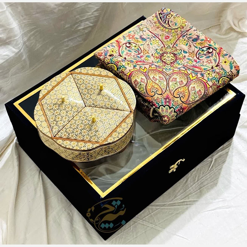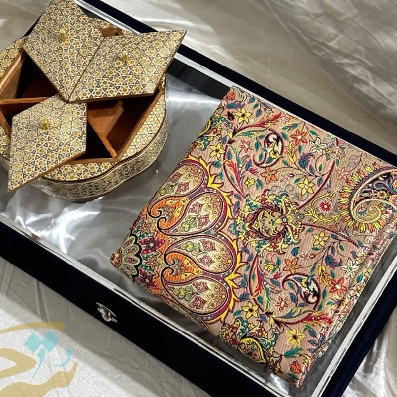 یک در یک متر ترمه و شکلات خوری قطر 23 سانت سه درب دارای قسمت بندی (بزرگ) شکلات خوری خاتم (روکش نانو پلی استر برای تثبیت رنگ) نکته:قیمت به همراه جعبه مخمل هدیه ای که درب آن شیشه ای است درج شده است .