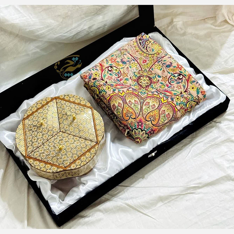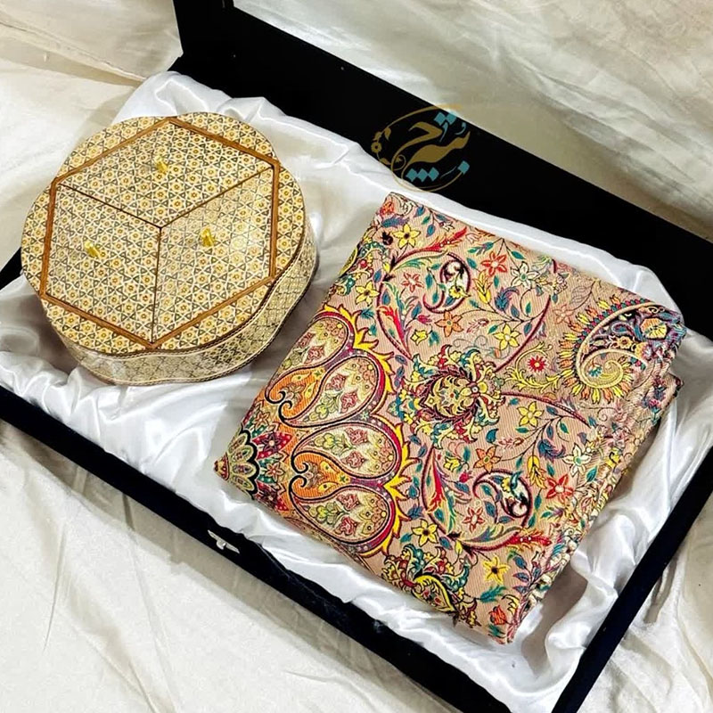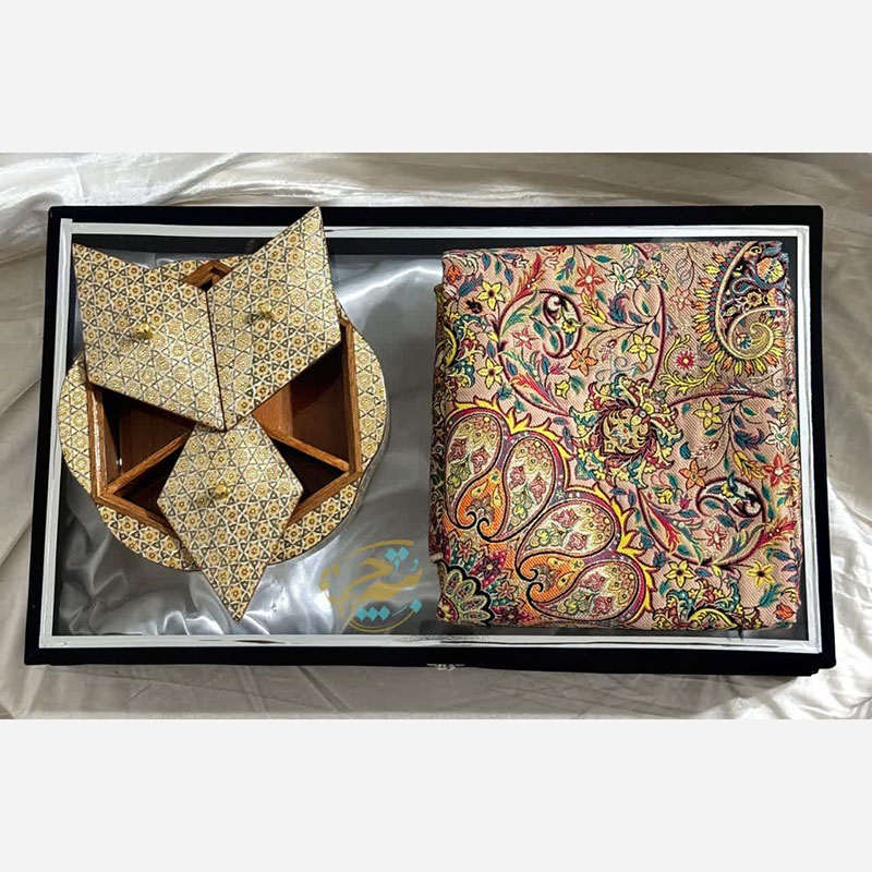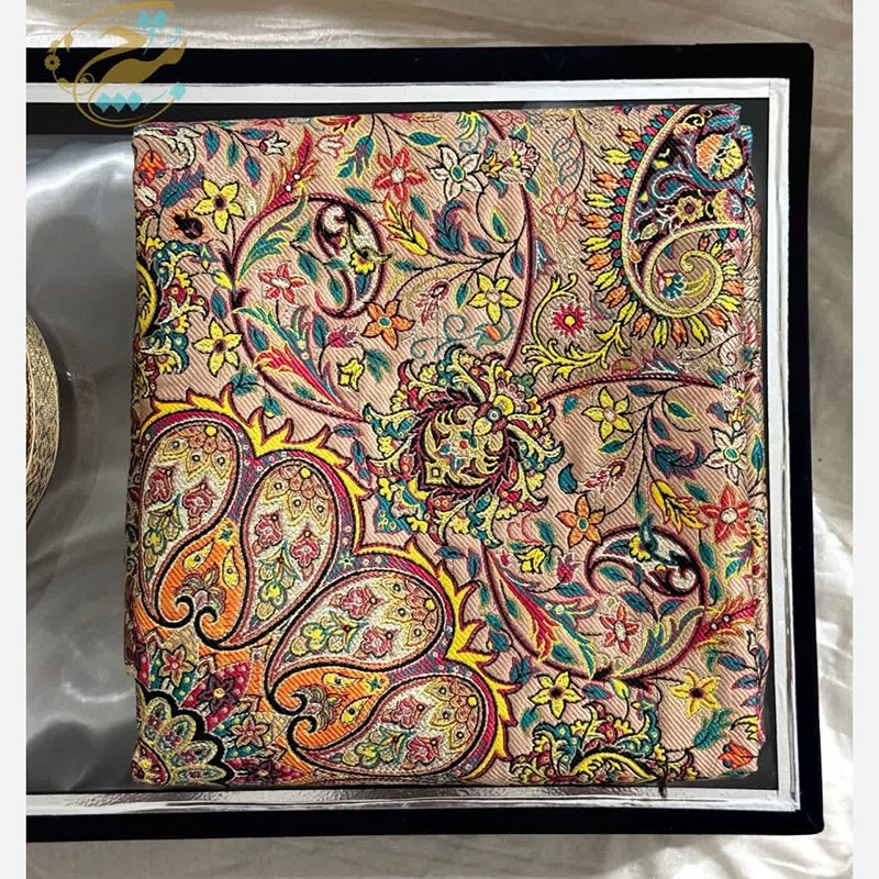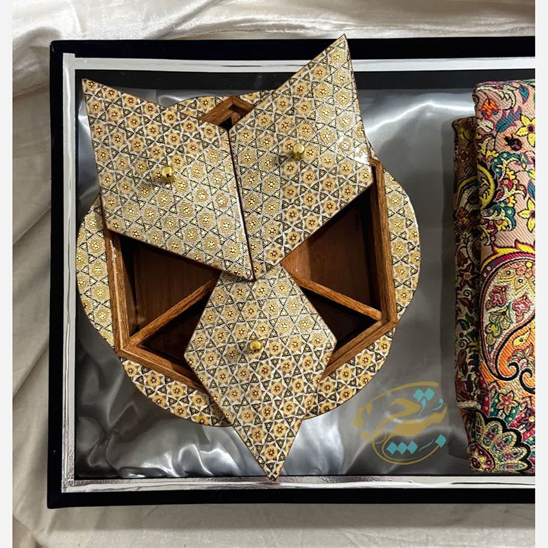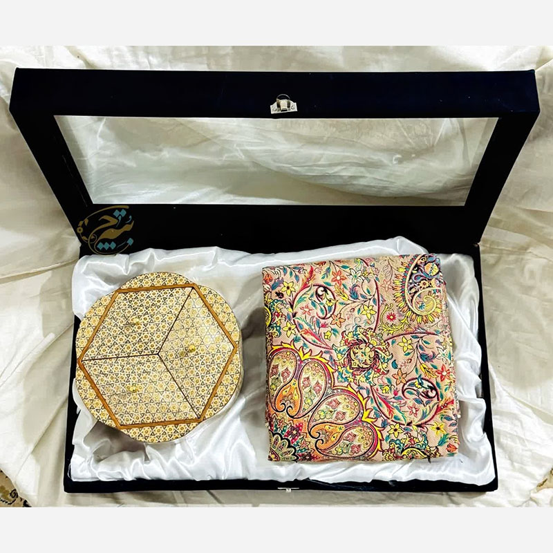 یک در یک متر ترمه و شکلات خوری قطر 23 سانت سه درب دارای قسمت بندی (بزرگ) شکلات خوری خاتم (روکش نانو پلی استر برای تثبیت رنگ) نکته:قیمت به همراه جعبه مخمل هدیه ای که درب آن شیشه ای است درج شده است .
