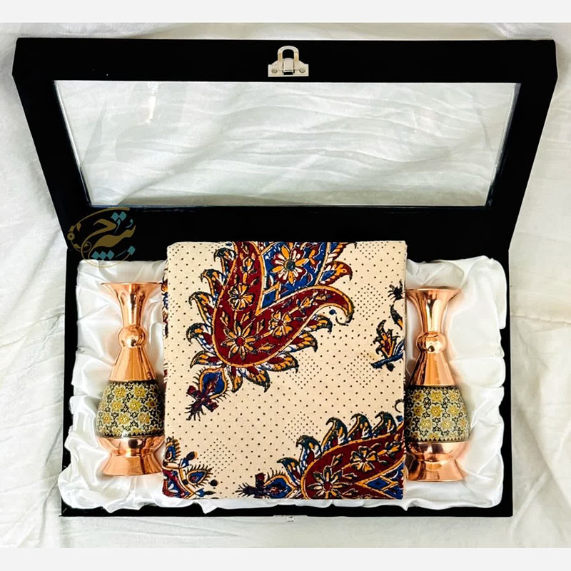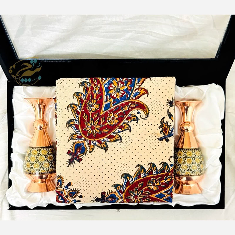 ست هدیه خاتم کاری گلدان و رومیزی قلمکار با جعبه مخمل