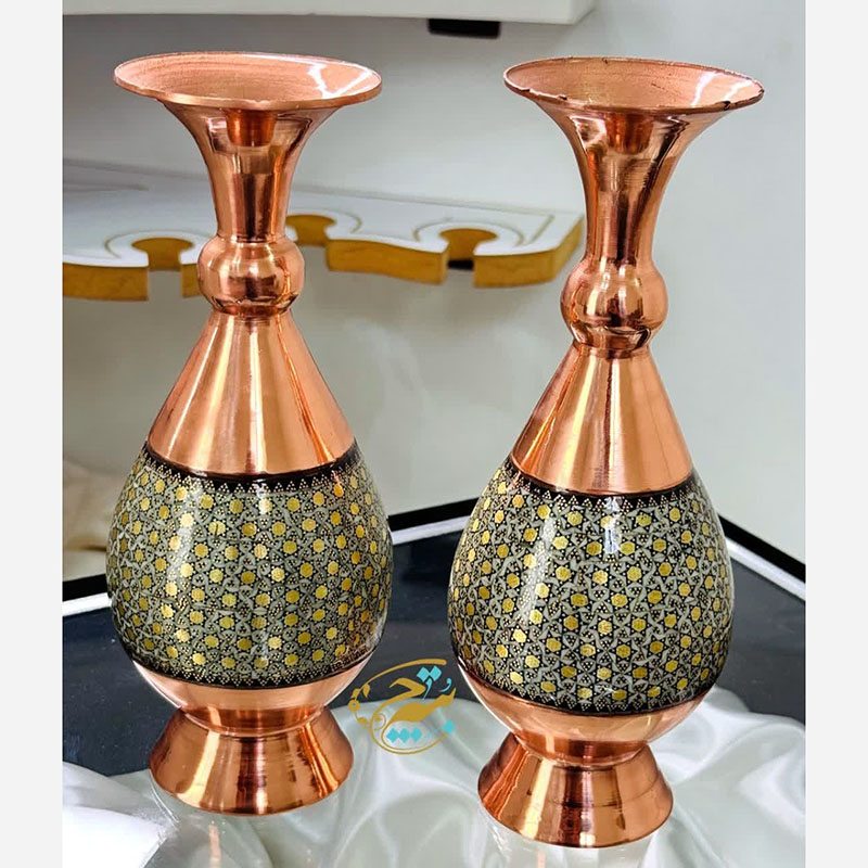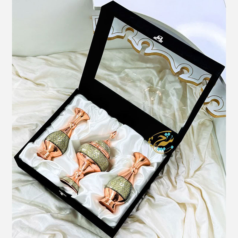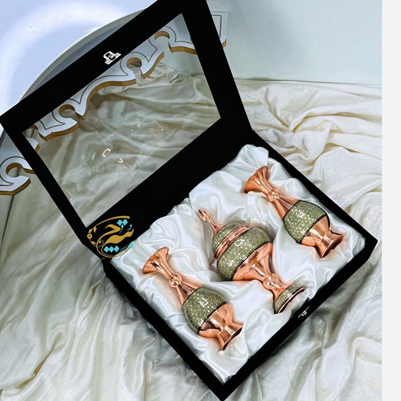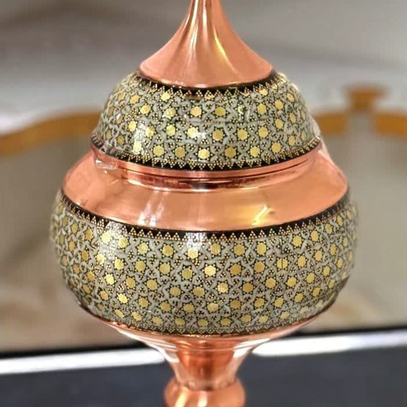 خاتم کاری: یک هنر سنتی ایرانی است که در آن قطعات ریز مثلثی شکل از مواد مختلف مانند چوب، استخوان و فلز، با دقت و ظرافت بر روی سطوح مختلف، از جمله چوب، استخوان و حتی مس، چیده و به هم متصل می‌شوند تا نقش و نگارهای هندسی زیبا و پیچیده‌ای را ایجاد کنند. مس و خاتم: این هنر یک ترکیب جدید از خاتم کاری بر روی ظروف مسی است. در این هنر، ظروف مسی به عنوان یک پایه و بستر استفاده می‌شوند و سپس خاتم کاری بر روی آنها انجام می‌شود. مواد مورد استفاده: علاوه بر مس، در خاتم کاری از مواد دیگری مانند چوب، استخوان، برنج، نقره و طلا نیز استفاده می‌شود. انتخاب مواد مناسب به نوع طراحی، سلیقه و بودجه هنرمند بستگی دارد. کاربردها: ظروف مس و خاتم برای مصارف مختلفی از جمله پذیرایی، تزئین، هدایای نفیس و همچنین برای استفاده در مجالس و جشن‌ها به کار می‌روند. در مجموع، مس و خاتم یک ترکیب هنری و صنایع دستی جذاب است که زیبایی، دوام و ارزش هنری ظروف مسی را افزایش می‌دهد و به عنوان یکی از هنرهای دستی برجسته ایران شناخته می‌شود نکته:قیمت به همراه جعبه مخمل هدیه ای که درب آن شیشه ای است درج شده است .