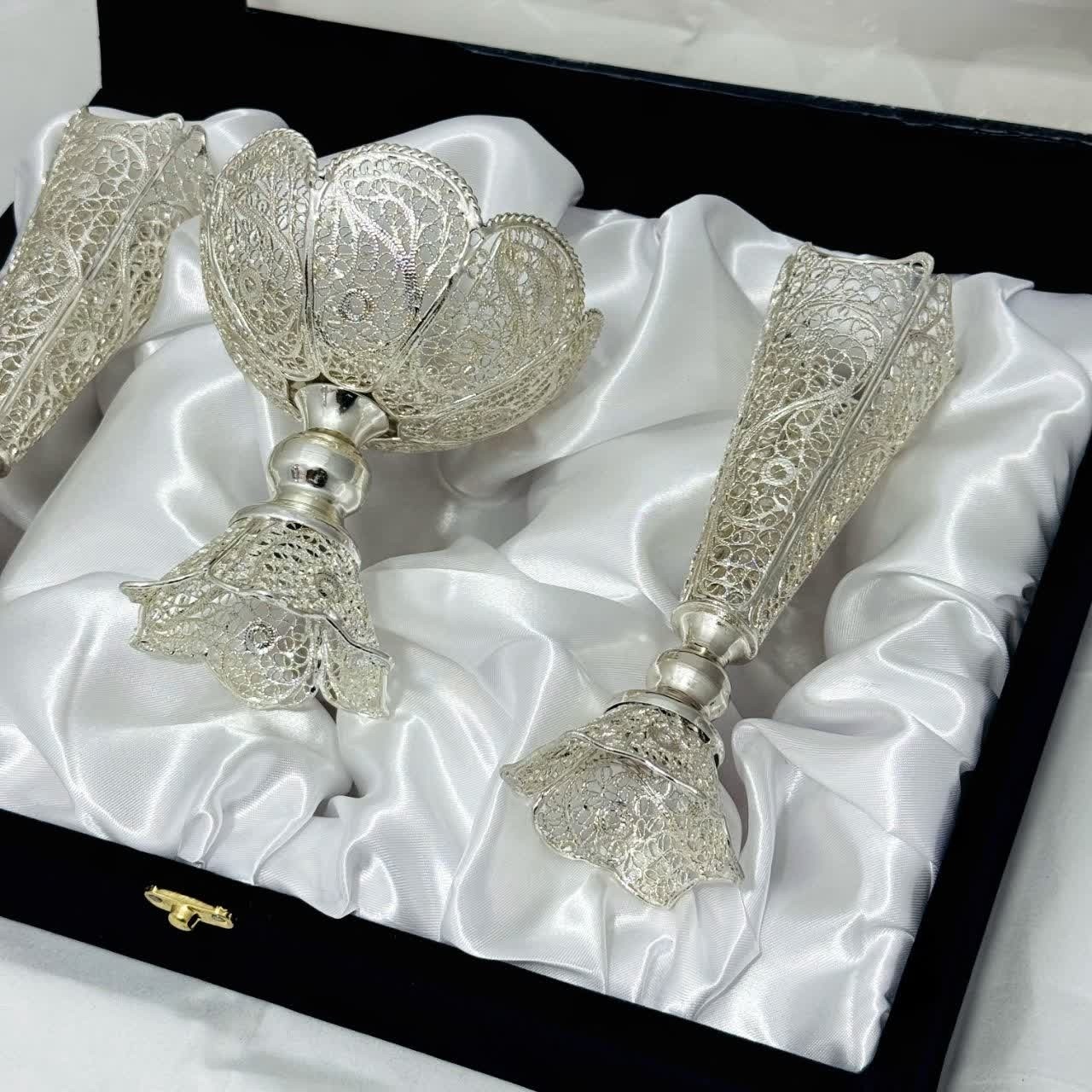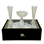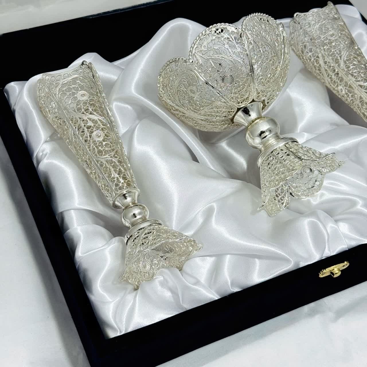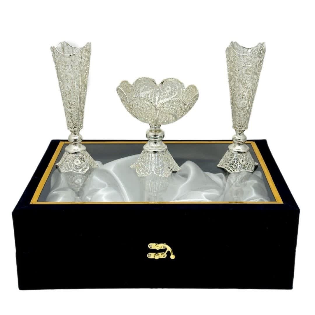 ست هدیه ظروف نقره ملیله کاری شکلات خوری و گلدان تنه خمری