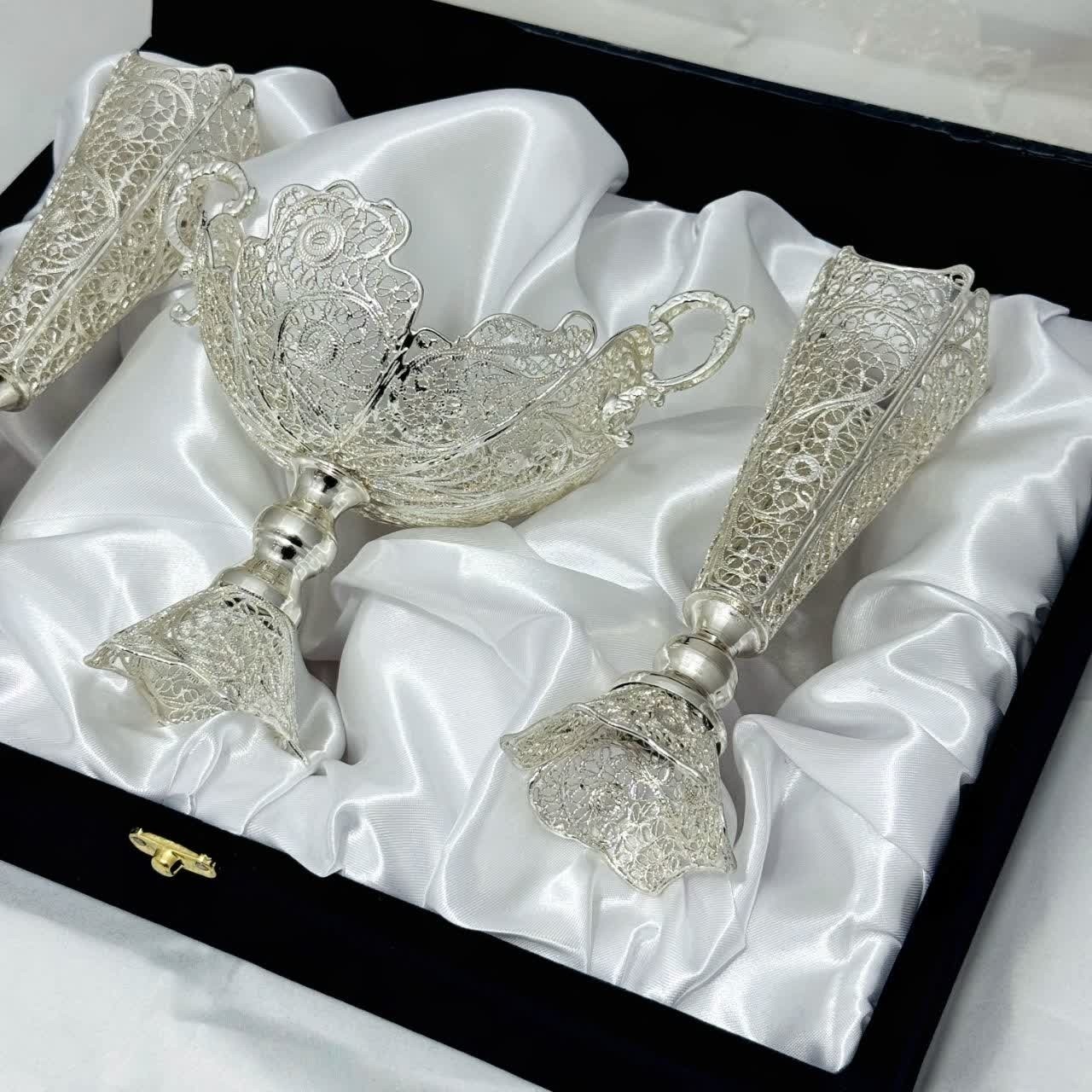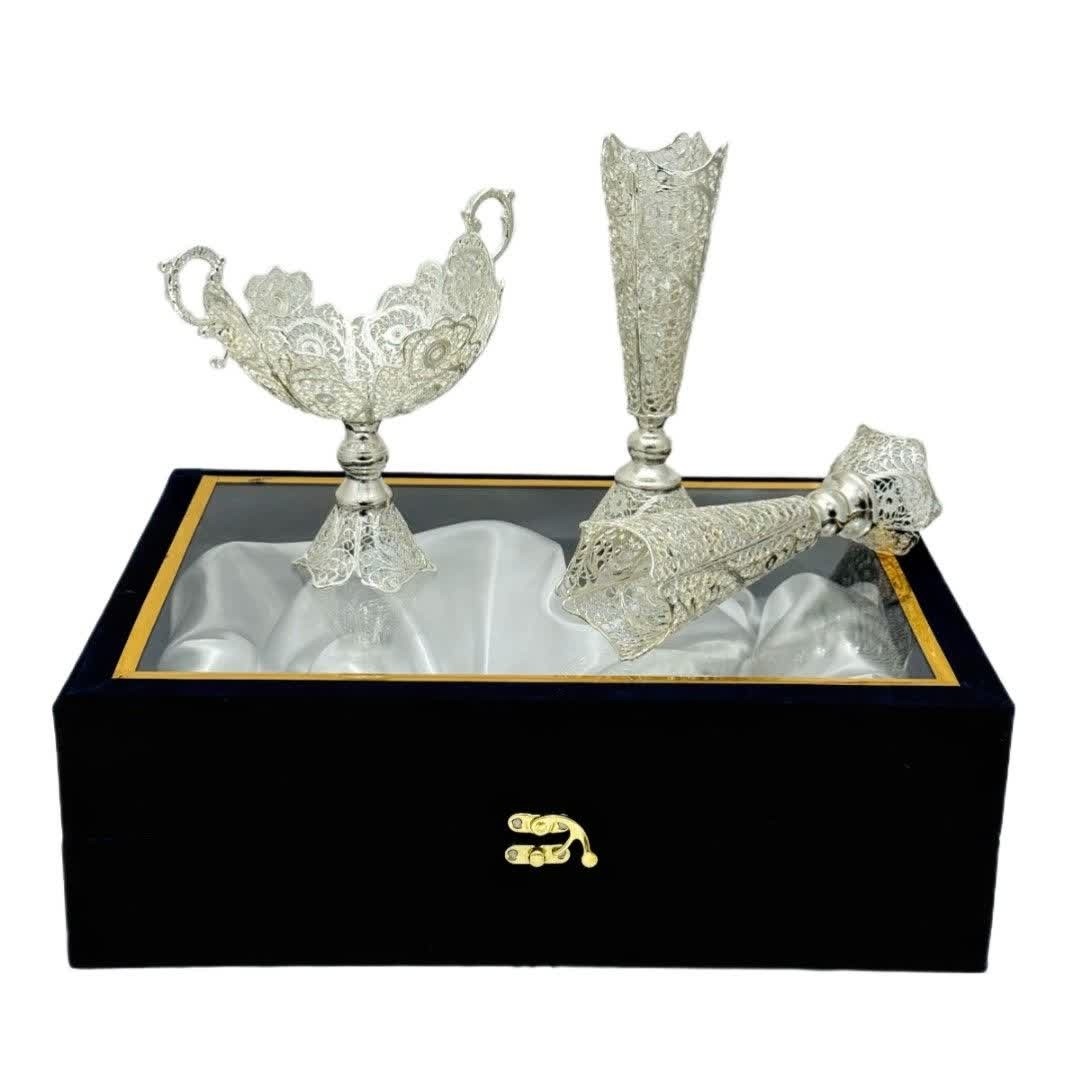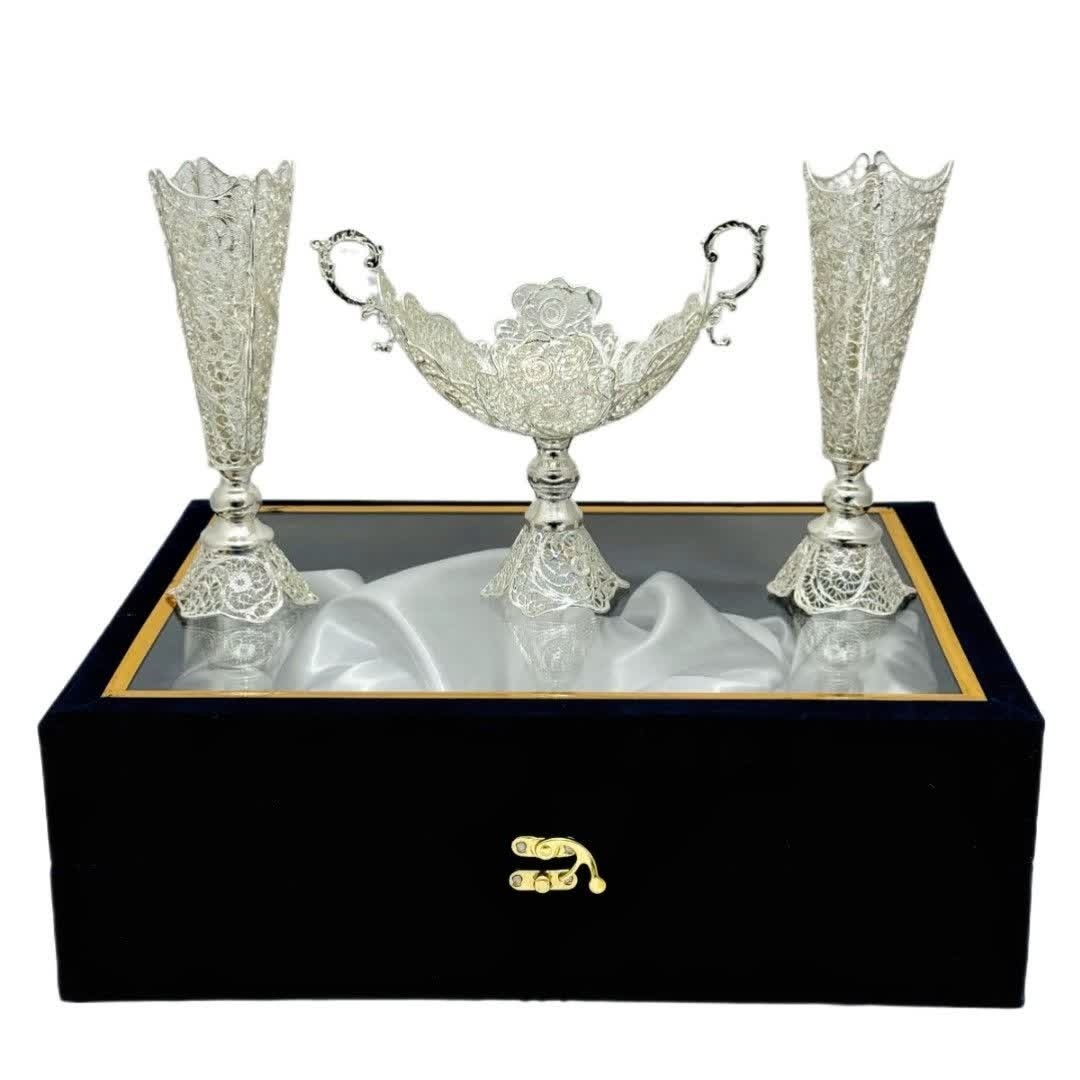 ست هدیه ظروف نقره ملیله کاری کشکول گرد و گلدان تنه خمری