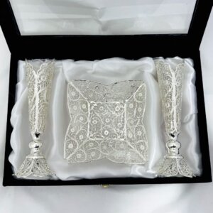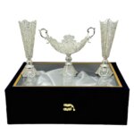 خانه / صنایع چرم / ست هدیه ظروف نقره ملیله کاری کشکول گرد و گلدان تنه خمری