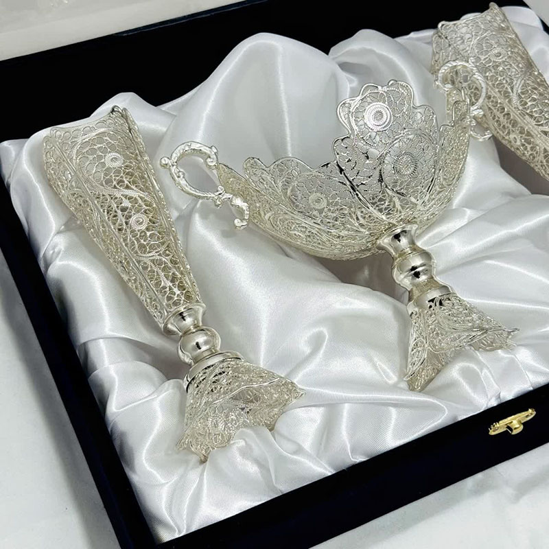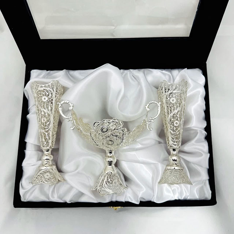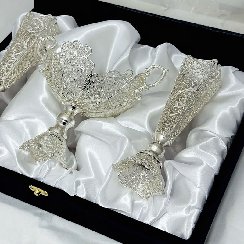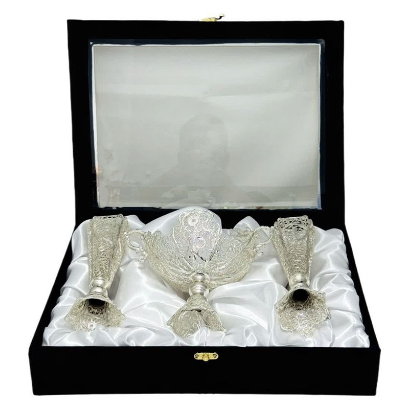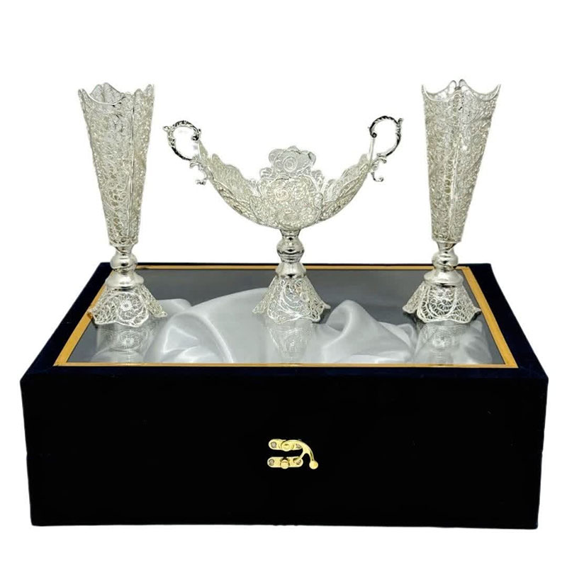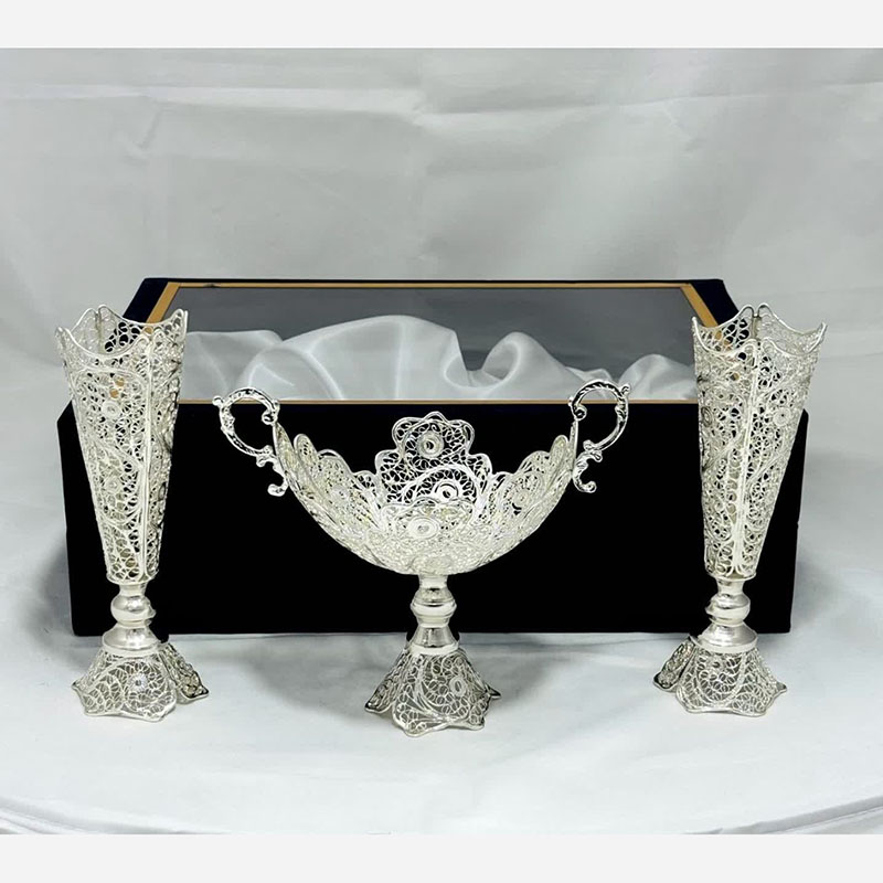 با انتخاب ست هدیه ظروف نقره ملیله کاری کشکول گرد و گلدان تنه خمری، ترکیبی از هنر، اصالت و کارایی را در اختیار خواهید داشت.