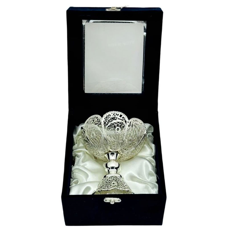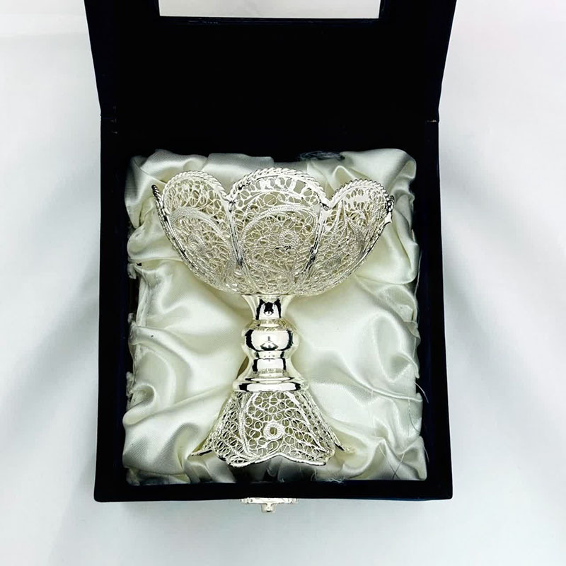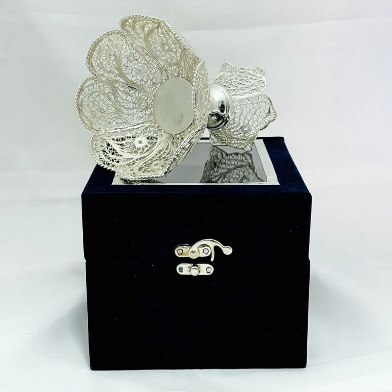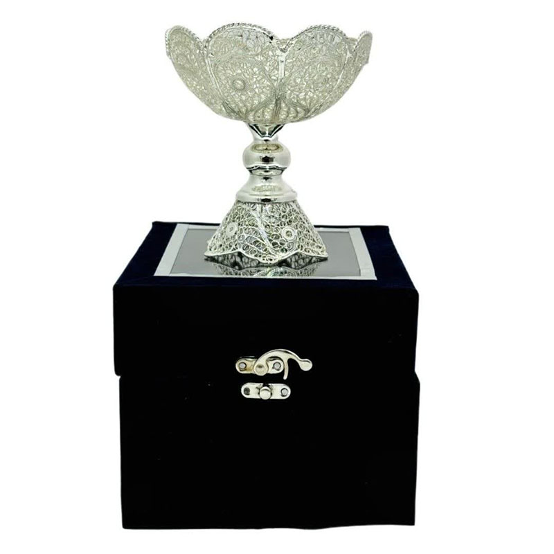 ملیله‌کاری، هنر ظریف و زیبای ساخت اشیاء تزئینی از مفتول‌های نازک مس با روکش نقره است که ریشه در تاریخ و فرهنگ اصفهان دارد. محصولات ملیله‌کاری با طرح‌های پیچیده و چشم‌نواز، جلوه‌ای خاص به دکوراسیون منزل می‌بخشند و می‌توانند به عنوان هدیه‌ای ارزشمند مورد استفاده قرار گیرند. کیفیت ملیله‌کاری تولیدی بُته چی به دلیل استفاده از مواد اولیه مرغوب و دقت بالای هنرمندان، از کیفیت بالایی برخوردار است و می‌تواند سال‌ها زیبایی خود را حفظ کند. ساخت ظروف ملیله‌کاری نیاز به مهارت و دقت بالایی دارد. در ابتدا، فلز مورد استفاده برای ساخت ظروف ملیله کاری به رشته‌های نازک و بسیار دقیق تبدیل می‌شود. سپس این رشته‌ها با دستان هنرمند به اشکال پیچیده و ظریف بافته می‌شوند. این رشته‌های فلزی پس از بافتن، به شکل یک ظرف با جزئیات دقیق و ظریف درمی‌آیند که اغلب با الگوهای گل و گیاه یا طرح‌های هندسی زینت داده می‌شوند. برای تکمیل کار، معمولاً این ظروف با استفاده از سنگ‌های قیمتی یا جواهرات دیگر تزئین می‌شوند تا جلوه‌ای خاص و نفیس پیدا کنند. با خرید ظروف ملیله کاری اصفهان، شما نه تنها یک شیء زیبا و دکوری را به خانه خود اضافه می‌کنید، بلکه از هنر و هنرمندان ایرانی نیز حمایت می‌کنید. به علت دست ساز بودن تمامی محصولات امکان اختلاف سایز اندکی وجود دارد.