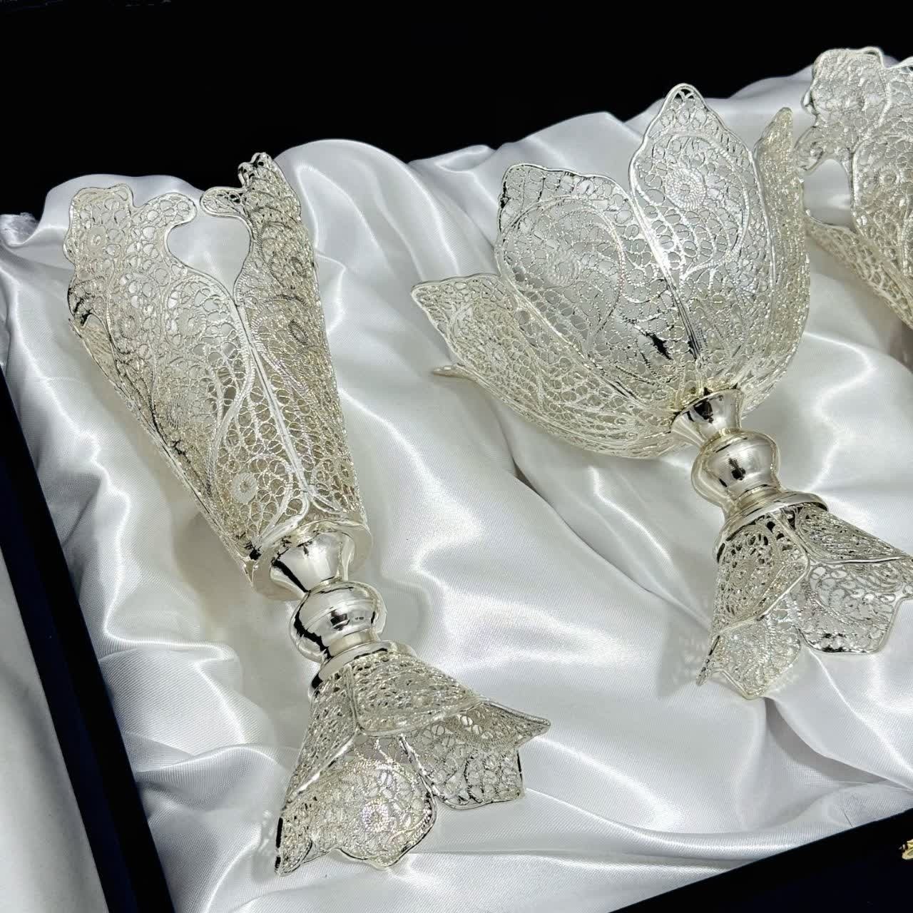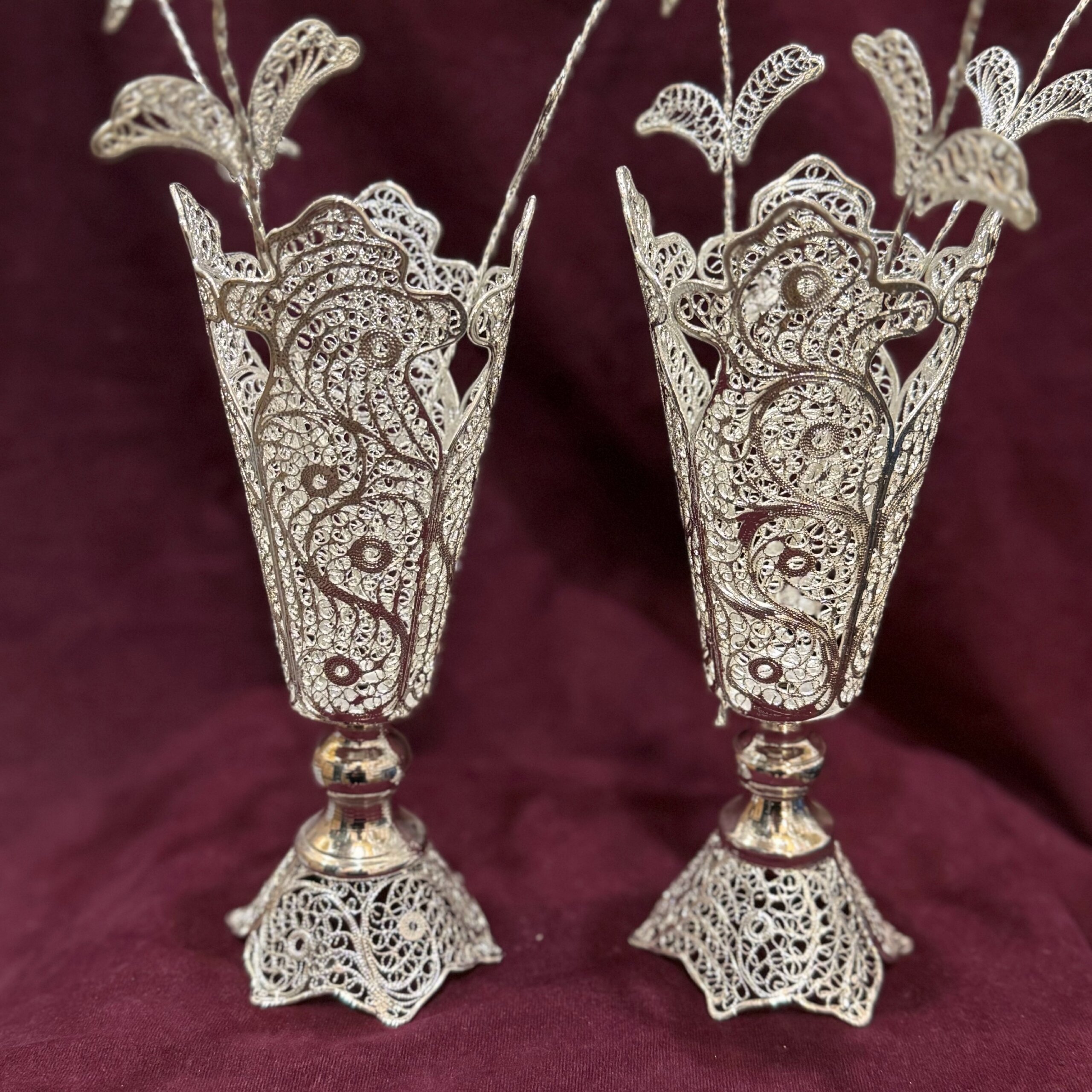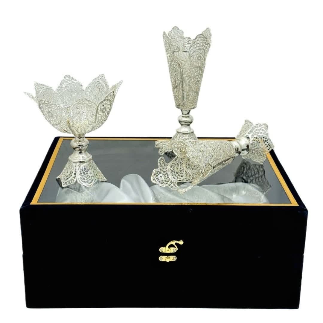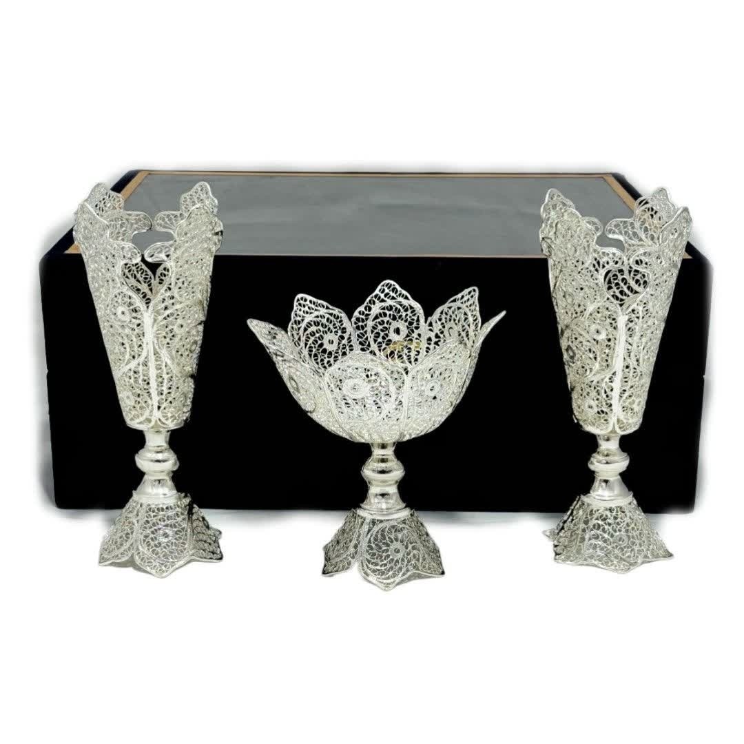نکته : قیمت برای دو گلدان و اجیل خوری و جعبه مخمل دست ساز میباشد. ملیلهکاری، هنر ظریف و زیبای ساخت اشیاء تزئینی از مفتولهای نازک مس با روکش نقره است که ریشه در تاریخ و فرهنگ اصفهان دارد. محصولات ملیلهکاری با طرحهای پیچیده و چشمنواز، جلوهای خاص به دکوراسیون منزل میبخشند و میتوانند به عنوان هدیهای ارزشمند مورد استفاده قرار گیرند. کیفیت ملیلهکاری تولیدی بُته چی به دلیل استفاده از مواد اولیه مرغوب و دقت بالای هنرمندان، از کیفیت بالایی برخوردار است و میتواند سالها زیبایی خود را حفظ کند. با خرید گلدان ملیله کاری اصفهان، شما نه تنها یک شیء زیبا و دکوری را به خانه خود اضافه میکنید، بلکه از هنر و هنرمندان ایرانی نیز حمایت میکنید. به علت دست ساز بودن تمامی محصولات امکان اختلاف سایز اندکی وجود دارد.