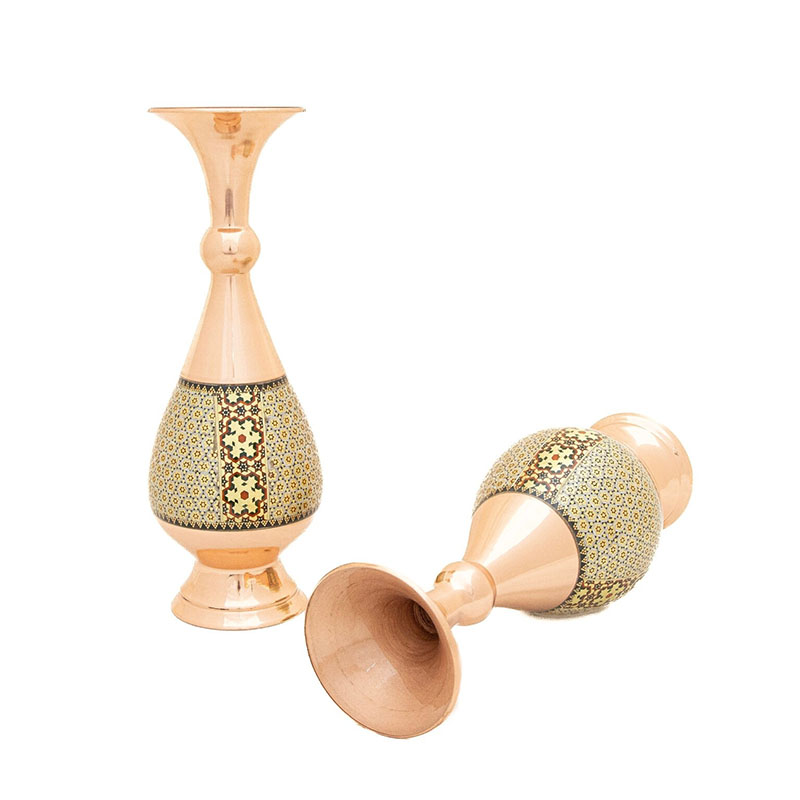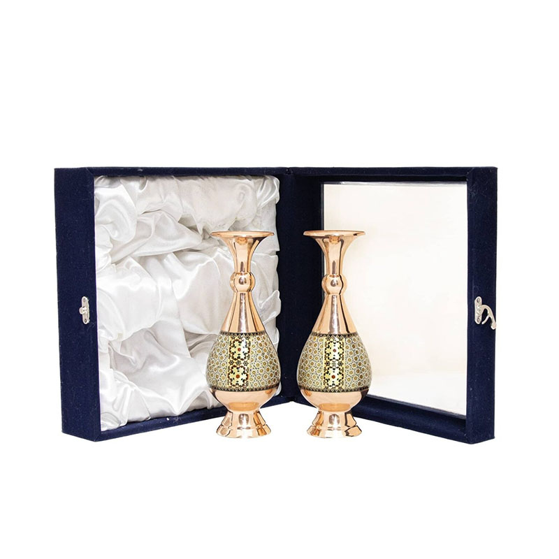 جنس ظروف مس و خاتم از فلز مس بوده که بر روی آن خاتم اصل اصفهان چسبانده شده است. استفاده از خاتم اعلا و متریال باکیفیت باعث افزایش طول عمر و ماندگاری فوق العاده در ظروف مس و خاتم شده است. سایز بندی ظروف مس و خاتم به شما امکان استفاده آنها را در چیدمان های مختلف خواهد داد. ظروف مس و خاتم برای زیباسازی فضاهای دکوری در نظر گرفته می شود. از این رو می تواند با دیگر محصولات دکوری ست گردد. محصولات مس و خاتم اصفهان از محصولات هنری صنایع دستی نفیس ایرانی بشمار می رود. فلز مس مورد استفاده در این محصولات ضخامت بالا و مناسبی دارد و به شکل نهایی محصول جلوه خاصی بخشیده است. این محصول دارای لایهای محافظ با پلیاستر است که علاوه بر پوششدهی مناسب سطح مس و جلوگیری از اکسید و سیاه شدن، مقاومت آن را نیز بالا برده است. بسیاری از شرکت ها و سازمان ها بمنظور تهیه هدایای تبلیغاتی سالیانه خود از محصولات مس و خاتم اصفهان استفاده می کنند. قبل از سفارش طرح مورد نظرتون رو استعلام بگیرید و با اطمینان خرید کنید.