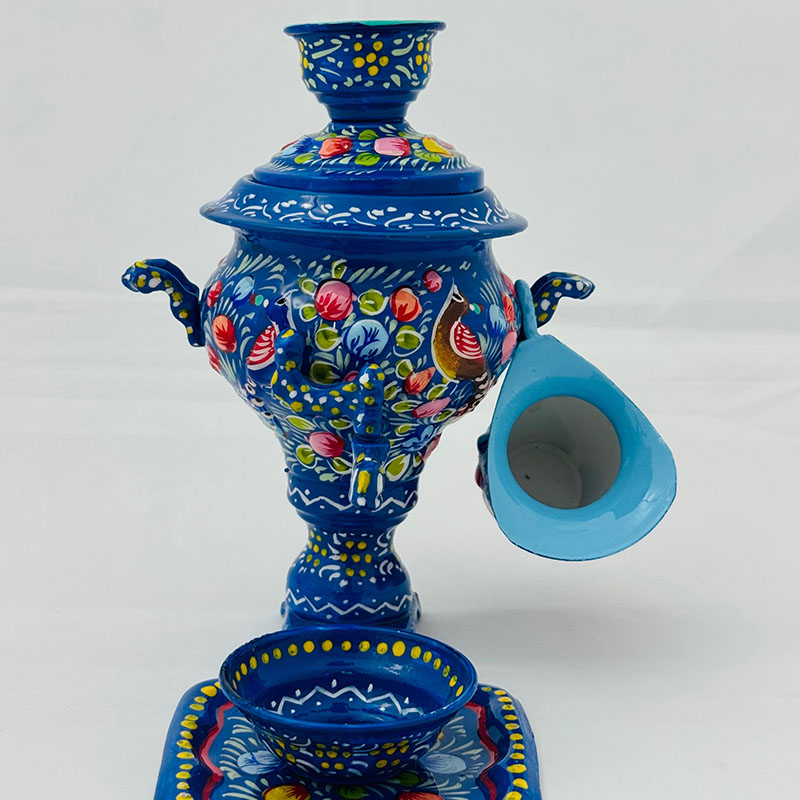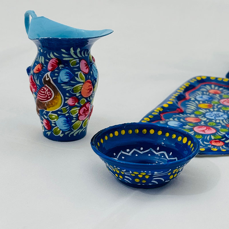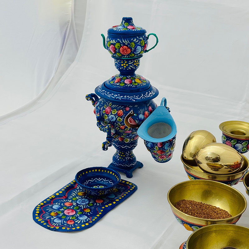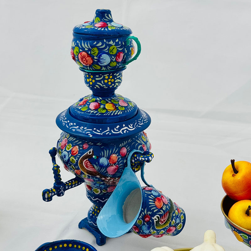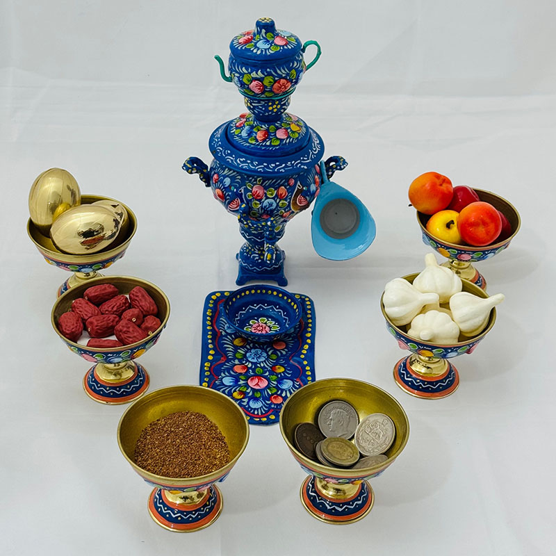 این ست هفت سین شامل 6 عددکاسه پایه دار کوچک و یک عدد آینه گل بلبل است. اندازه کاسه های پایه دار کوچک شش تایی : قطر دهانه 6/5سانتیمتر و ارتفاع 6 سانتیمتر ، سرویس سماور نقلی با ارتفاع 23 سانتی متر است ، هفت سین میناکاری را می توان از سری محصولات کاربردی , زینتی صنایع دستی مینیاتوری دانست.