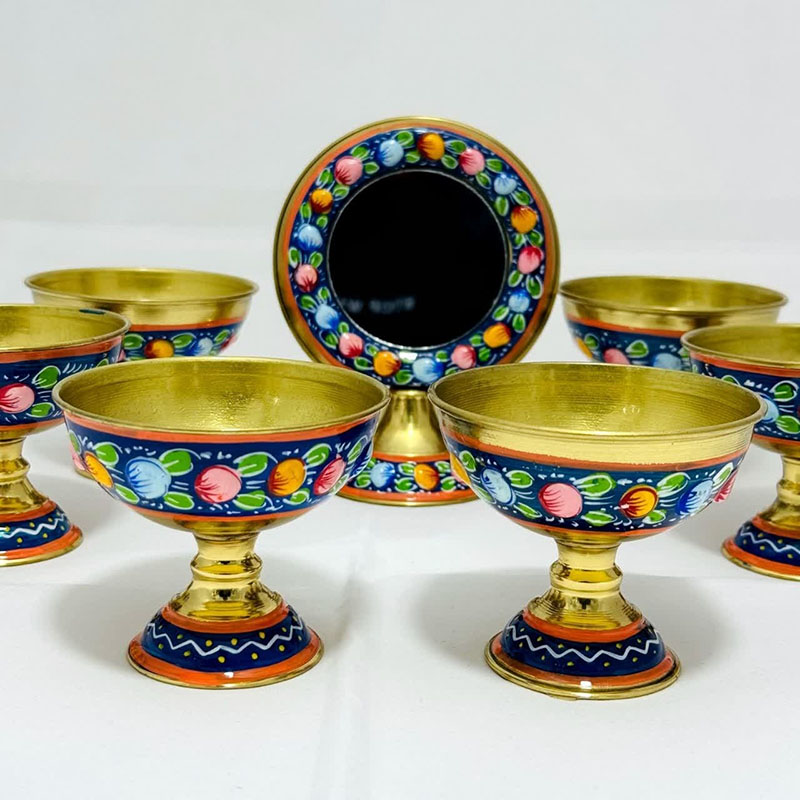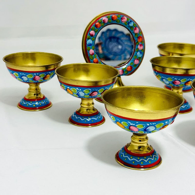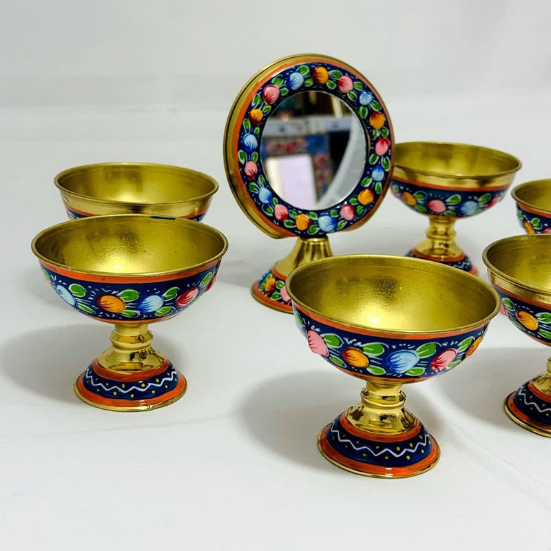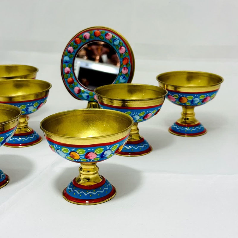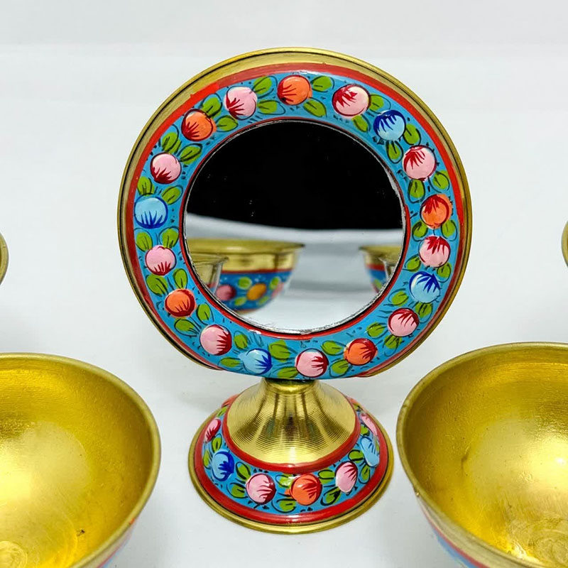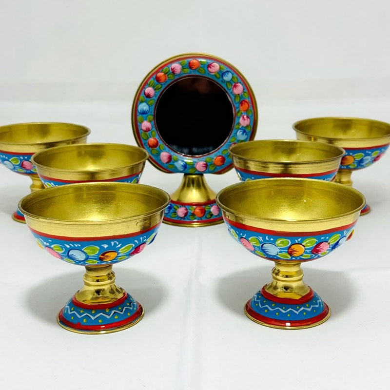 این ست هفت سین شامل 6 عددکاسه پایه دار کوچک و یک عدد آینه گل بلبل است. اندازه کاسه های پایه دار کوچک شش تایی : قطر دهانه 6/5سانتیمتر و ارتفاع 6 سانتیمتر ، آینه 17 سانتی متر و است ، هفت سین میناکاری را می توان از سری محصولات کاربردی , زینتی صنایع دستی مینیاتوری دانست.