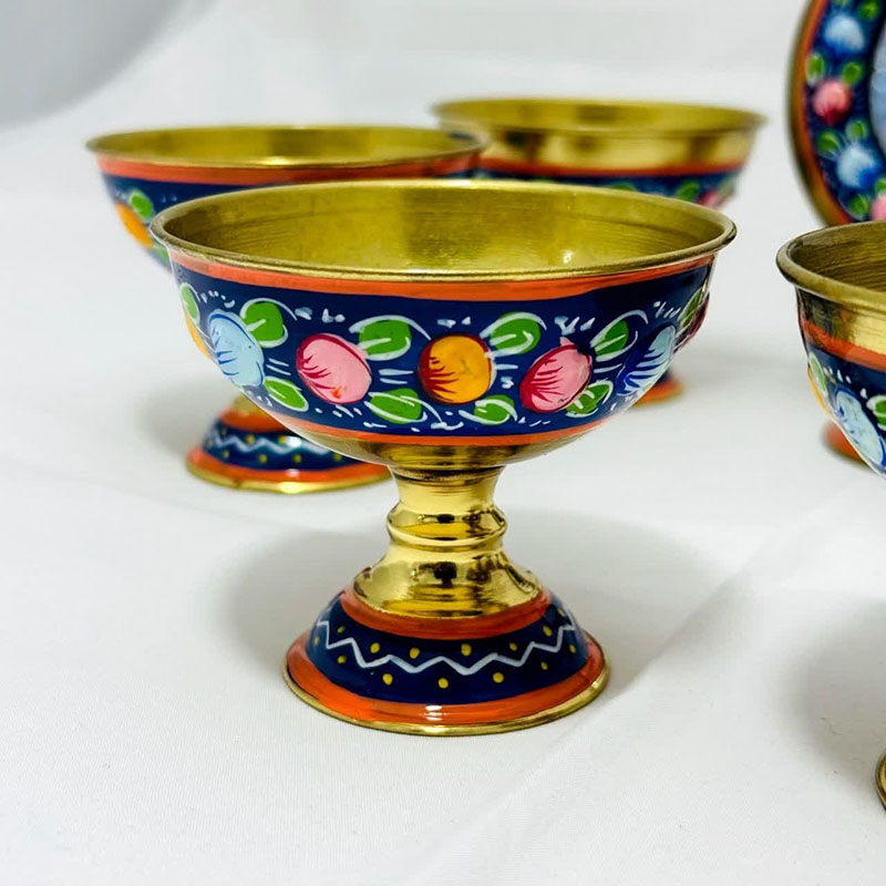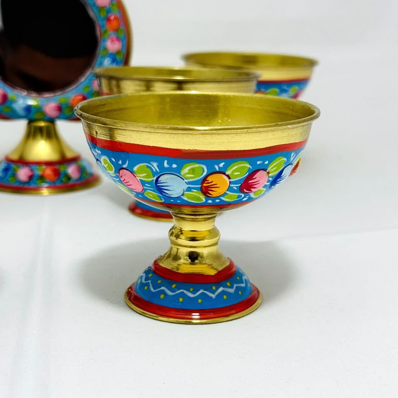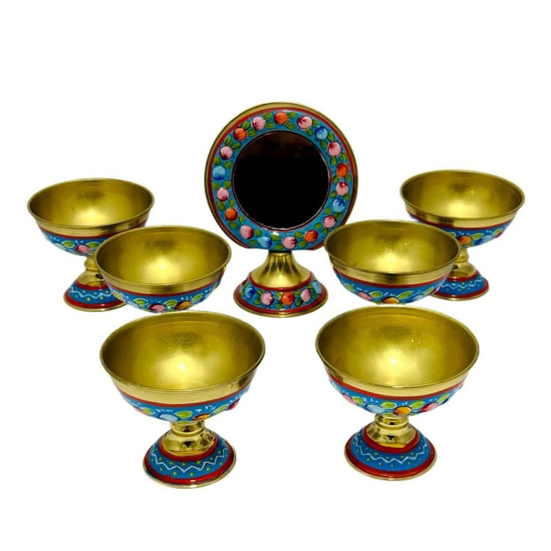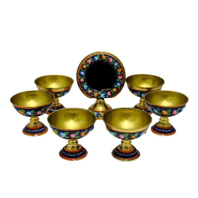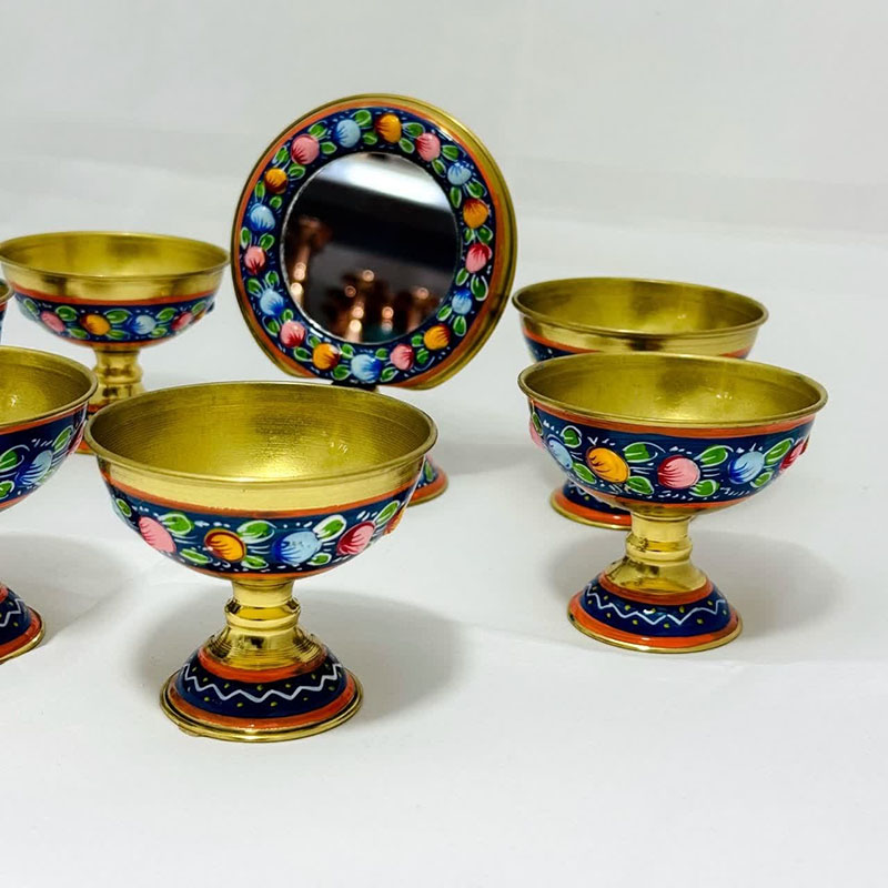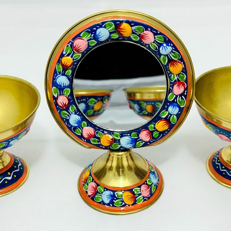این ست هفت سین شامل 6 عددکاسه پایه دار کوچک و یک عدد آینه گل بلبل است. اندازه کاسه های پایه دار کوچک شش تایی : قطر دهانه 6/5سانتیمتر و ارتفاع 6 سانتیمتر ، آینه 17 سانتی متر و است ، هفت سین میناکاری را می توان از سری محصولات کاربردی , زینتی صنایع دستی مینیاتوری دانست.