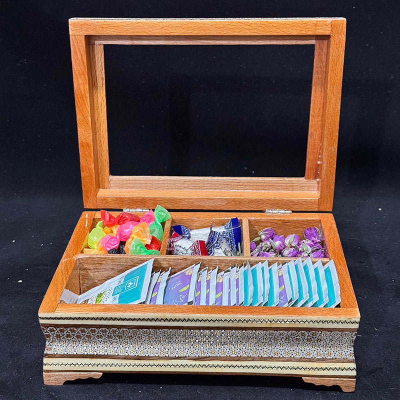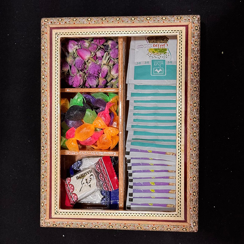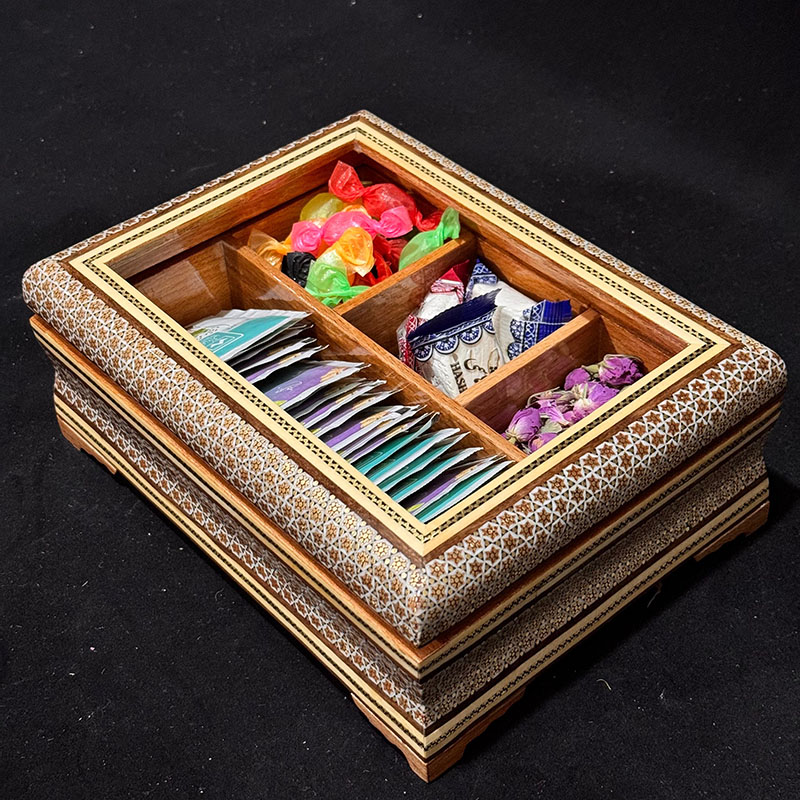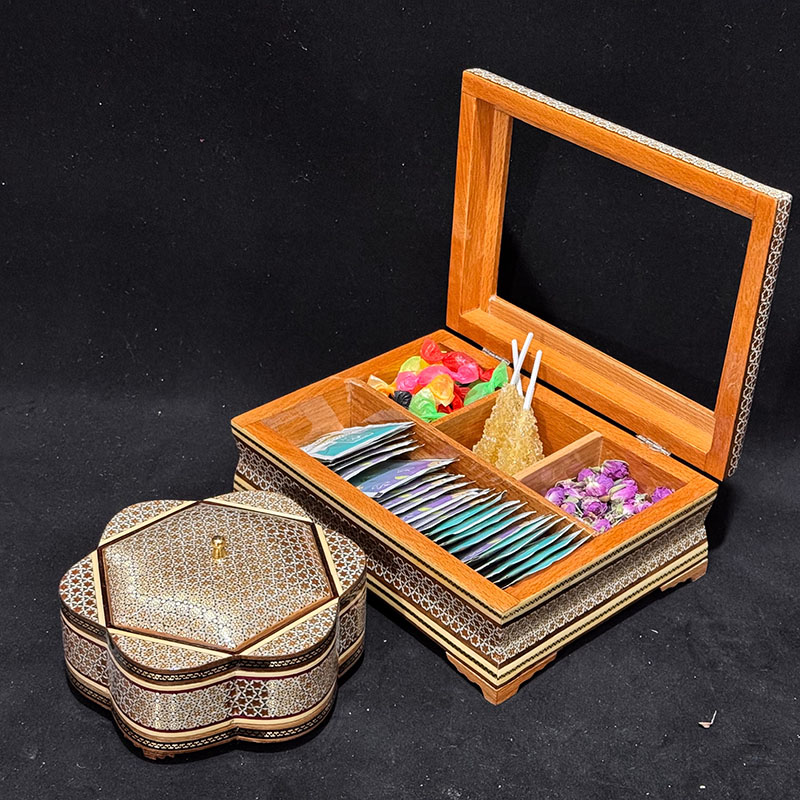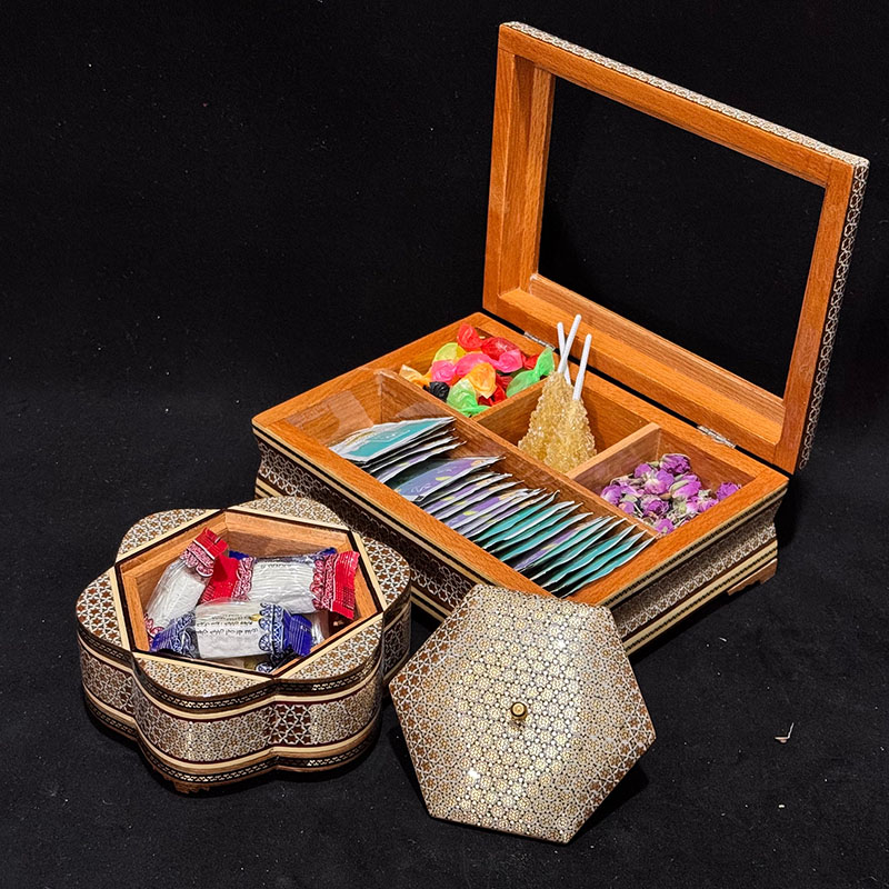 این ست شامل جعبه دمنوش 22در30 سانتی و یک عدد شکلات خوری قطر 19 سانتی است. لازم است توجه شود که کلیهٔ محصولات خاتمکاری شده بایستی دور از حرارت، رطوبت و نور مستقیم خورشید نگهداری و از تمیز کردن آنها با پارچهٔ مرطوب و از به کار بردن هر گونه جلاسنج بر روی سطوح خاتم اجتناب شود.