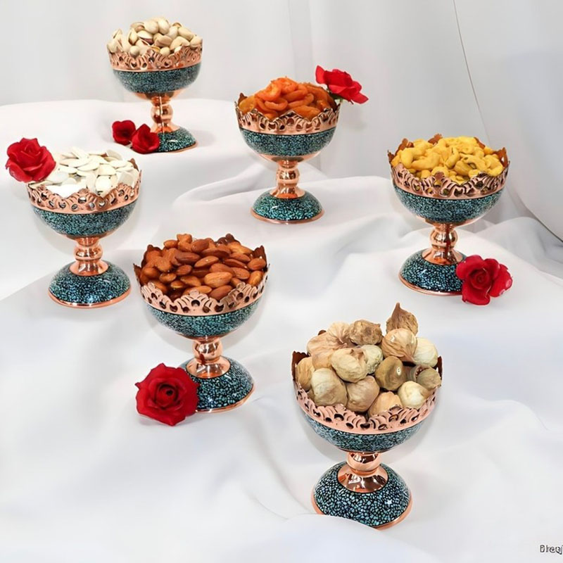 داخل کاسه و لبه های کاسه توسط بهترین استاد، قلم زنی و شبکه بری شده است. شامل 6 عدد کاسه پایه دار 14 سانتی با دهنه 12 جنس بدنه تماما مسی هست که در بعضی از قسمت های ظرف با سنگ فیروزه نیشابور فیروزه کوبی شده است. تکه های سنگ بکار رفته در این محصول فیروزه اصل نیشابور و از نوع مرغوب هستند و همه تکه سنگ ها توسط دست جای گذاری شده اند. این ظروف دارای چندین لایه پلی استر می باشند که باعث محافظت از مس و فیروزه می شود و از تغییر رنگ مس و فیروزه جلوگیری می کند و باعث زیبایی و ماندگاری طولانی تر ظروف می شود. این ظروف تماما دست ساز و دارای حک استاد کار می باشند. صنایع دستی اصفهان و دارای شناسنامه هنری و کارت گارانتی 48 ماهه می باشند