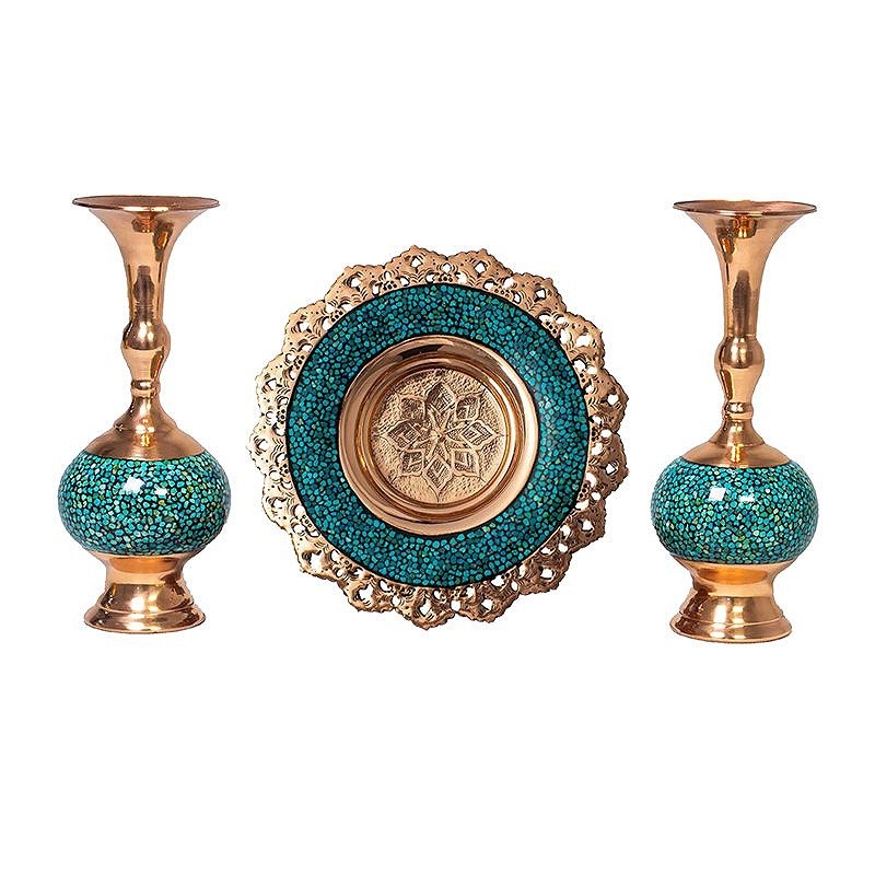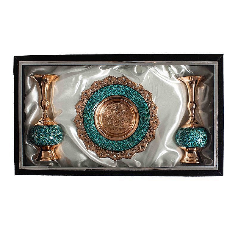 خانه / صنایع فلزی / مس و فیروزه کوبی / سایر محصولات فیروزه کوبی / ست گلدان و بشقاب فیروزه کوبی همراه با جعبه