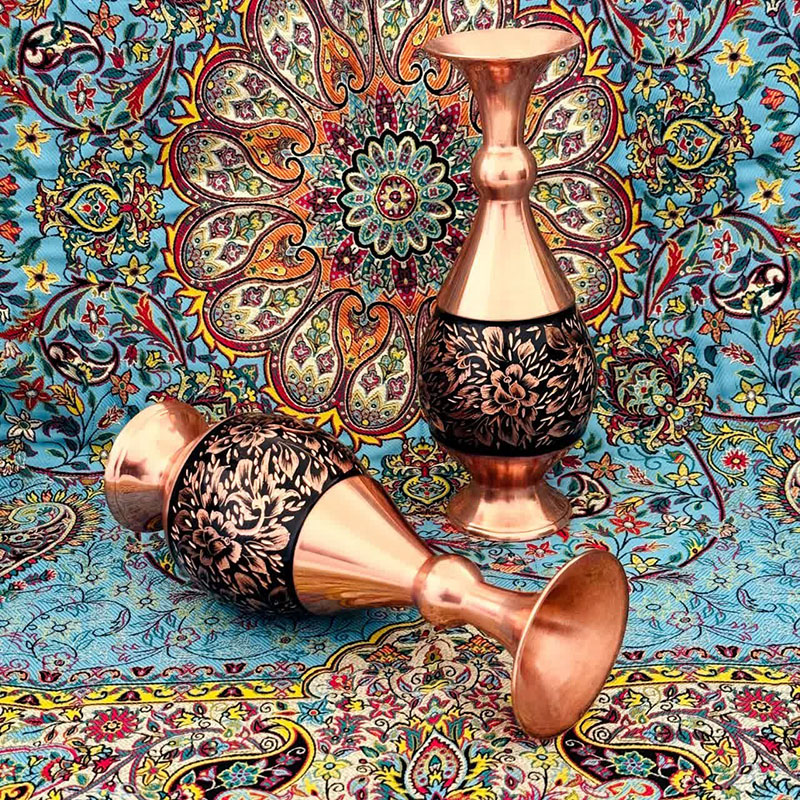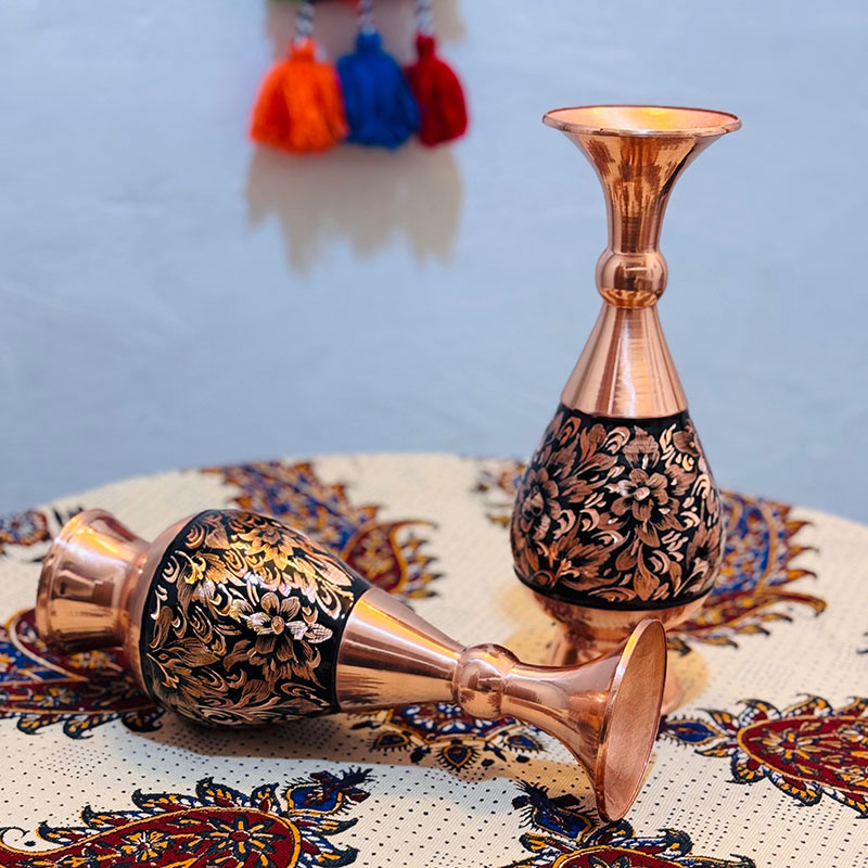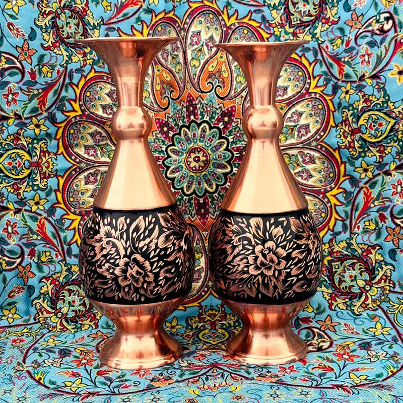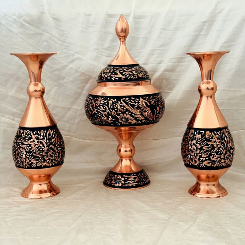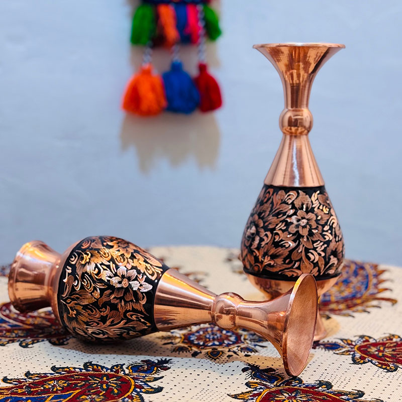 ست هدیه جفت گلدان الماس تراش مسی و شکلات خوری ، هدیه ای خاص برای دوس داران صنایع دستی اصفهان میباشد. جفت گلدان مسی الماس تراش طرح گل و مرغ ارتفاع گلدان 25 سانت ارائه شده است و ارتفاع شکلات خوری 32 سانت میباشد در سایز های متنوع هم موجود است.