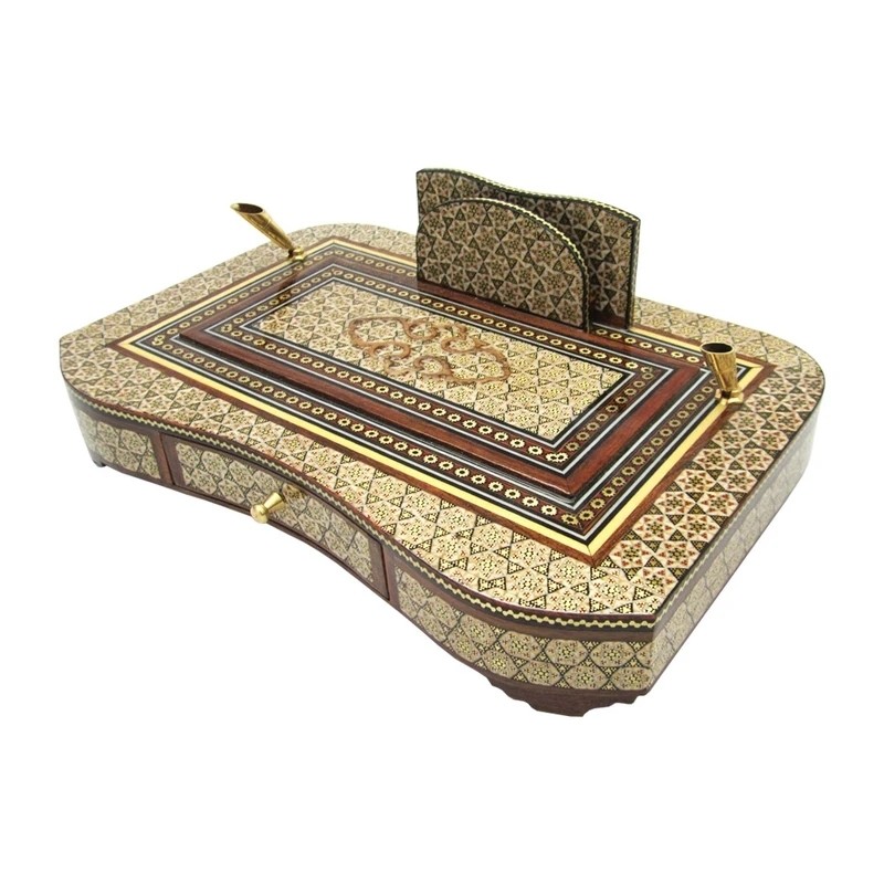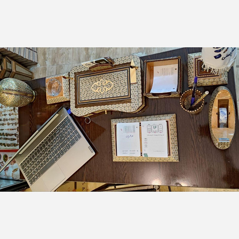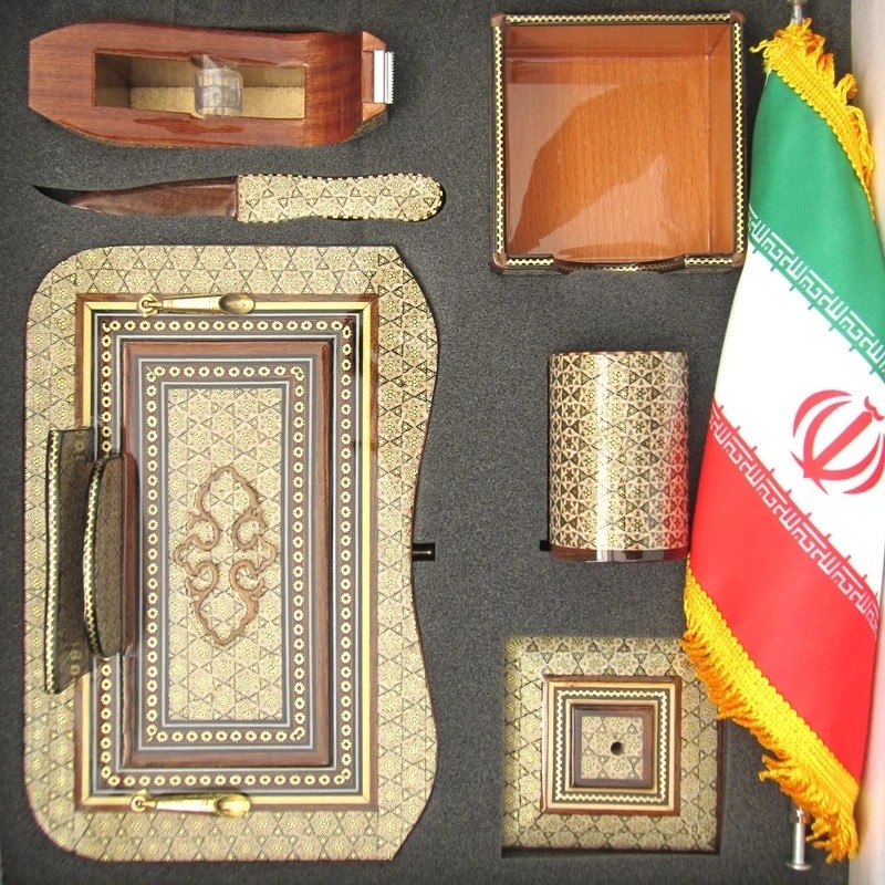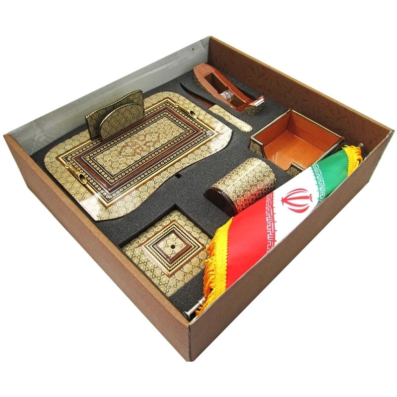 دارای 8 تکه شامل(پایه چسب +چاقو پاکت باز کن + جا قلمی لیوانی+ جا کاغذی+ جا قلمی کشو دار 20 در 30+جاتقویمی+پرچم ایران با پایه و جعبه مخمل)