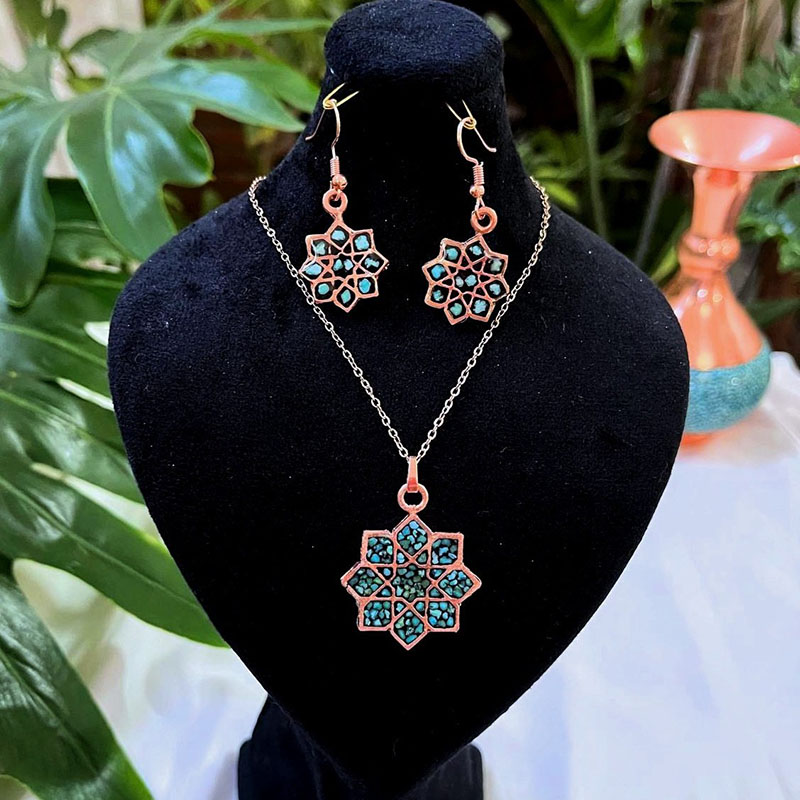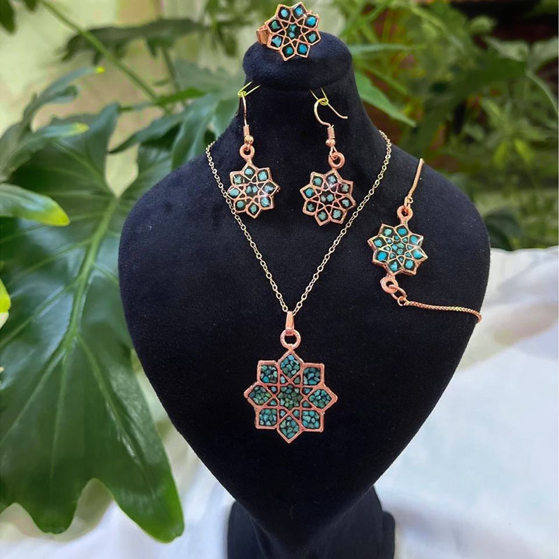 سرویس زیورآلات مسی فیروزه کوبی نمونهای از هنر اصیل ایرانی است که با ظرافت و دقت فراوان تولید شده است.