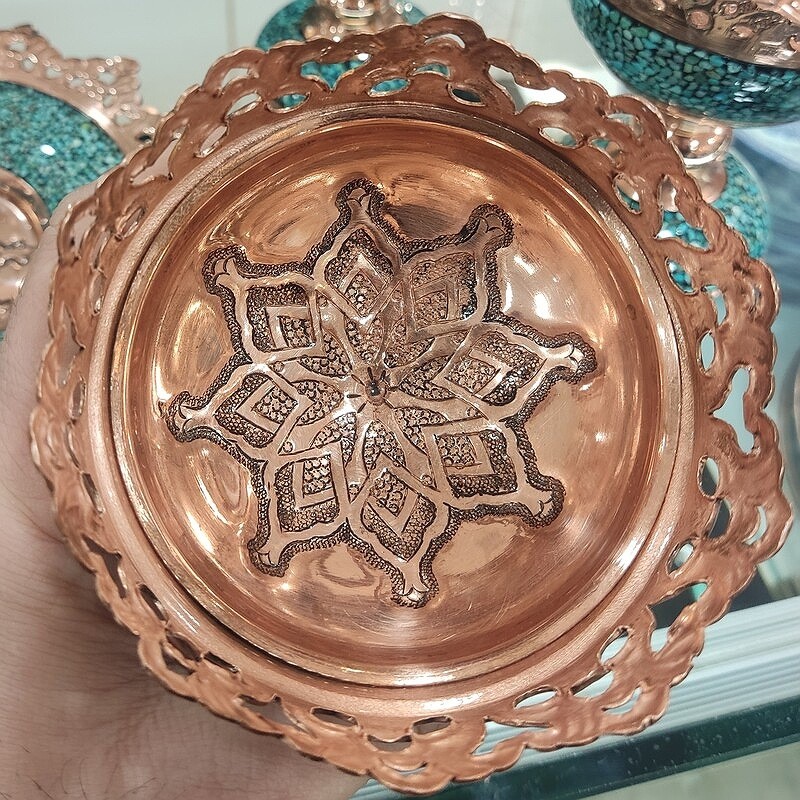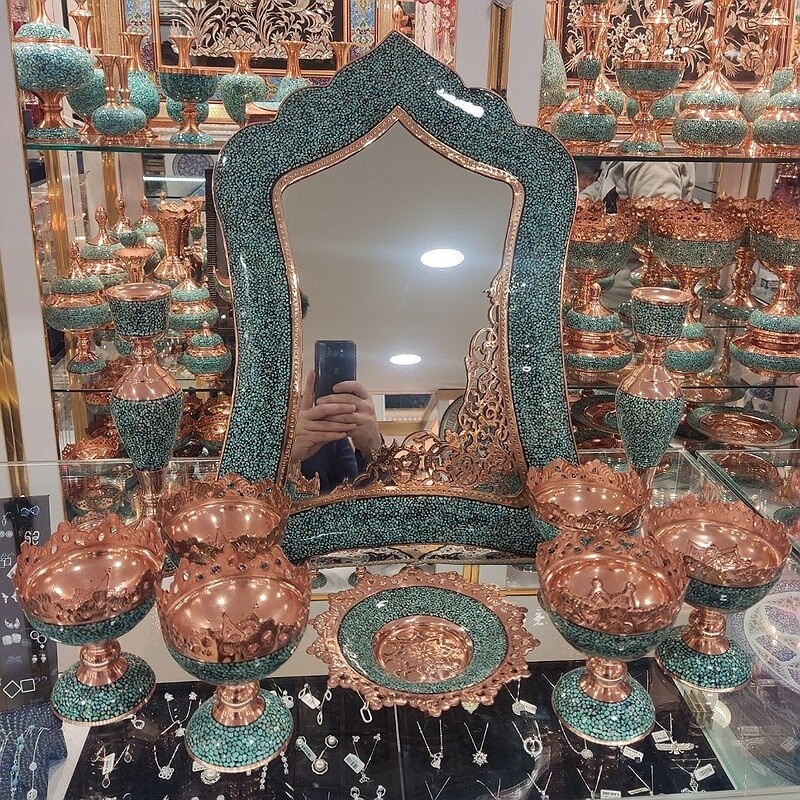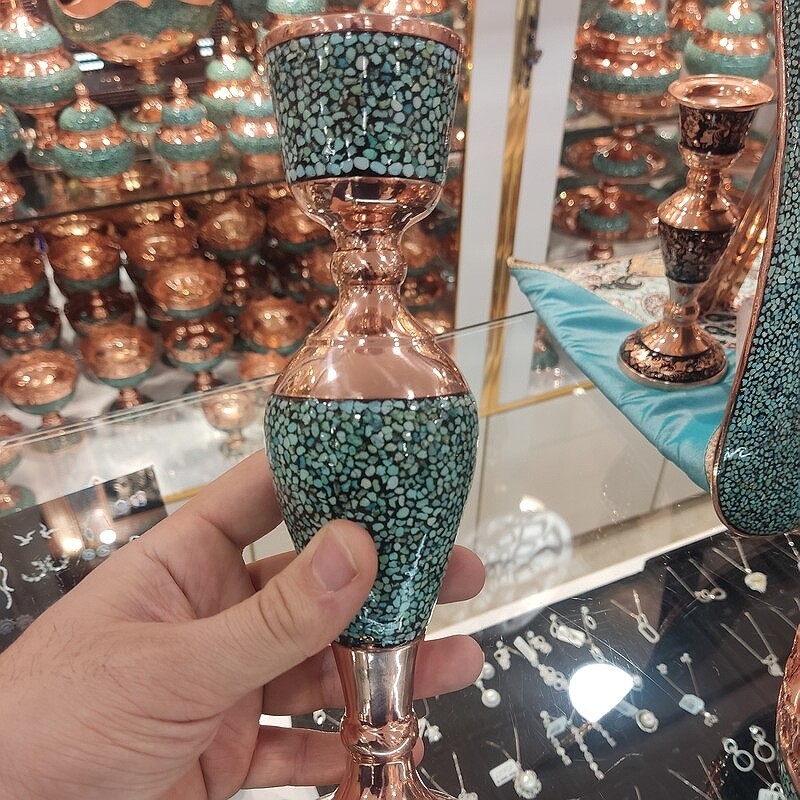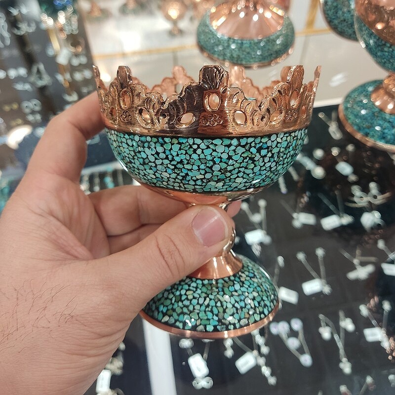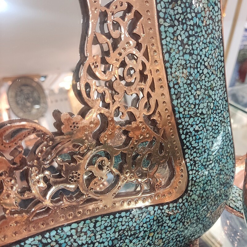 این کار نفیس فیروزه کوبی دارای پوششی از پلی استر است که علاوه بر پوششدهی مناسب سطح مس و جلوگیری از اکسید و سیاه شدن، مقاومت آن را نیز بالا برده است.از آنجاییکه پرداخت نهایی در تولید این کار ماهرانه و با دقت صورت گرفته،سطح مس و فیروزه براق، شفاف و درخشان است. فیروزه کوبی : فیروزه کوبی از صنایع دستی است و با نشاندن قطعه های کوچک سنگ فیروزه به حالت موزاییکی بر سطح ظرف ها ، زیورآلات و اشیای تزئینی ( از پایه هایی به جنس های مسی ، برنجی، نقره، ورشویی ویا برنزی) ساخته می شود . هر چه ظرف فیروزه کوبی شده پر کارتر و منظم تر باشد و فاصله کمتری بین قطعات فیروزه باشد ، ارزش هنری آن بیشتر است . امروزه اصفهان مرکزاین هنر است .