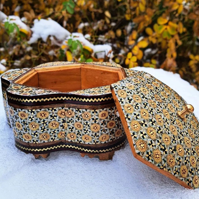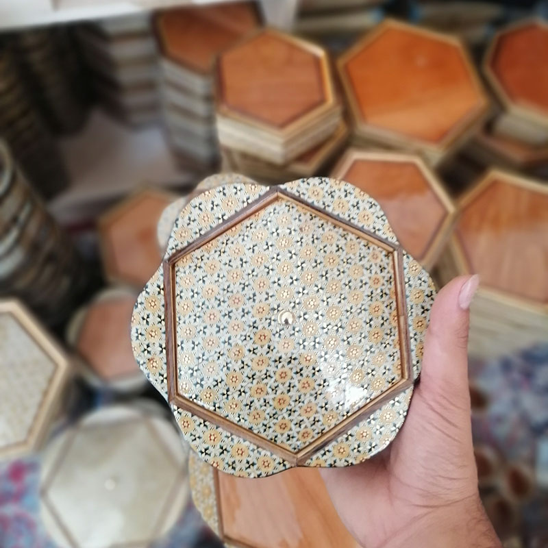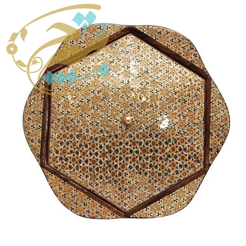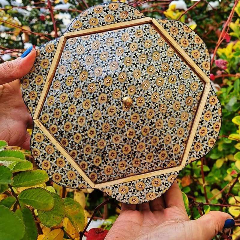 ⚜️شکلات خوری خاتم کاری گلی با ظرافت که توسط هنرمندان و استادکاران خاتم کار خوشذوق و سلیقهی اصفهانی طراحی و ساخته شده است. ⚜️قطر این محصول 19سانتیمتر و ارتفاع آن 8/5 سانتیمتر می باشد و وزنی برابر 400 گرم دارد. جنس شکلات خوری از چوب درخت اعلا و با نوع خاتم کاری با کیفیت مرغوب از جنس استخوان شتر و سیم های برنجی و مس است. ⚜️این محصول خاتم کاری شده به دلیل داشتن پوشش محافظ ( پلی استر اعلا) به هیچ عنوان سیاه نمی شود. ⚜️این اثر اصیل ایرانی، نه تنها میز پذیرایی خانهتان را زیبایی میبخشد، بلکه با فضاهای مجزایی که دارد به سرعت به عنوان یک محصول کاربردی جای خود را در فضای خانهتان پیدا میکند. ⚜️این محصول با داشتن خصوصیاتی از قبیل صاف بودن سطح کار و خالی نبودن هیچ جای خاتم، یکنواخت بودن رنگ و مصالح به کار رفته در ساخت خاتم، عدم تغییر در رنگ و شکل، ترمیمکاریها و بتونهکاریها در سطح کار مشخص نمی باشد، قرینه بودن تمامی گلها و اشکال در سطح کار و زوایا و اضلاع با اندازه ای بسیار ریز، دقیق و مهندسی بودن اساس و ساختمان طرح که تمامی ابعاد با هم همسان، قرینه و یک اندازه می باشد کیفیت و ارزش هنری و مادی بالای محصولات را نشان می دهد. ⚜️لازم است توجه شود که کلیهٔ محصولات خاتمکاری شده بایستی دور از حرارت، رطوبت و نور مستقیم خورشید نگهداری و از تمیز کردن آنها با پارچهٔ مرطوب و از به کار بردن هر گونه جلاسنج بر روی سطوح خاتم اجتناب شود.