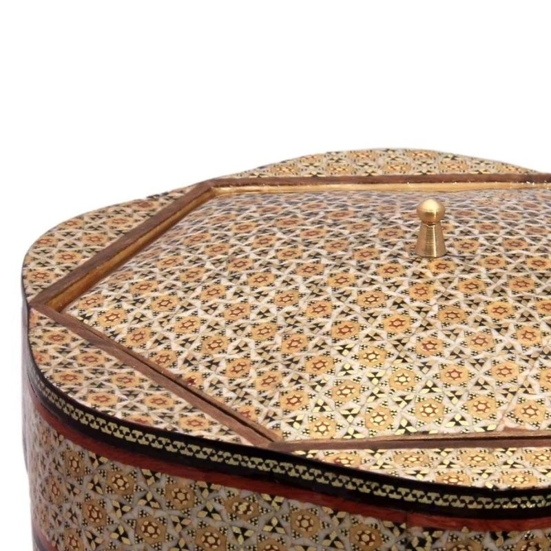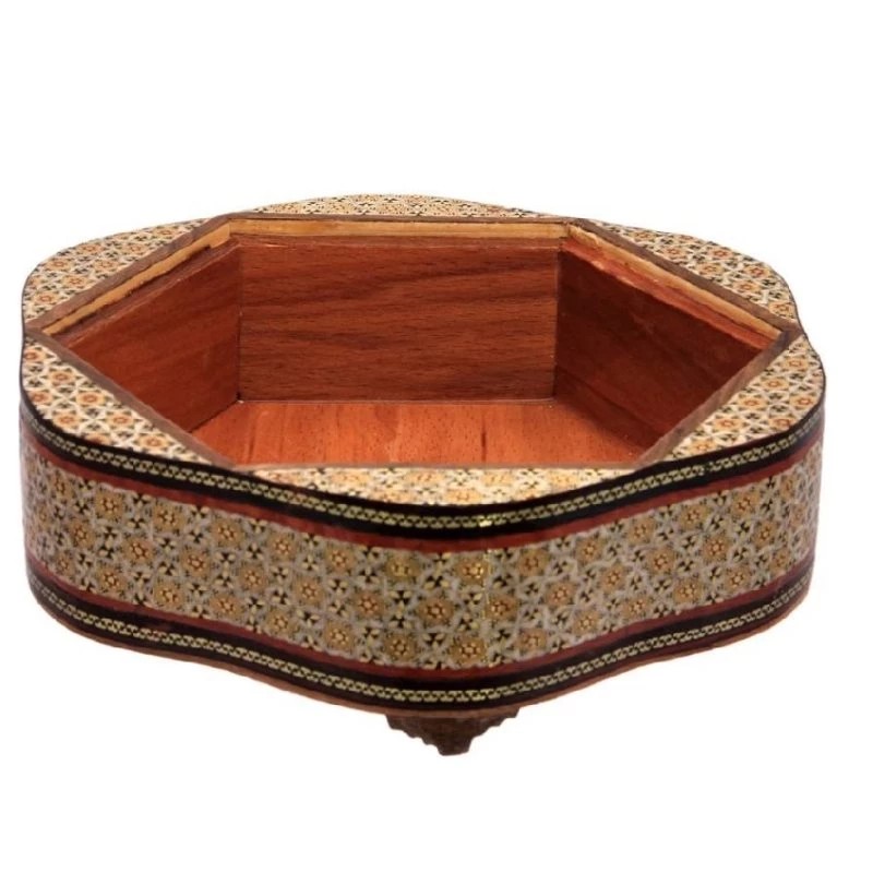 ابعاد این شکلات خوری 19در19 سانتی متر میباشد. شکلات خوری خاتم کاری شیشی محصولی شیک و مخصوص خاص پسندان که میتواند نظر دوست داران هنر را هم به خود جلب کند. جنس بدنه از چوب است که با هنر خاتم کاری زینت داده شده و نمای داخل شکلات خوری از چوب راش می باشد. کاربرد آن در پذیرایی از مهمان هاست و طراحی آن به گونه ای است که به تنهایی به عنوان یک ظرف تزیینی و ارزشمند می تواند روی میز و دکور زیبای شما قرار داده شود. برای علاقمندان به سبک های سنتی و اصیل این شکلات خوری یک هدیه ارزشمند و کاربردی است.
